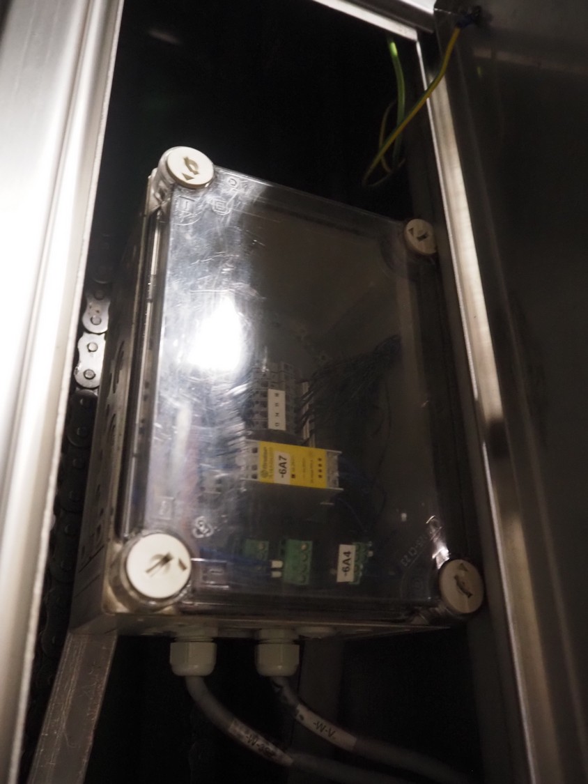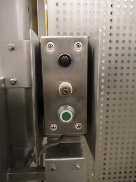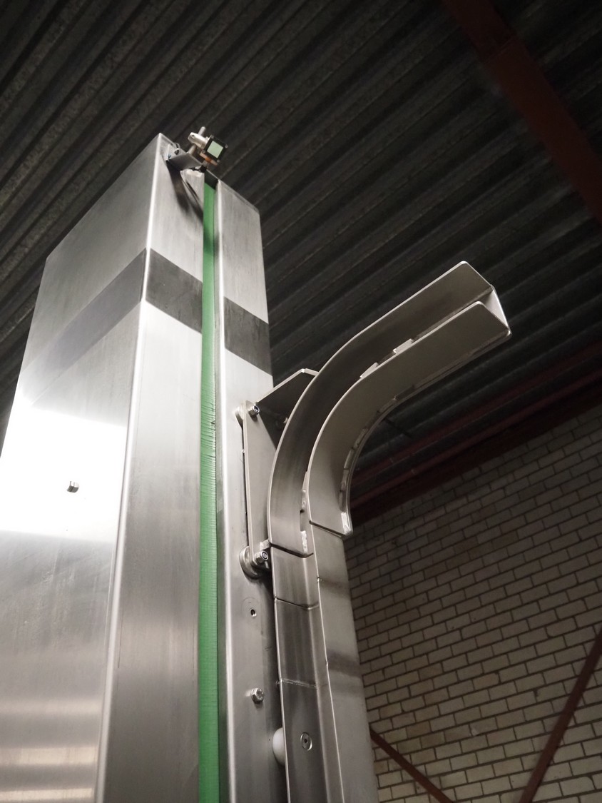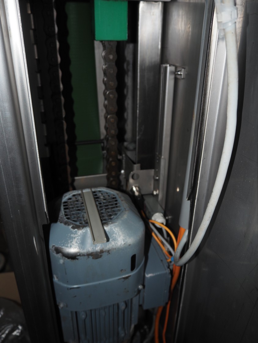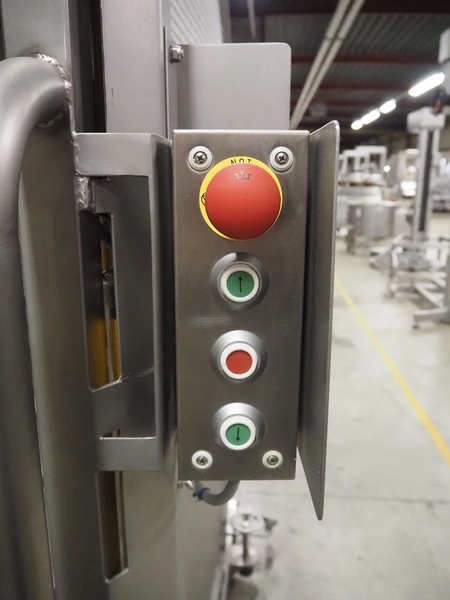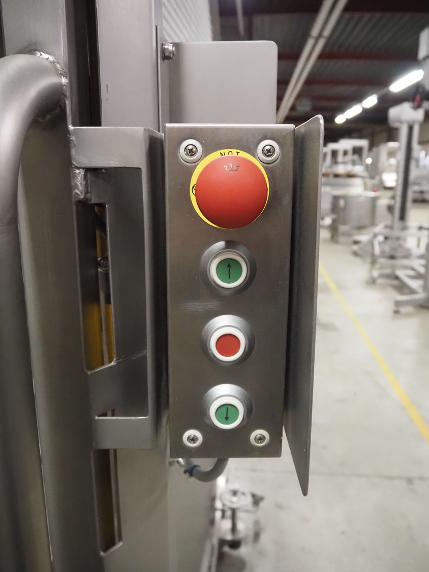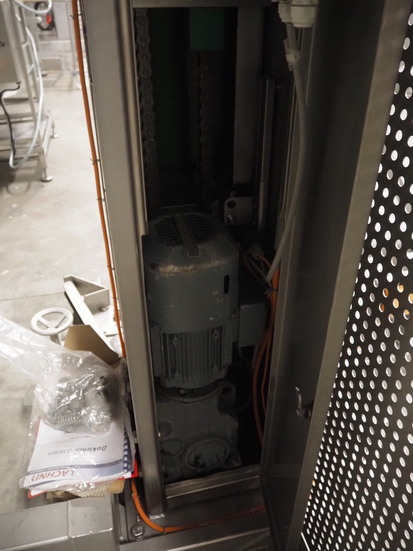 Lachnit Fördertechnik mobile lifter for 200 litres meat bins with safety cage, type: 300 S, serial number: 4066, year of construction: 2014, 400 V, 50 Hz, 3.75 A, 1.5 kW, lifting height: 2850 mm, maximum load capacity: 350 kg, weight: 500 kg, total dimensions: 1600 mm x 1850 mm x 3600 mm.