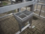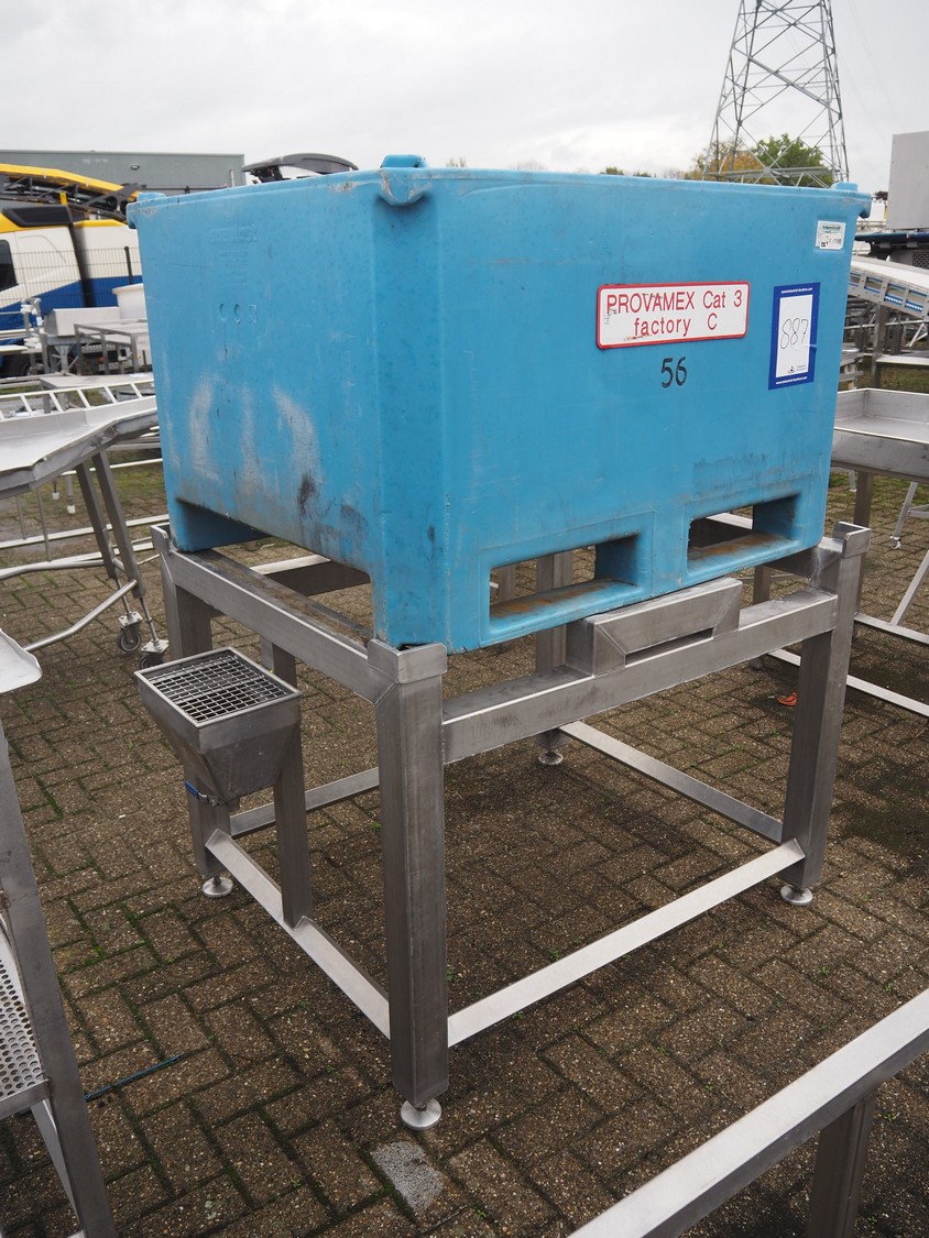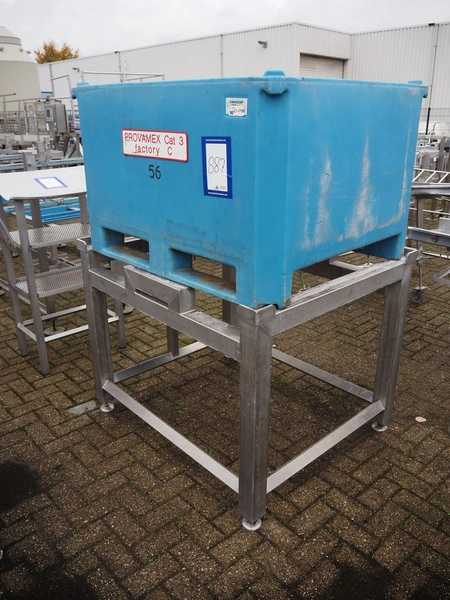 S/s frame with plastic pallet box, frame dimensions: 1250 mm x 1050 mm x 960 mm, pallet box dimensions: 1200 mm x 1000 mm x 750 mm.