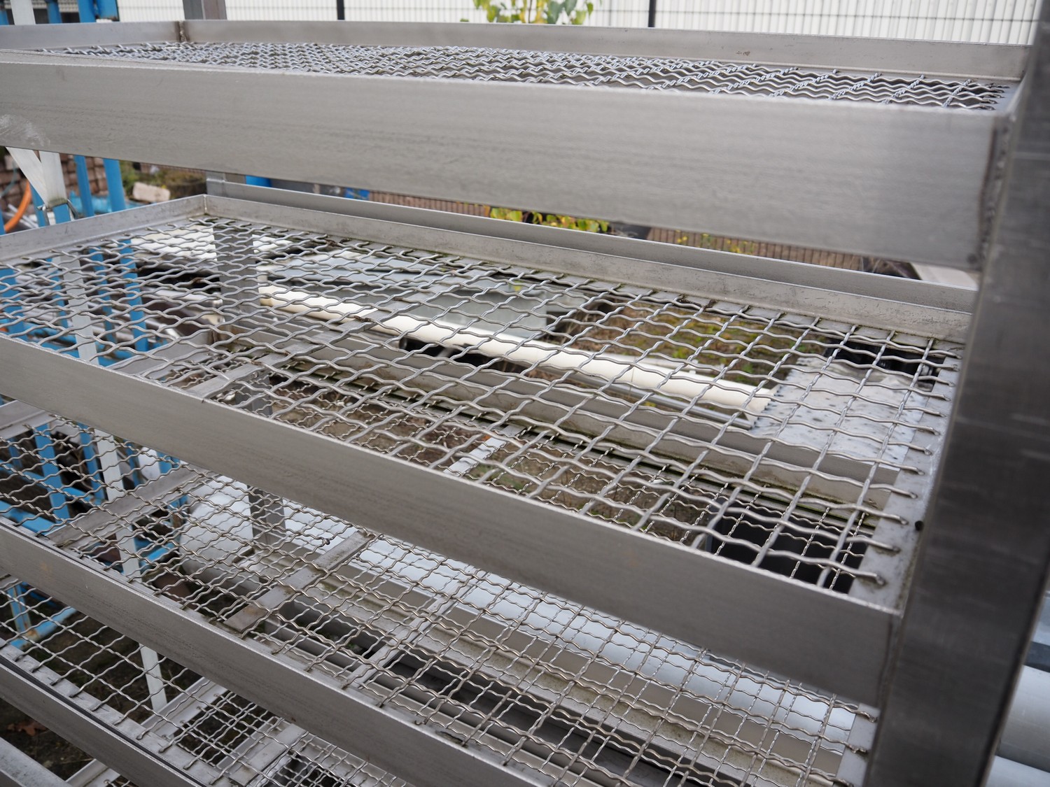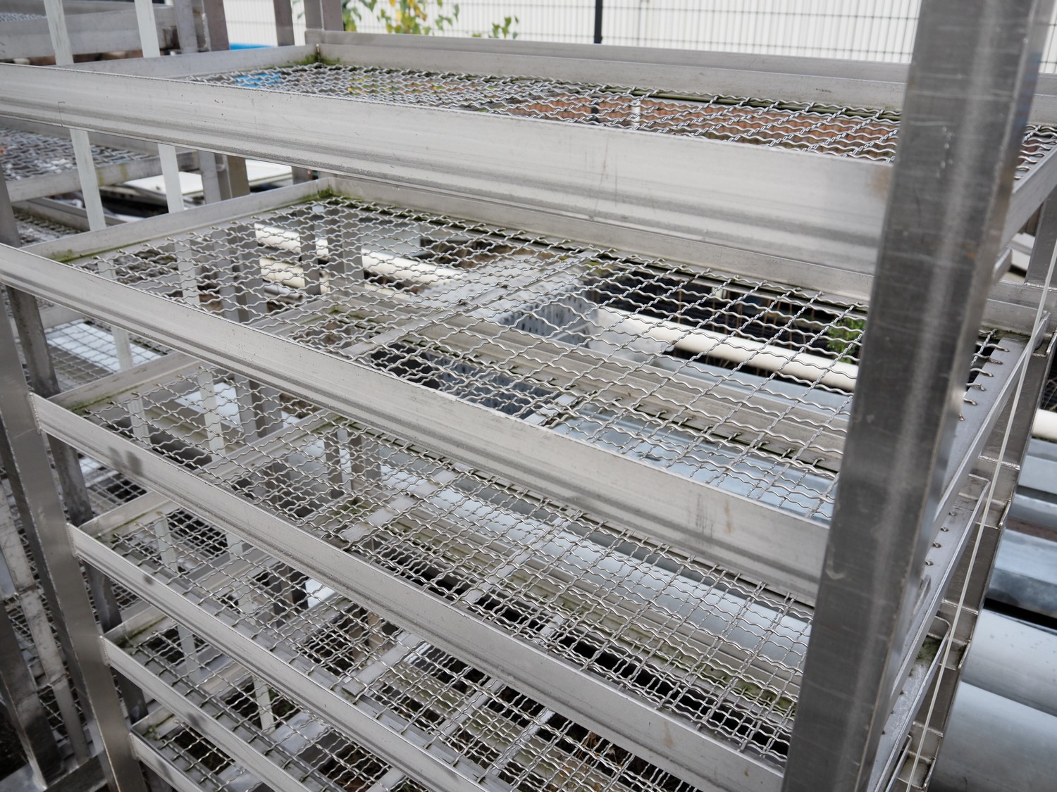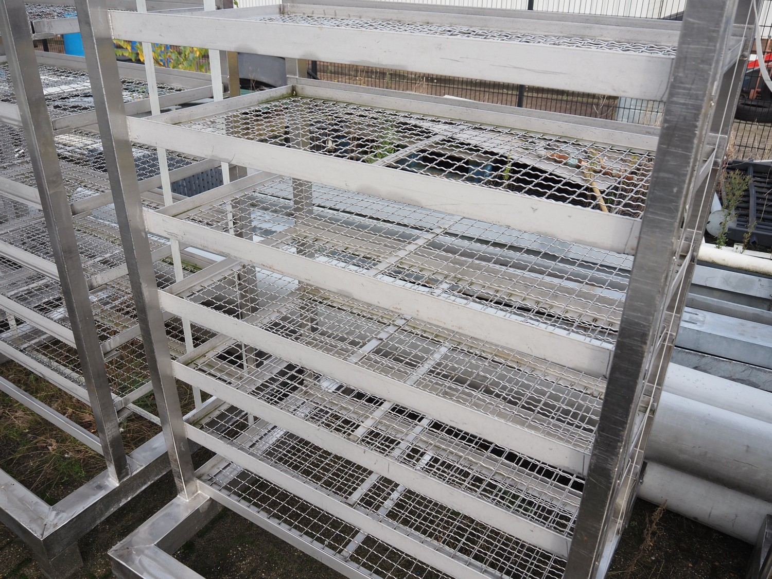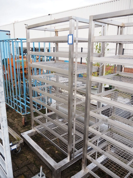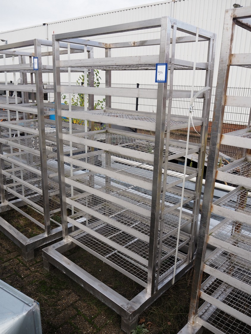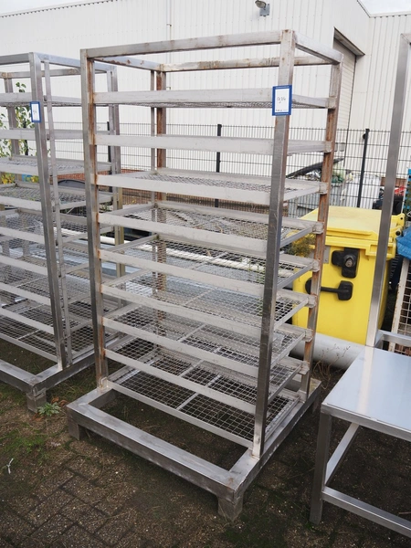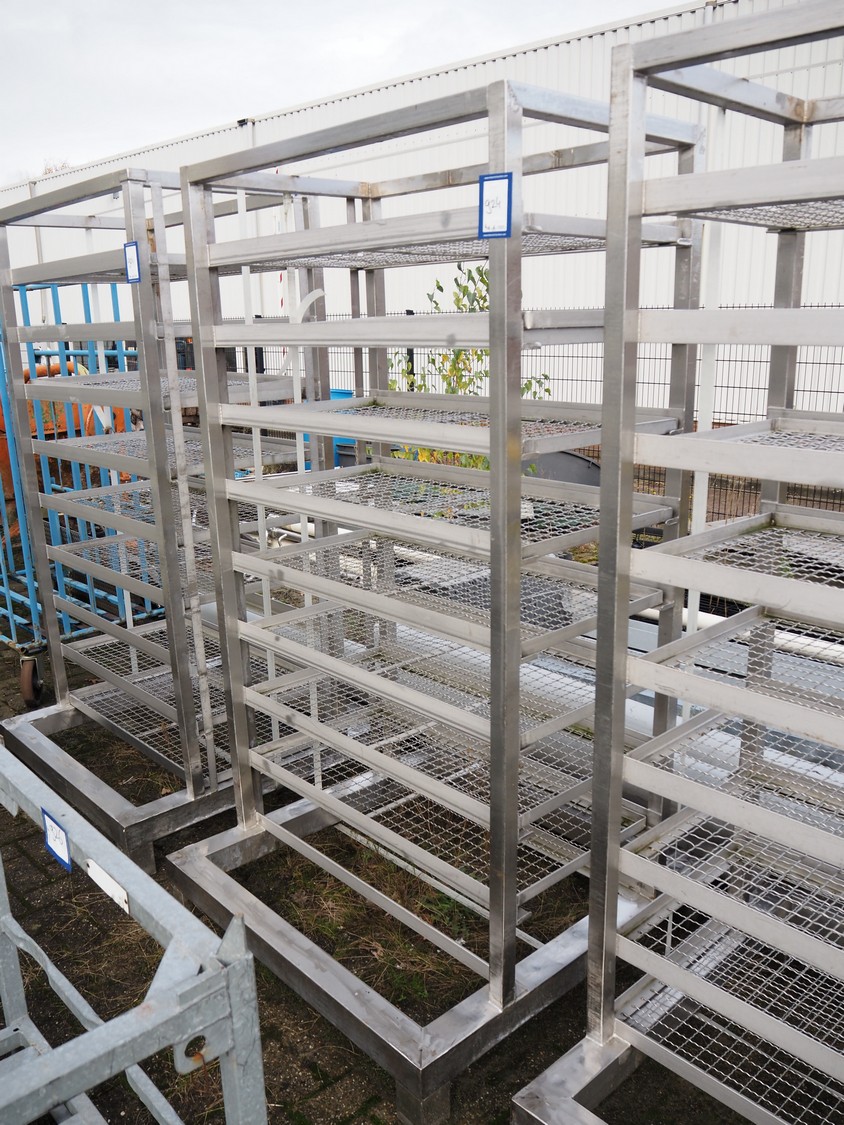 4 s/s racks with 9 floors, dimensions floors: 500 mm x 990 mm, dimensions racks: (4x) 1050 mm x 1050 mm x 1930 mm.
