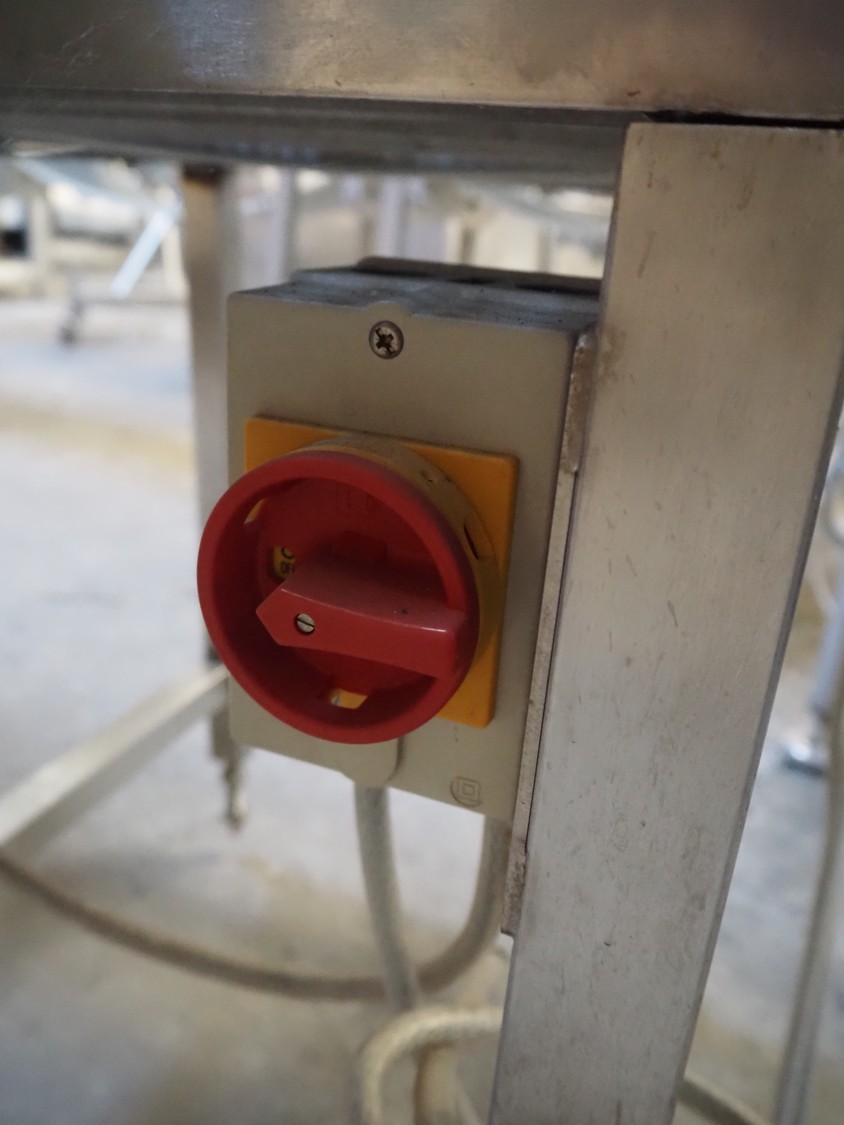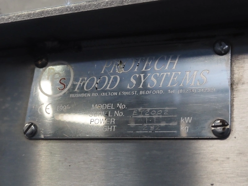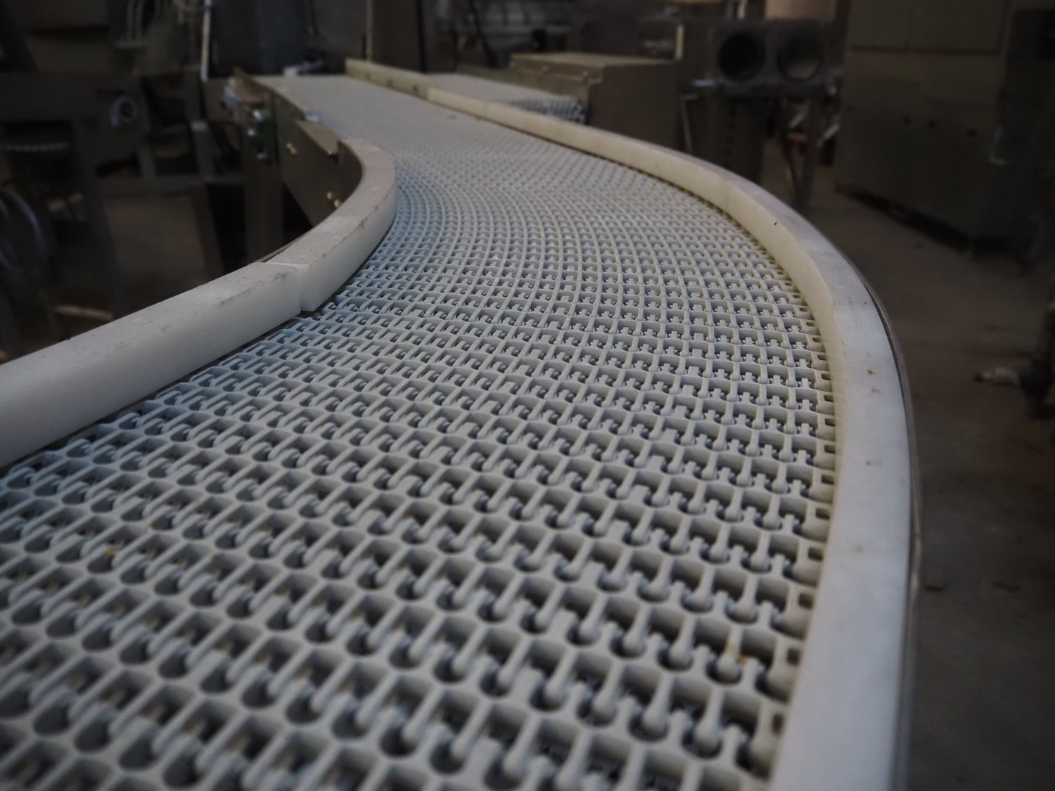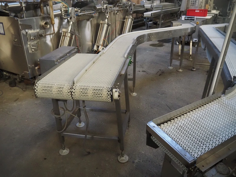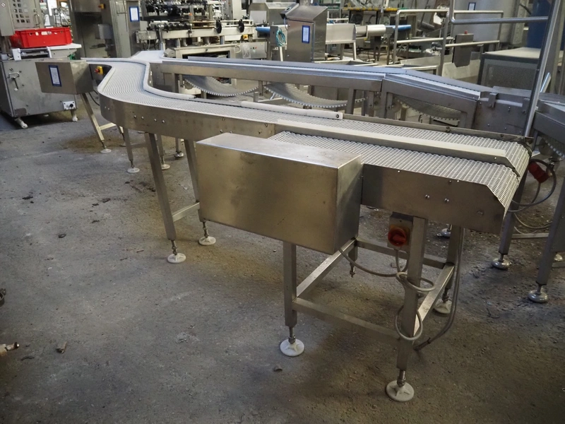 Protech Food Systems S-shaped conveyor, serial number: ET2002, plastic mesh belt, belt width: 305 mm, total dimensions: 3800 mm x 1250 mm x 1000 mm.