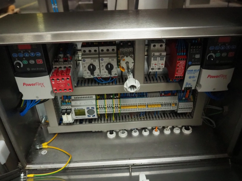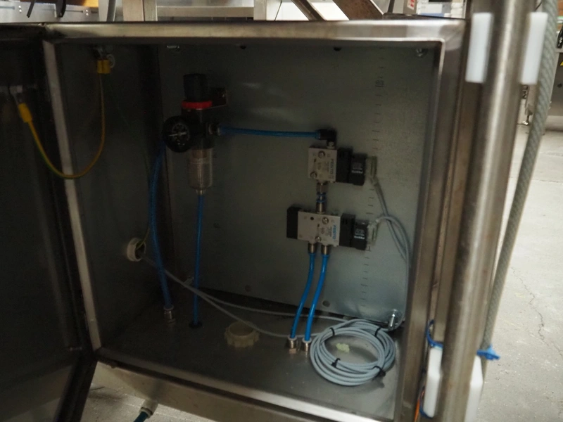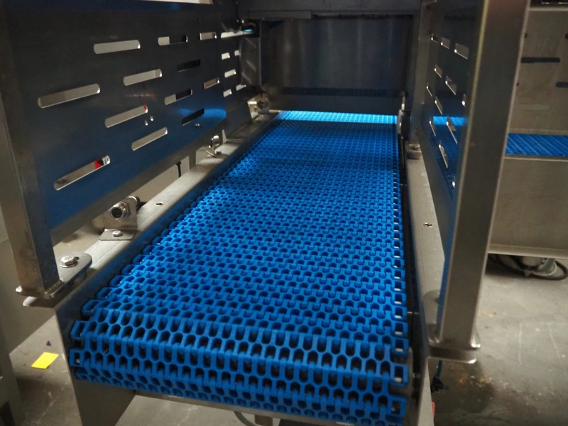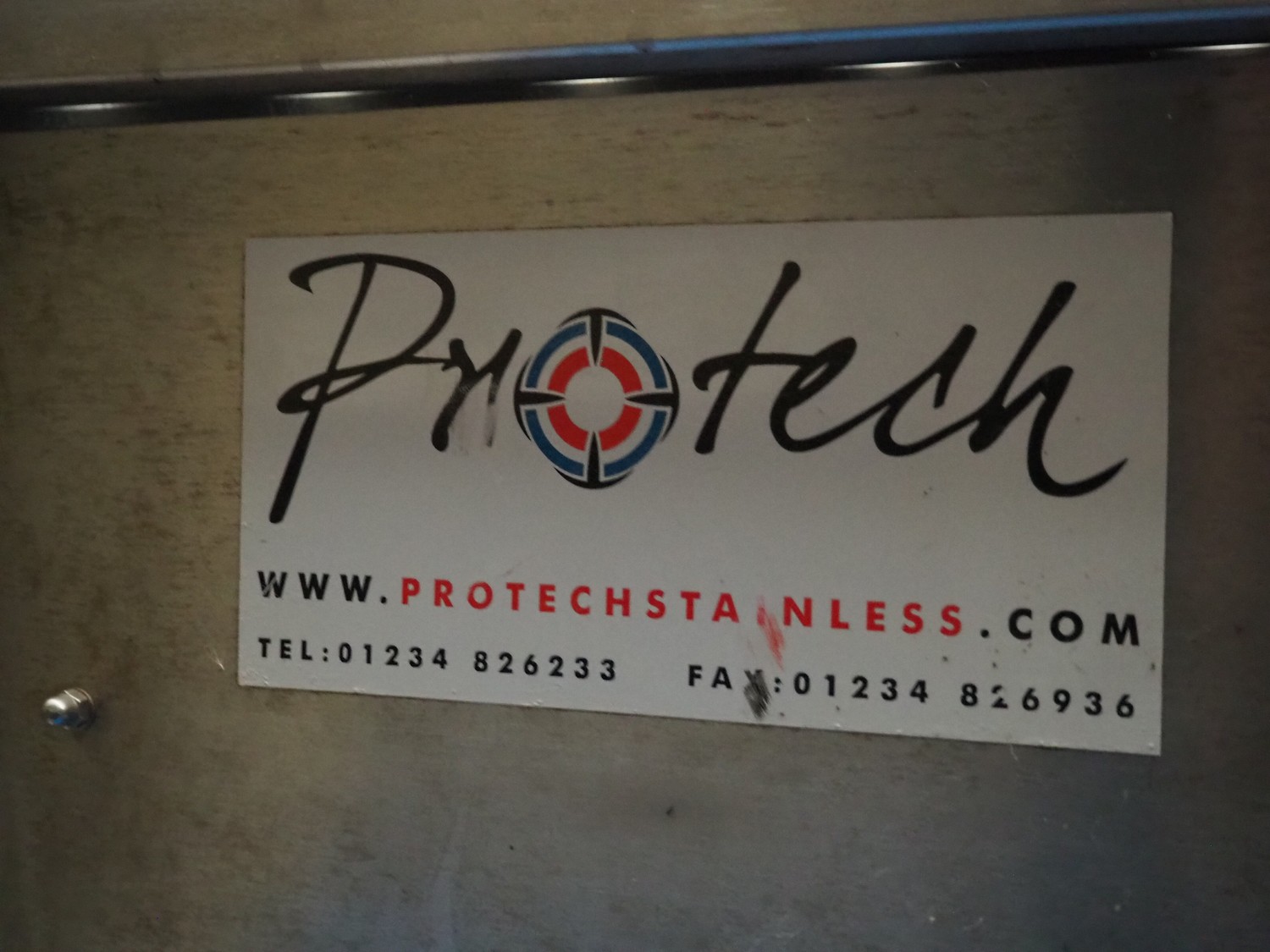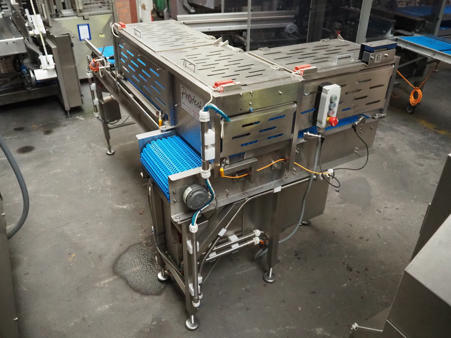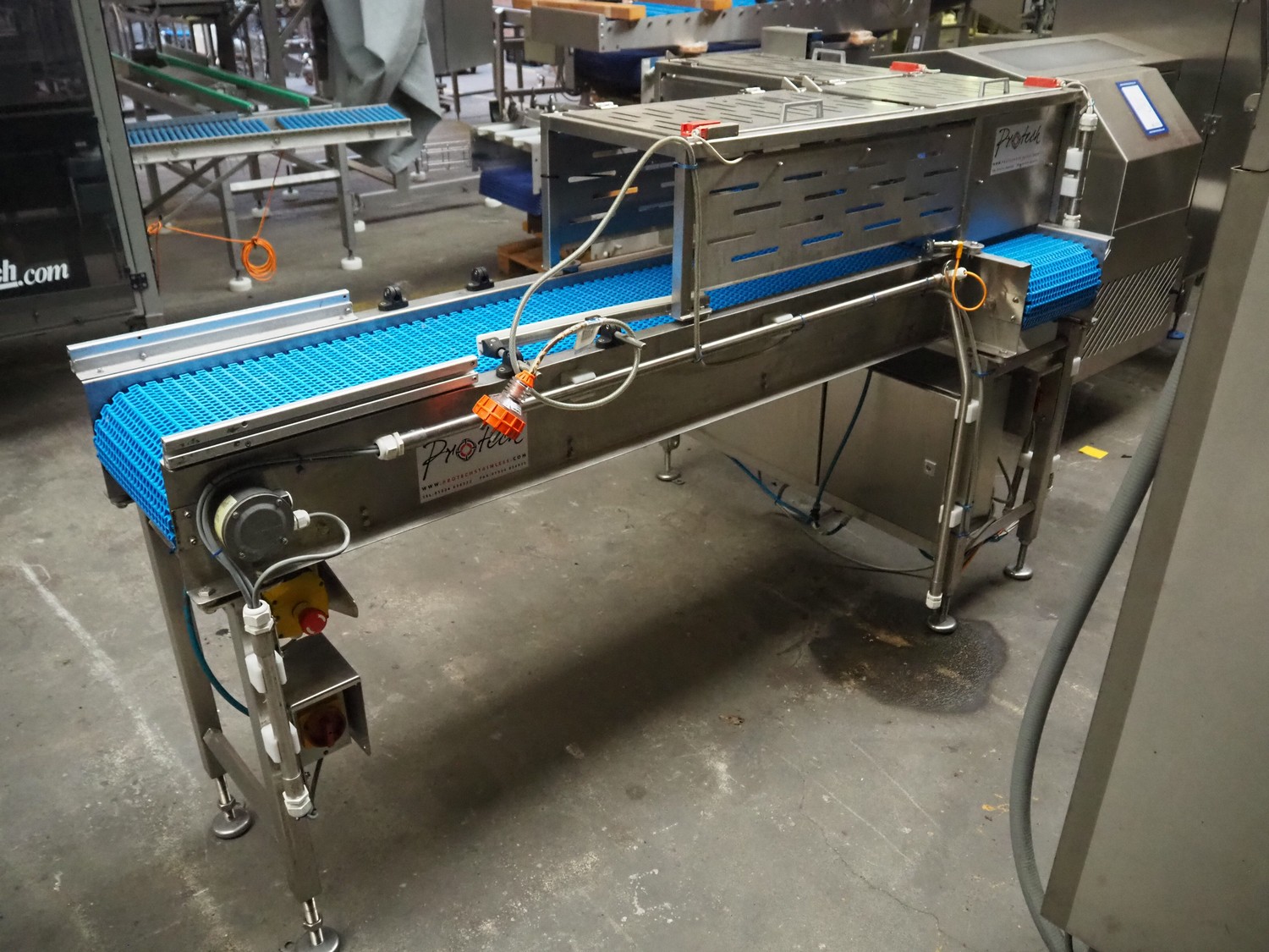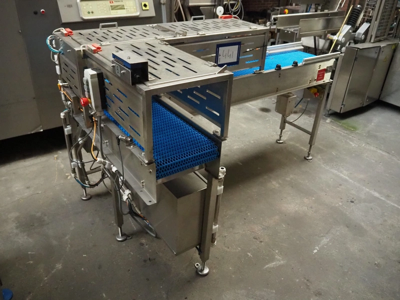 Protech 90° curve conveyor, type: 17787, serial number: 17781-0200-A, year of construction: 23-09-2011, 1.0 kW, weight: 310 kg, plastic mesh belt, belt width: 315 mm, total dimensions: 1200 mm x 2150 mm x 1300 mm.