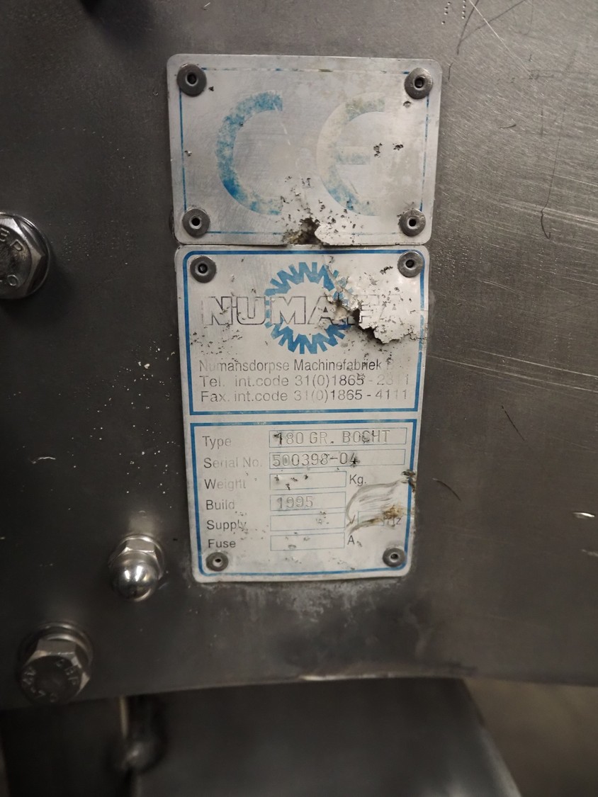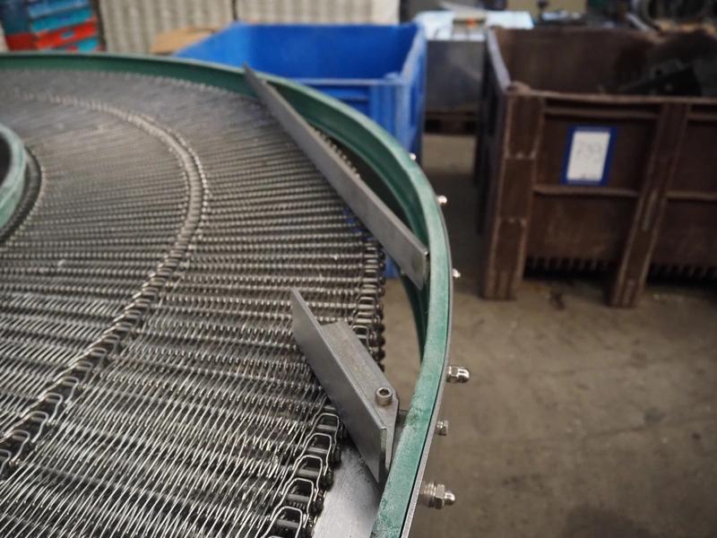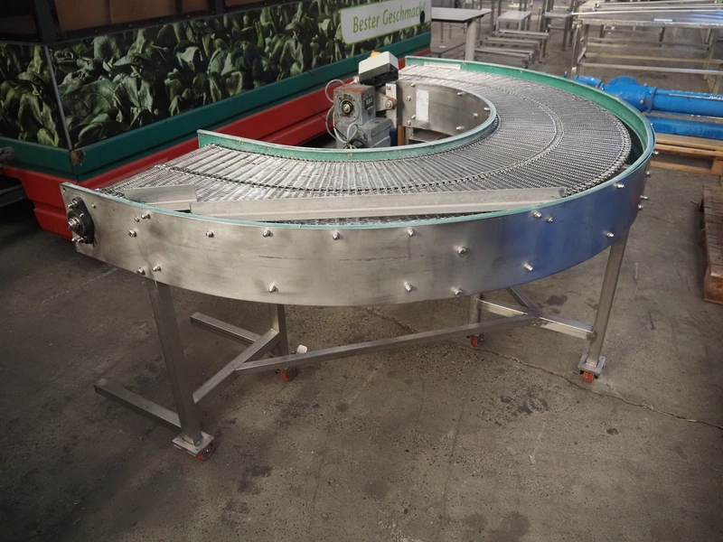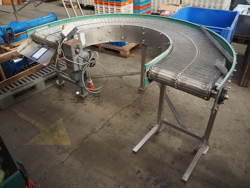 Mobile curve conveyor with 180°, type: 180 GR. BOCHT, serial number: 500398-04, year of construction: 1995, s/s frame, s/s mesh belt, belt width: 450 mm, total dimensions: 2050 mm x 1500 mm x 1000 mm.