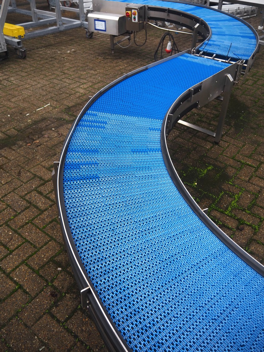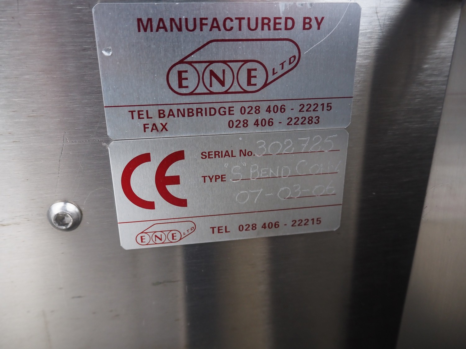 ENE ltd S-shaped conveyor, type: S Bend Conv., serial number: 302725, year of constructions: 2006, s/s frame, plastic mesh belt, belt width: 450 mm, total dimensions: 2850 mm x 1600 mm x 740 mm and 2300 mm x 2500 mm x 740 mm.