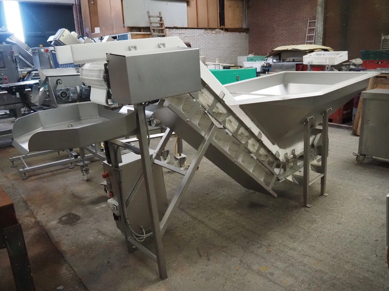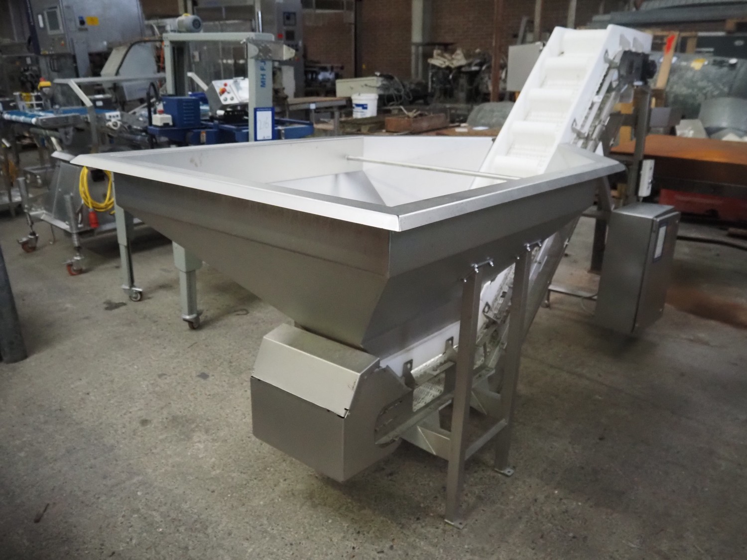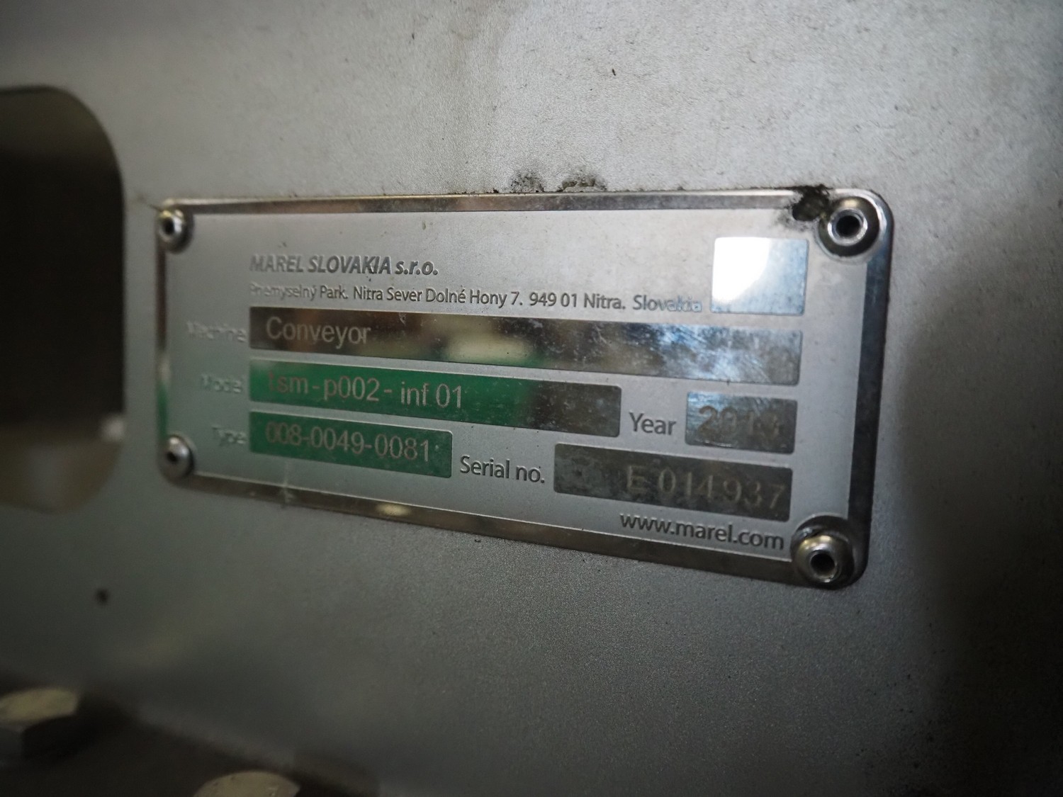 Marel elevating belt with infeed hopper, model: tsm-p002-inf 01, type: 008.0049-0081, serial number: E014937, year of construction: 2013, s/s frame, plastic belt with dividers, belt width: 300 mm, distance between dividers: 200 mm, elevating height: 1500 mm, total dimensions: 3200 mm x 1500 mm x 1600 mm.