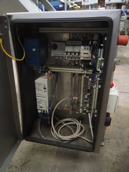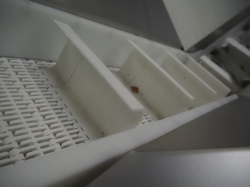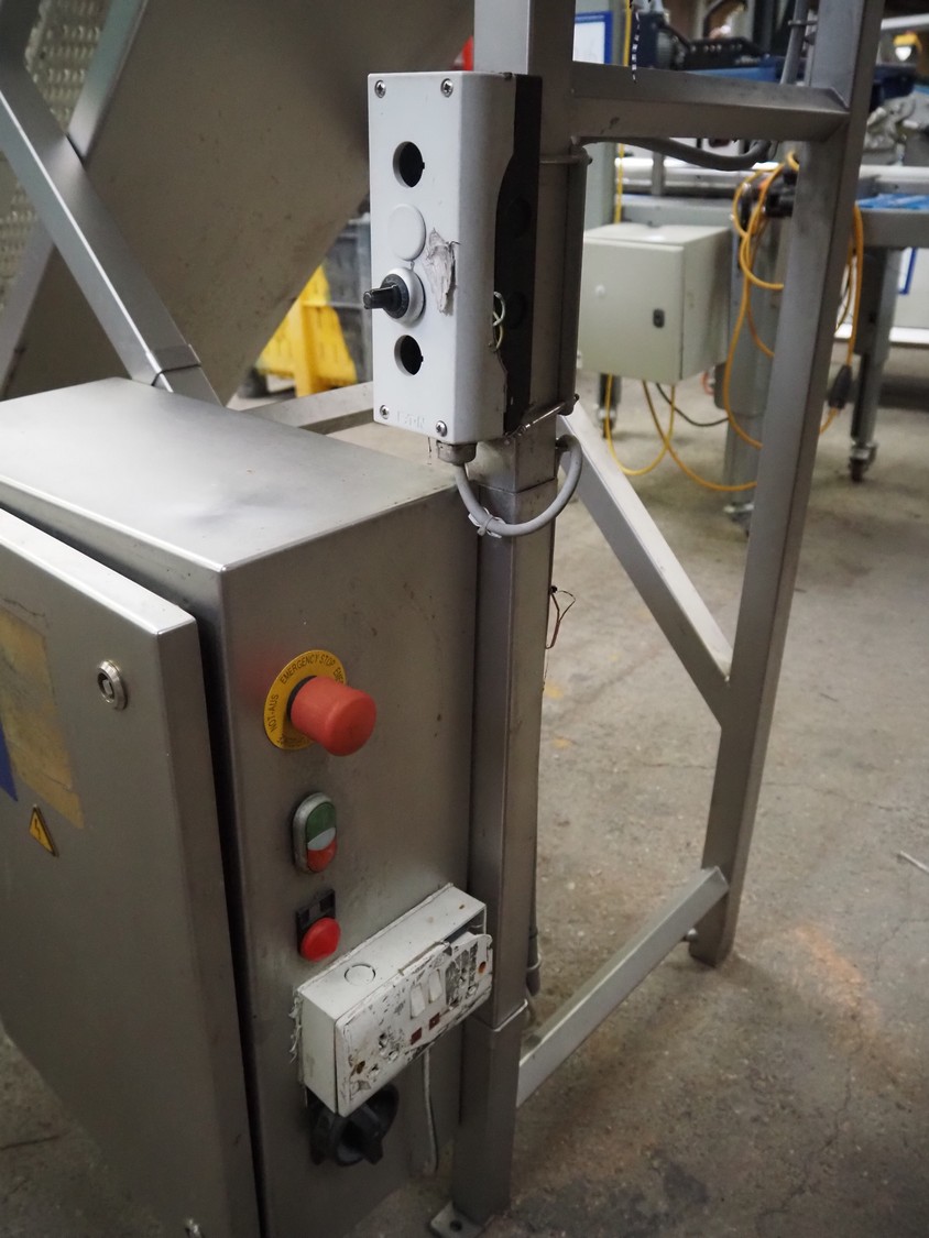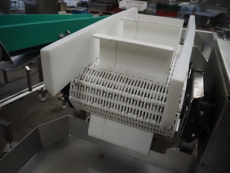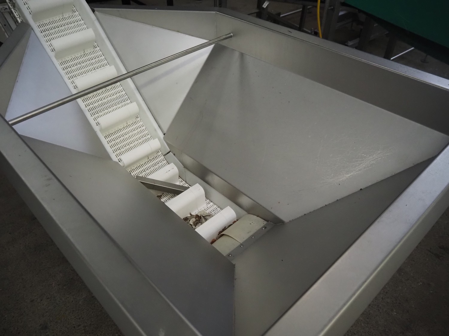 Marel elevating belt with infeed hopper, model: tsm-p002-inf 01, type: 008.0049-0081, serial number: E014937, year of construction: 2013, s/s frame, plastic belt with dividers, belt width: 300 mm, distance between dividers: 200 mm, elevating height: 1500 mm, total dimensions: 3200 mm x 1500 mm x 1600 mm.