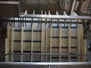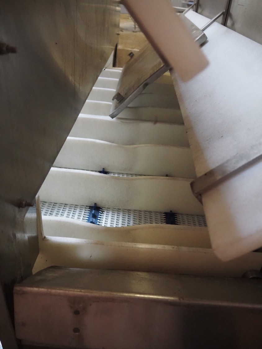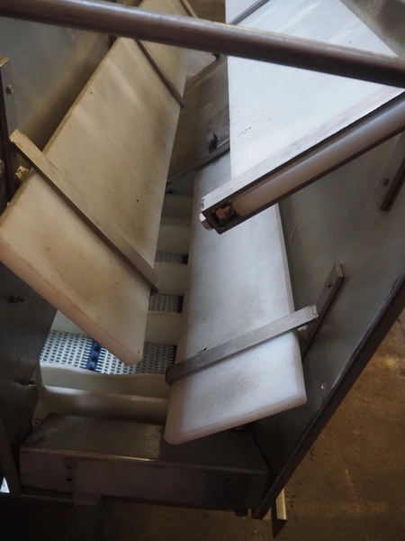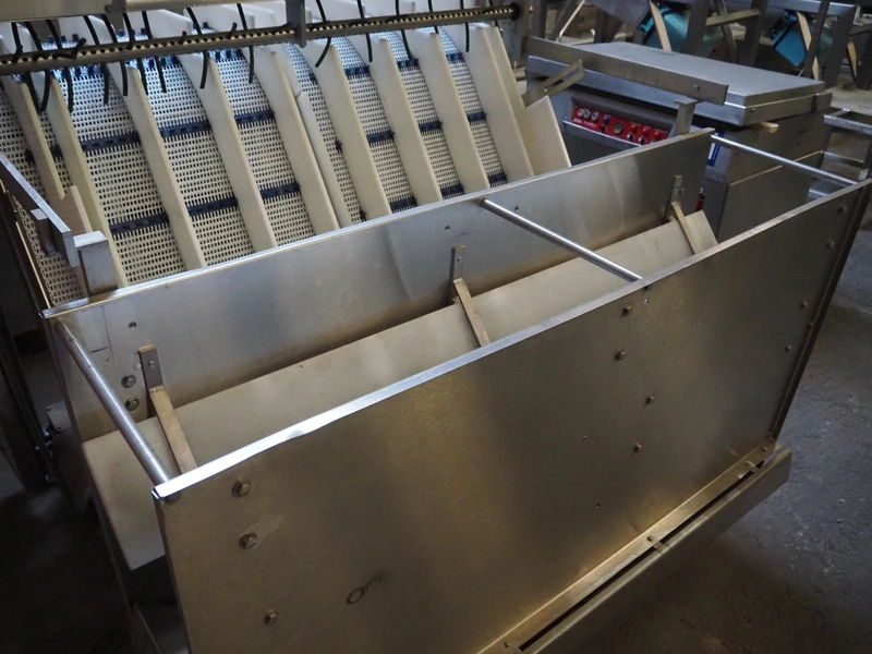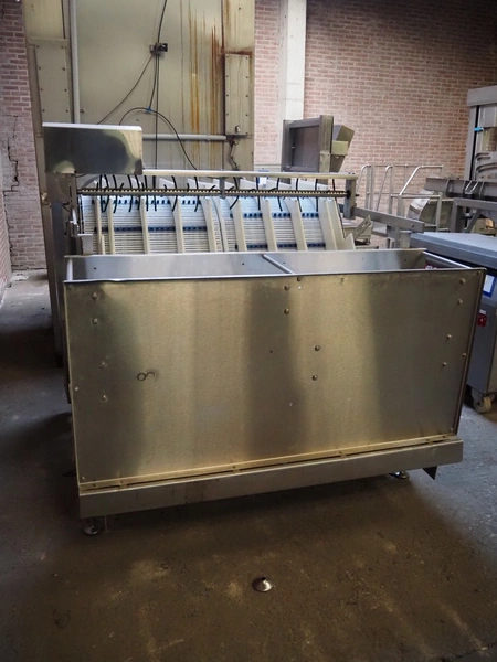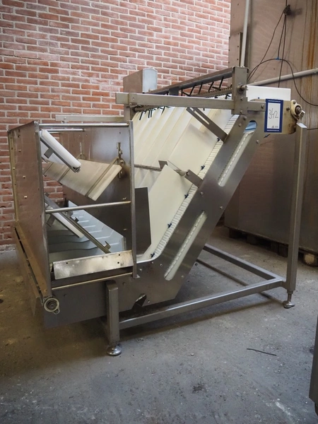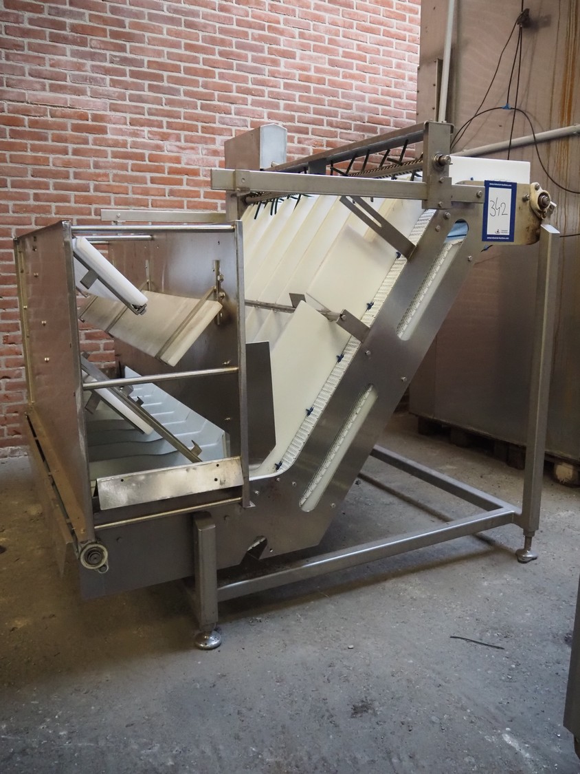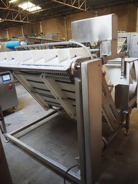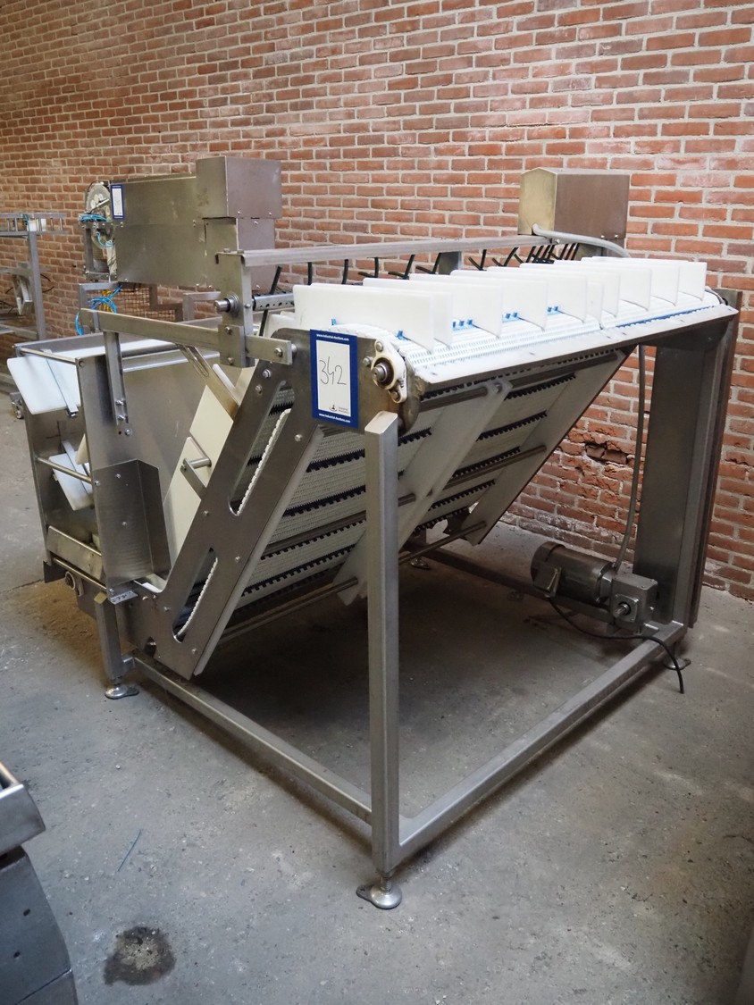 Infeed system, s/s frame, plastic mesh belt with dividers, belt width: (2x) 700 mm, divider height: 15 mm, distance between dividers: 200, elevating height: 1340 mm, total dimensions: 1650 mm x 1630 mm x 1740 mm.