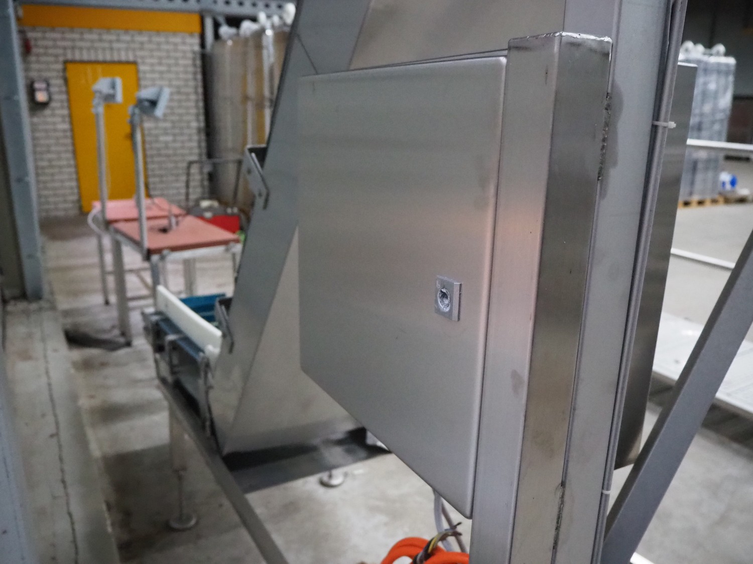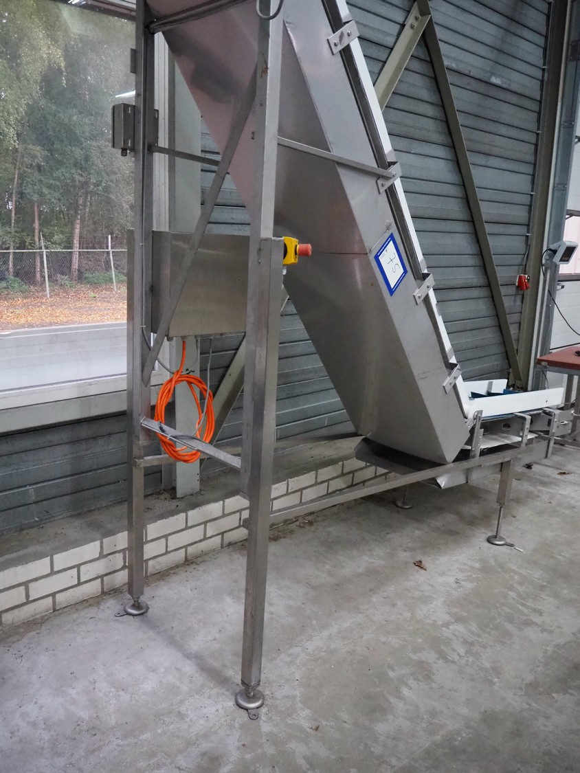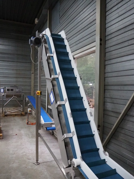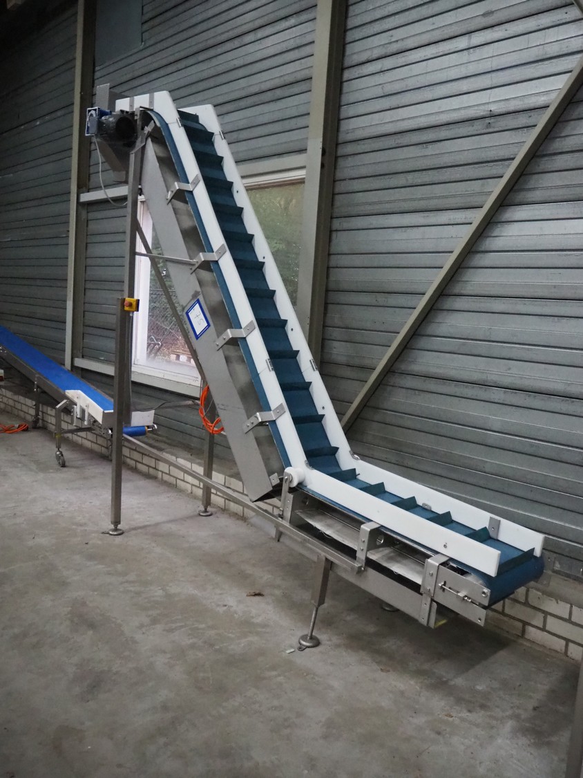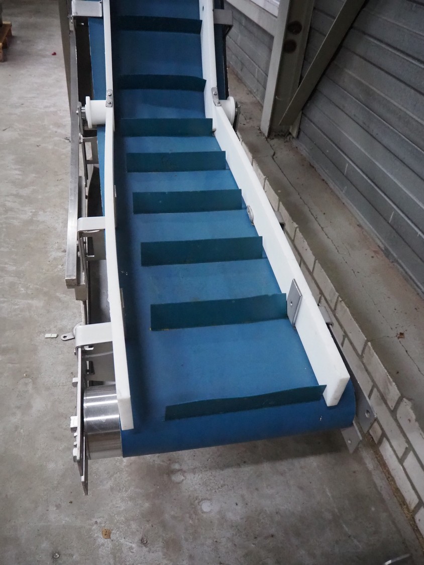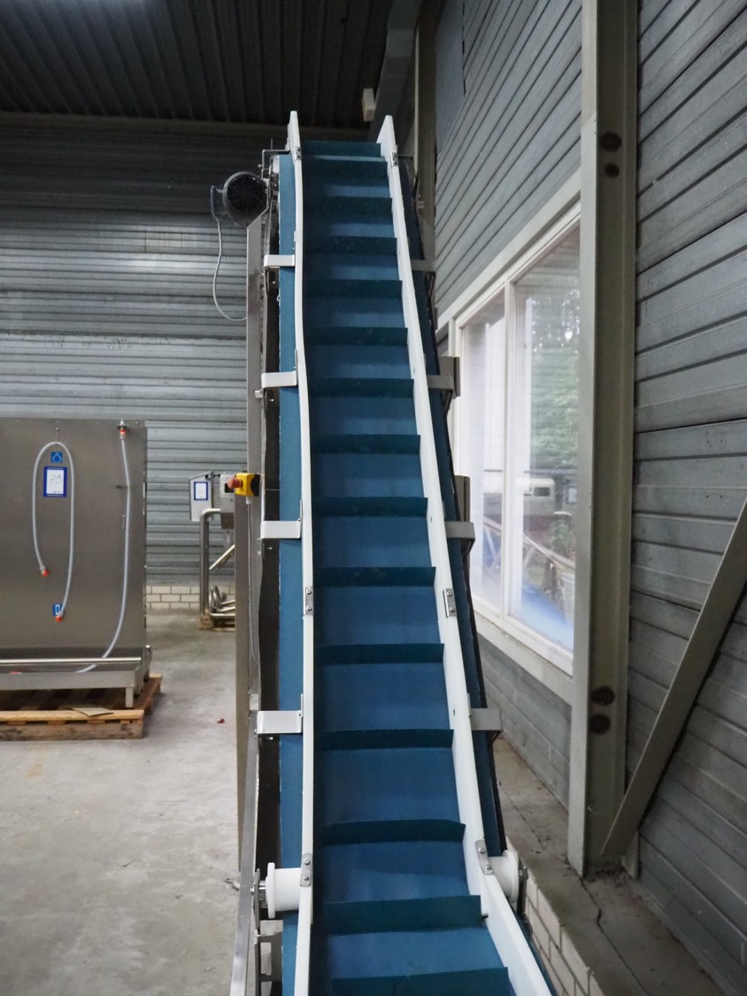 Elevating belt, s/s frame, plastic belt with dividers, belt width: 460 mm, distance between dividers: 200 mm, divider height: 50 mm, elevating height: 2800 mm, total dimensions: 3300 mm x 900 mm x 2950 mm.