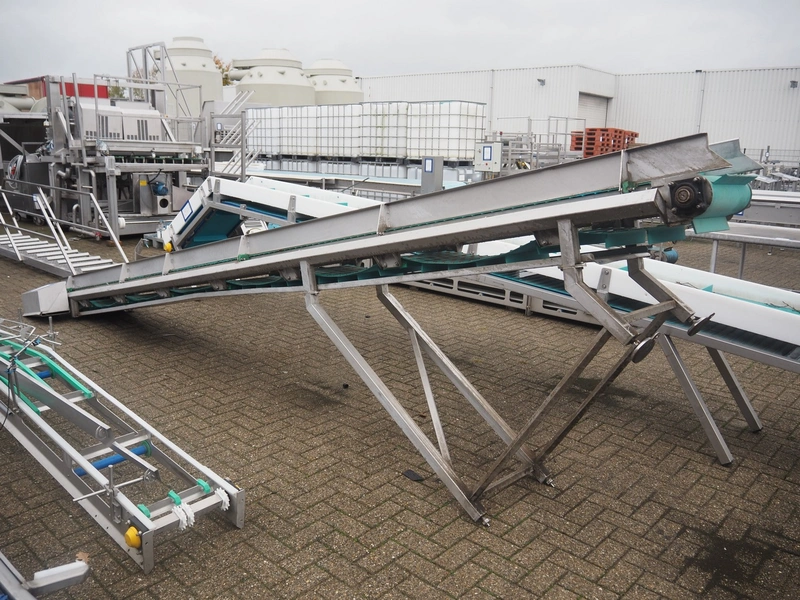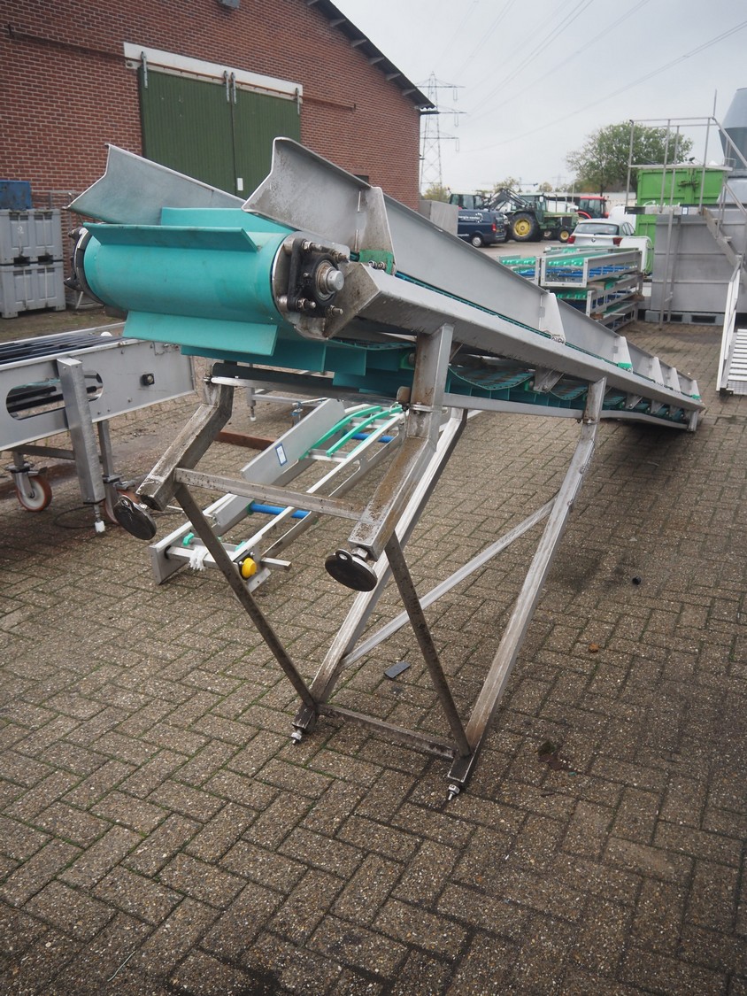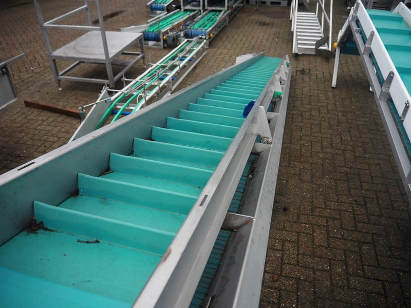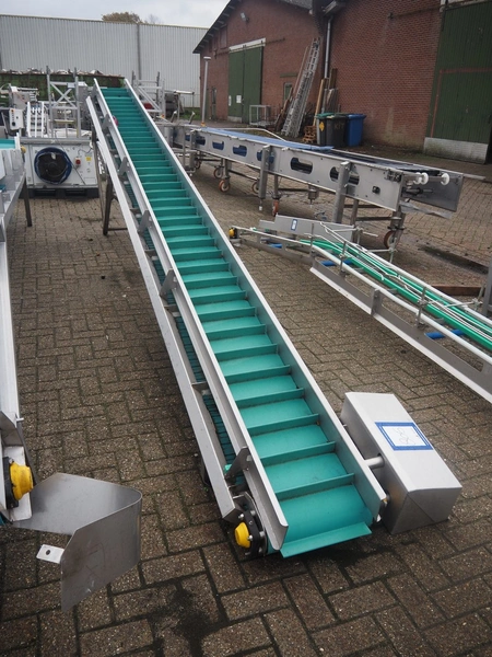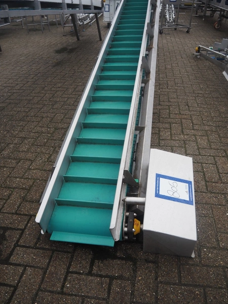 Elevating belt, plastic belt with dividers, belt width: 380 mm, divider height: 50 mm, distance between dividers: 150 mm, total dimensions: 5900 mm x 800 mm x 1650 mm.