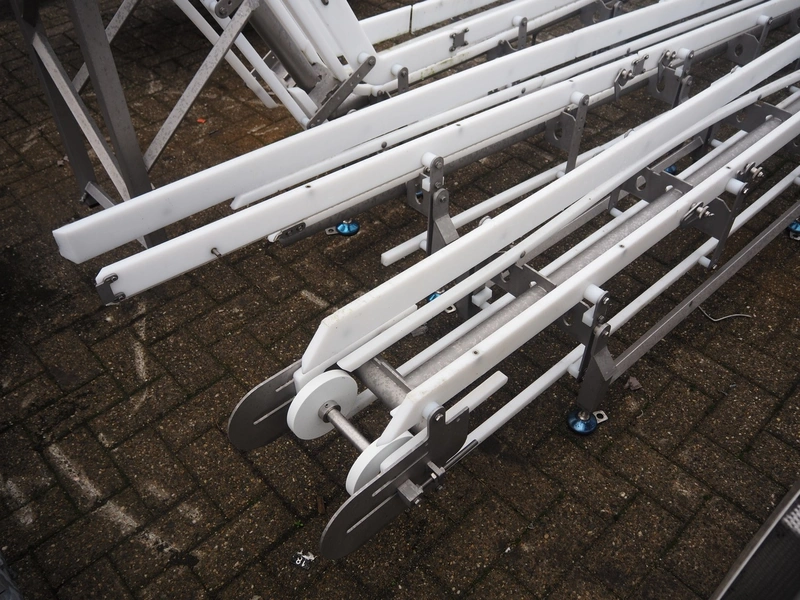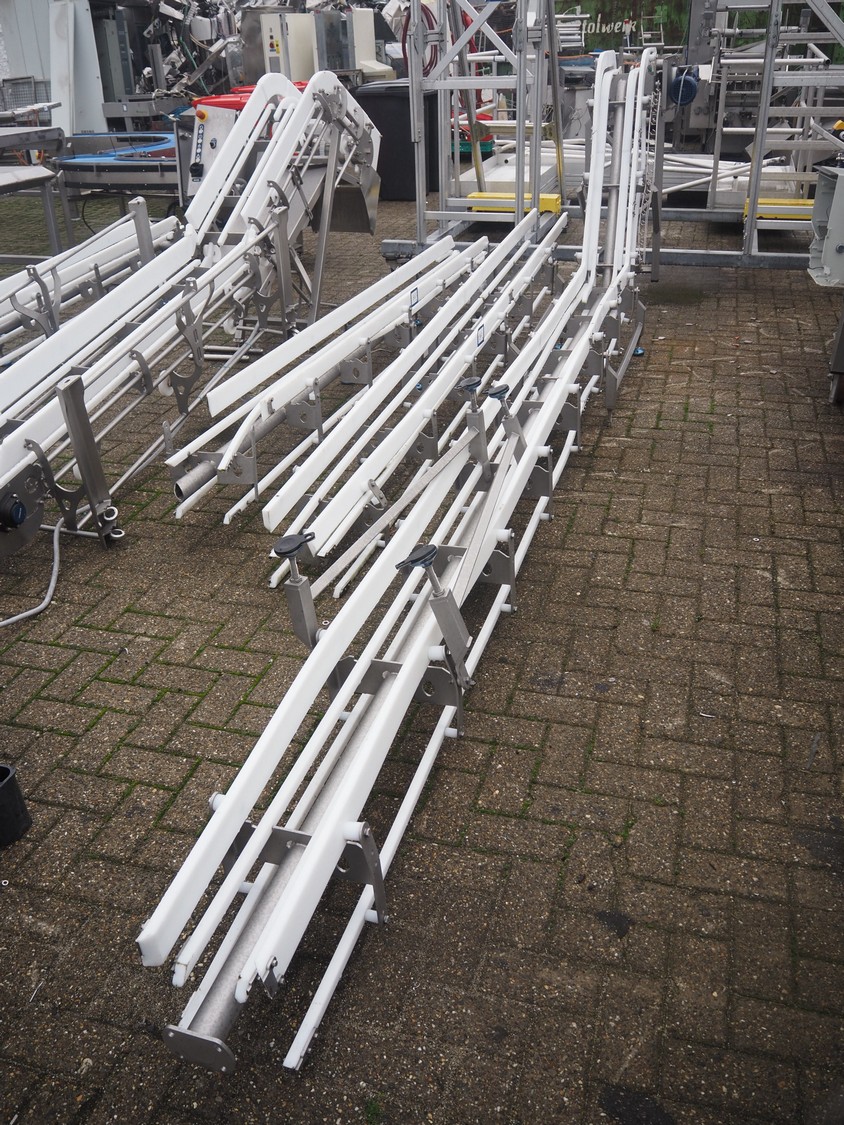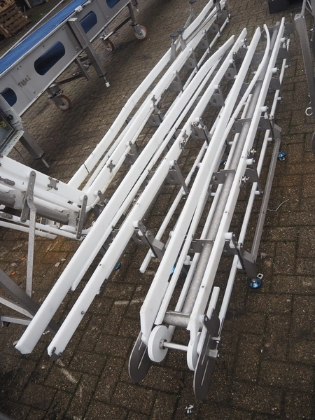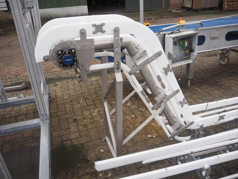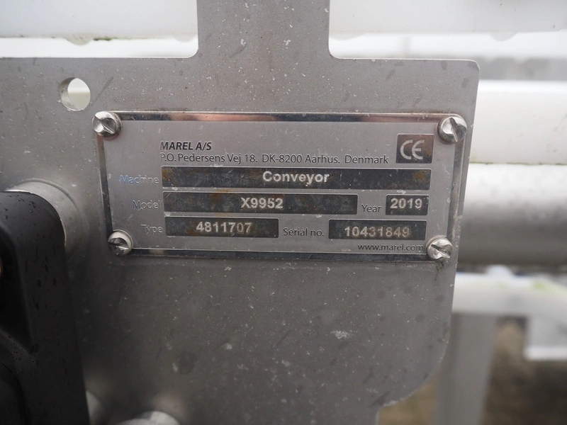 Marel s/s frame for elevating belt, model: X9952, type: 4811707, serial number: 10431849, year of construction: 2019, maximum belt width: 180 mm, dimensions: (1x) 5000 mm x 650 mm x 1400 mm, (2x) 3700 mm x 400 mm x 500 mm.