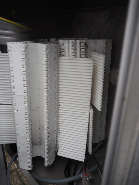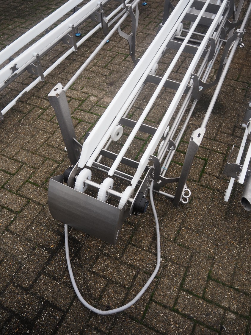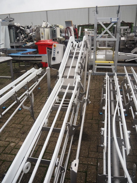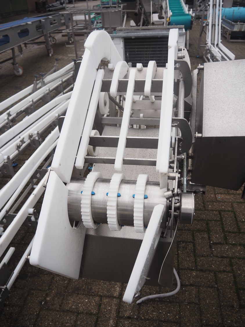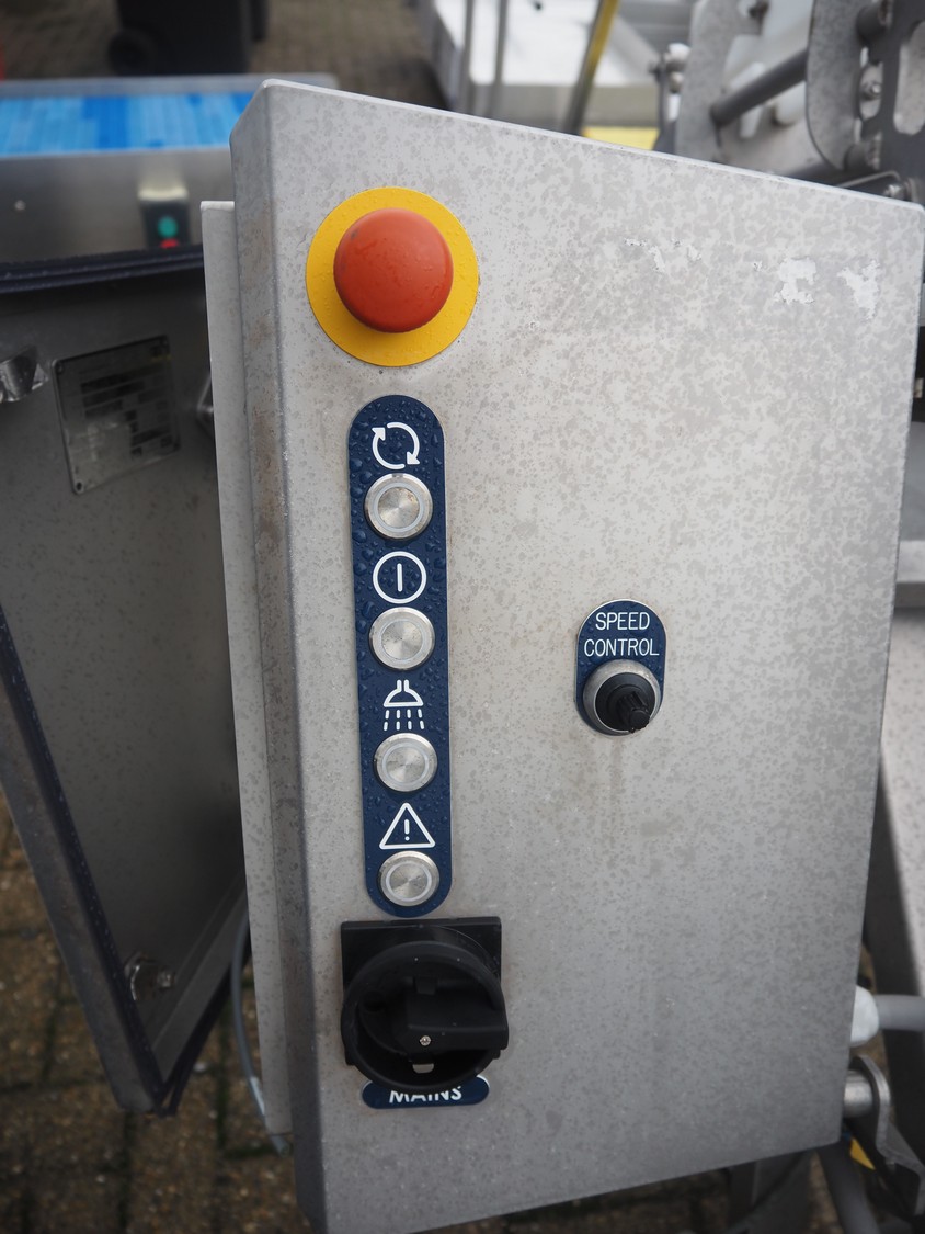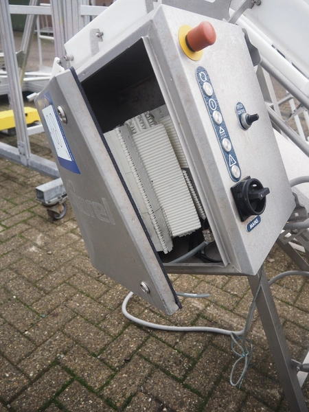 Marel s/s frame for elevating belt, model: NR0001, type: Conveyor, serial number: A196178, year of construction: 2019, 200/240 V, 50/60 Hz, 3 A, maximum belt width: 260 mm, total dimensions: 3800 mm x 1000 mm x 1400 mm.