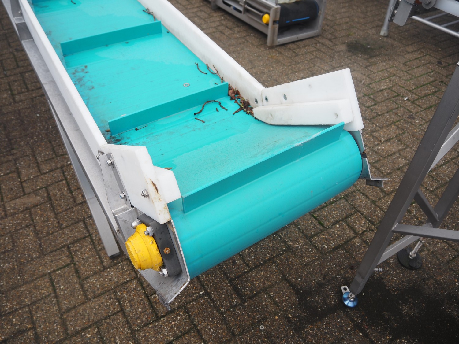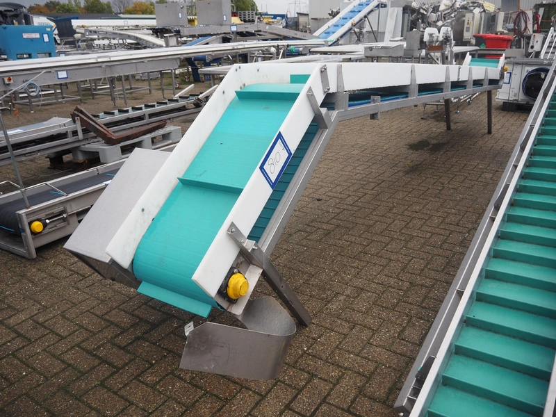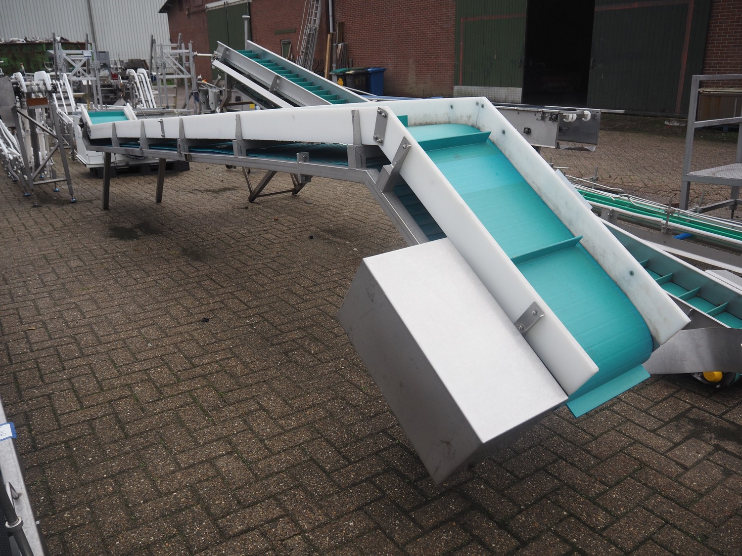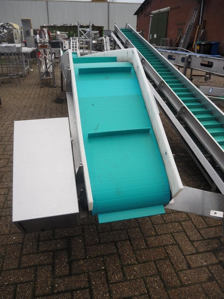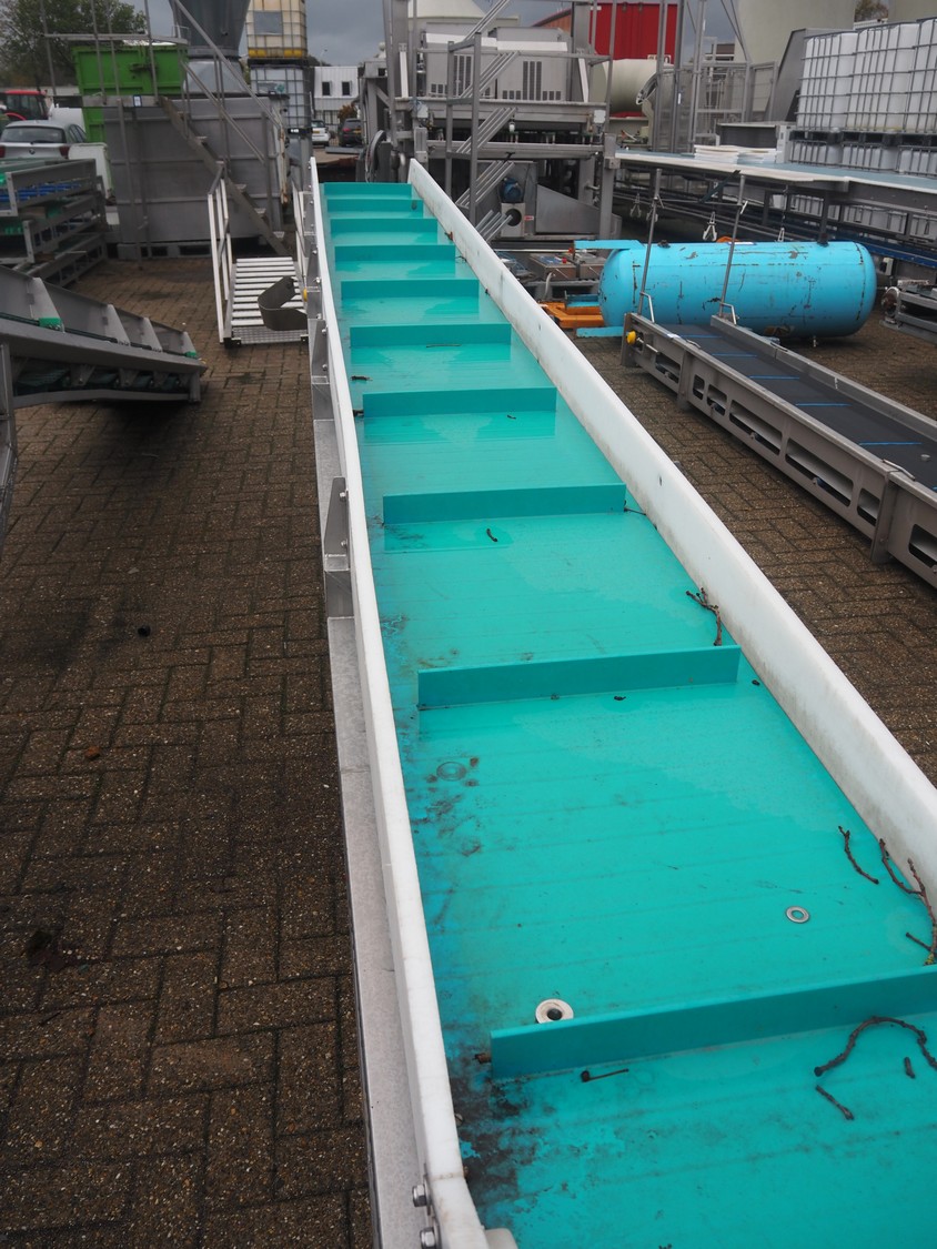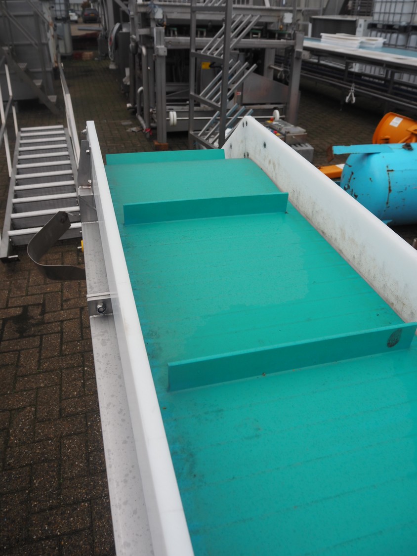 Elevating belt, plastic belt with dividers, belt width: 455 mm, divider height: 50 mm, distance between dividers: 490 mm, total dimensions: 6400 mm x 1000 mm x 1250 mm.