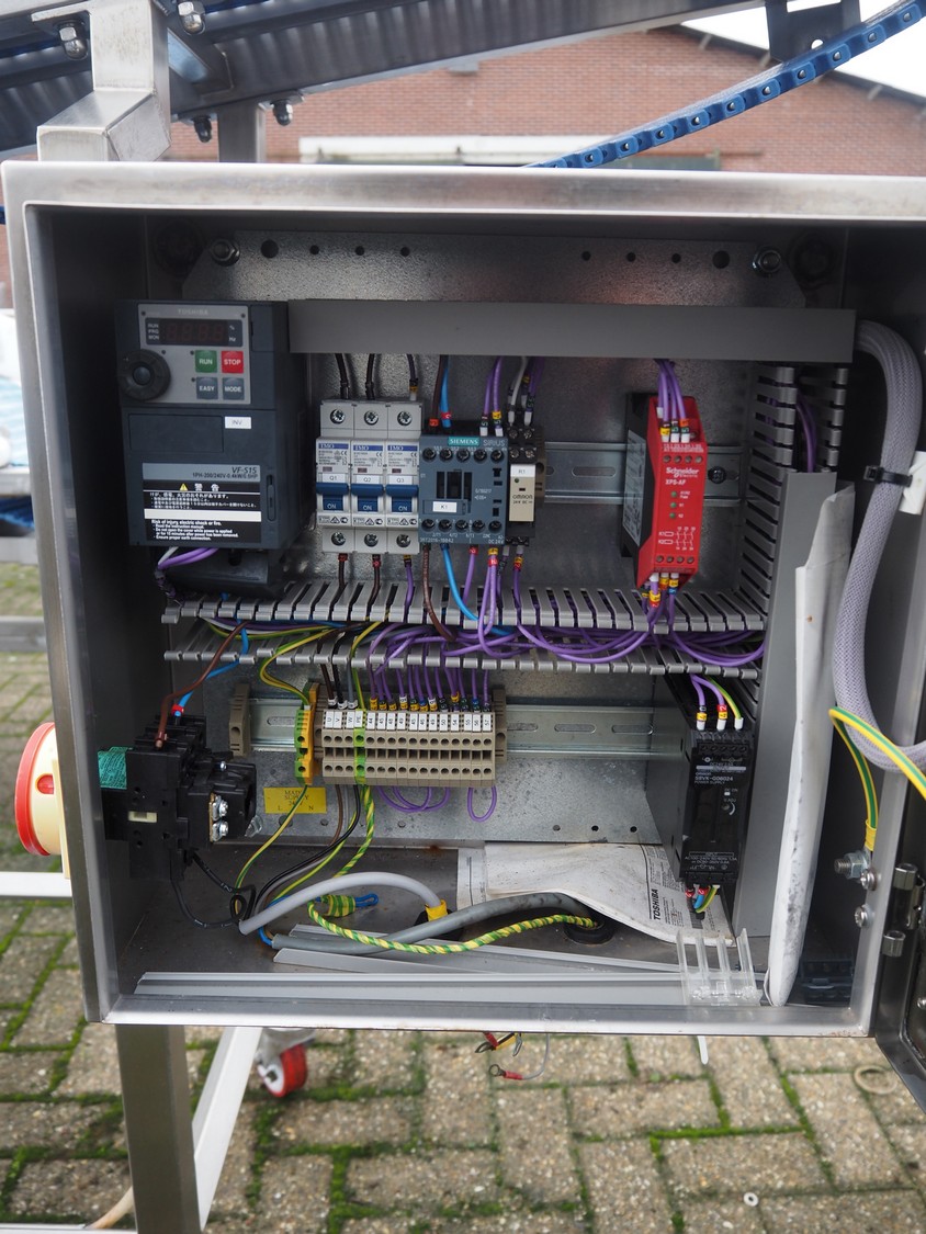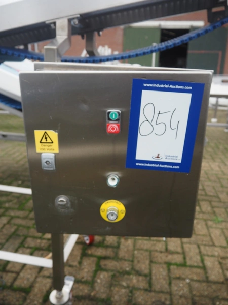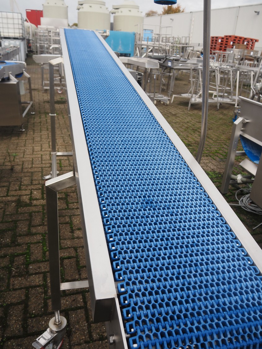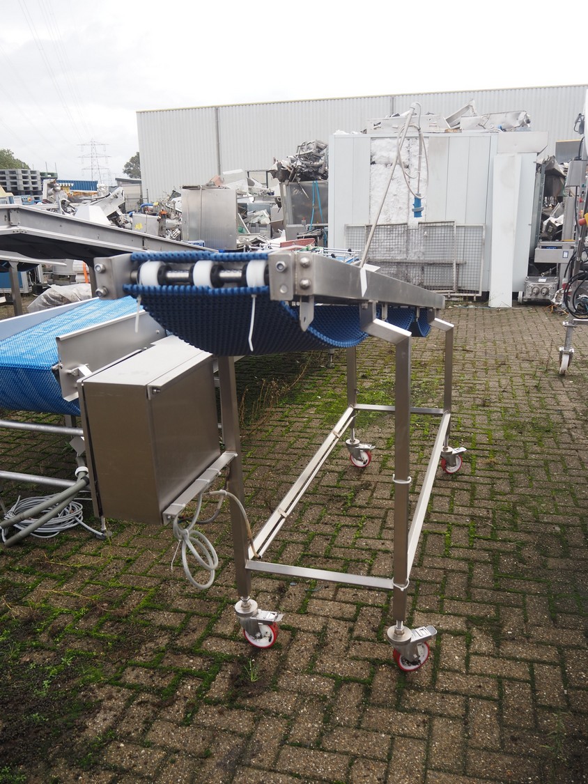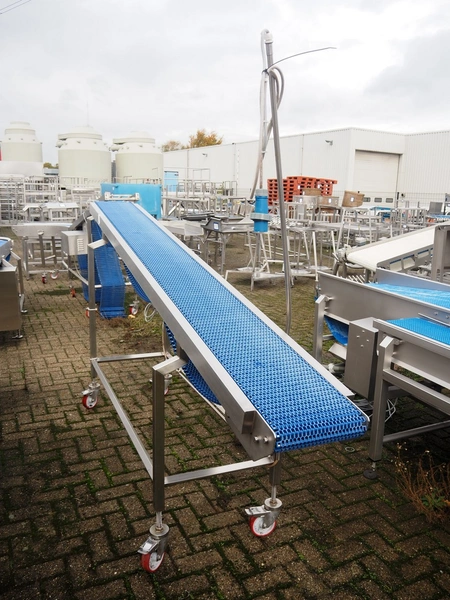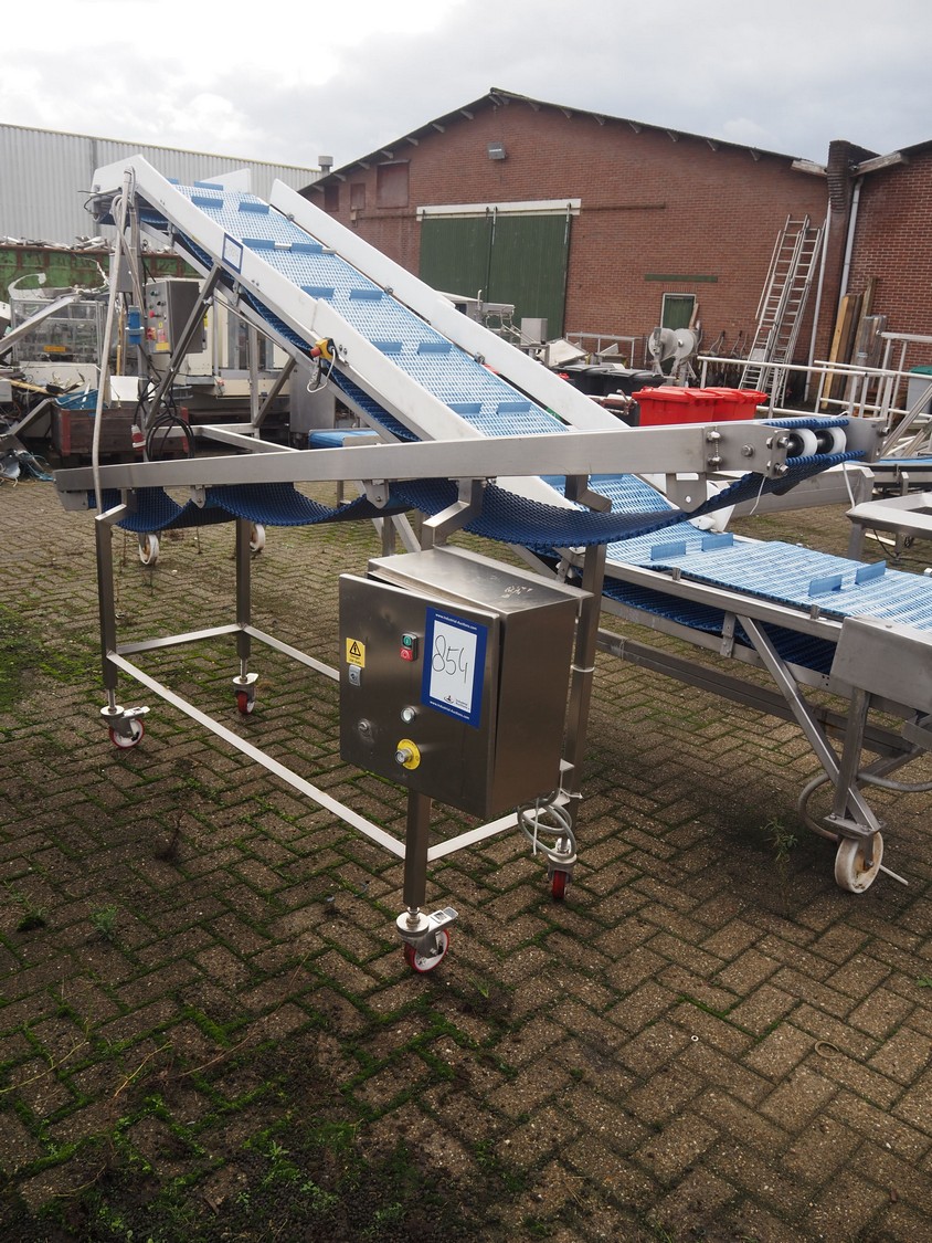 L.A.C. Conveyor Systems mobile elevating belt, s/s frame, plastic mesh belt, belt width: 300 mm, elevating height: 1460 mm, total dimensions: 3200 mm x 800 mm x 1500 mm.