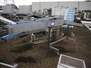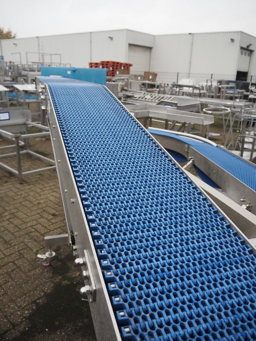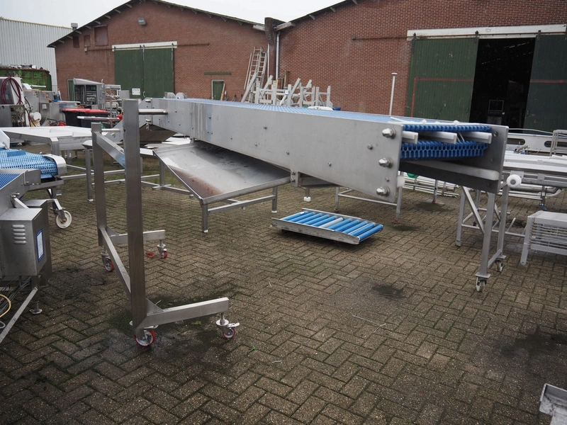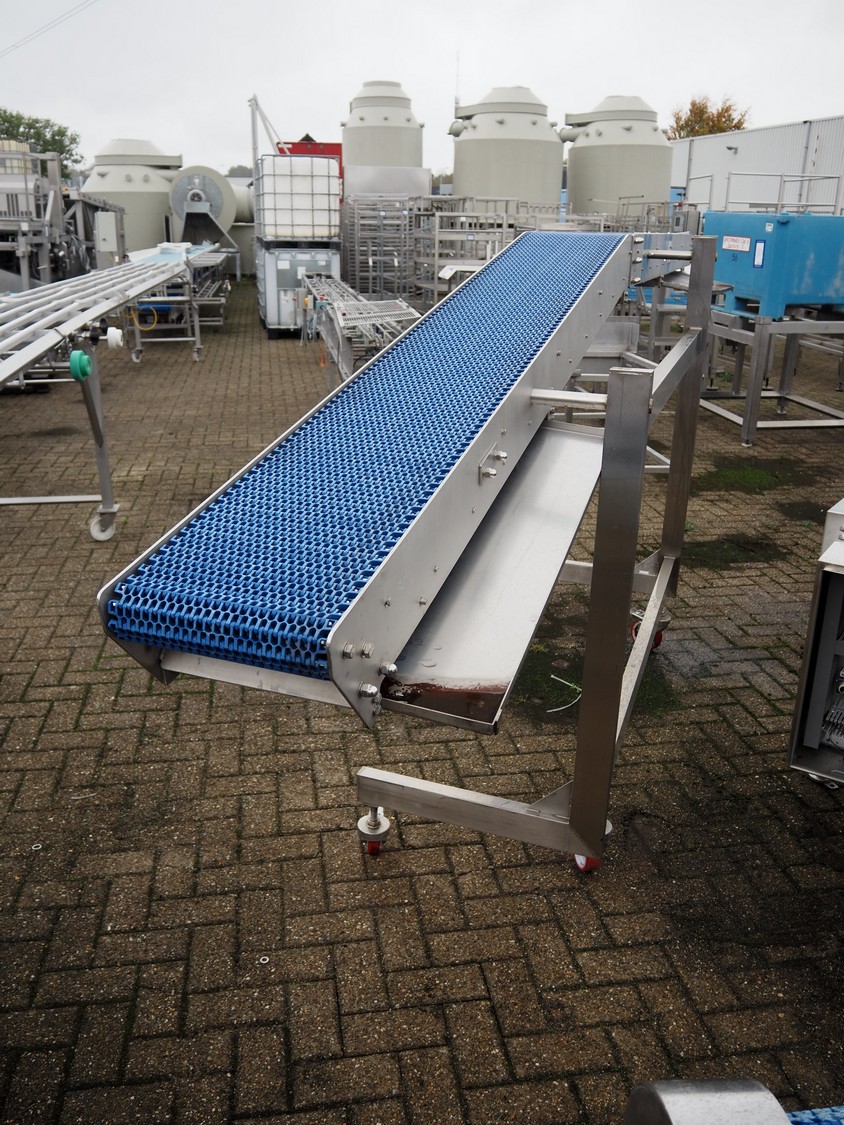 L.A.C. Conveyor Systems mobile elevating belt, s/s frame, plastic mesh belt, belt width: 300 mm, elevating height: 1520 mm, total dimensions: 4500 mm x 600 mm x 1550 mm. Incomplete.