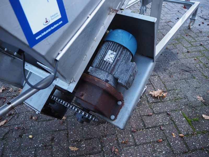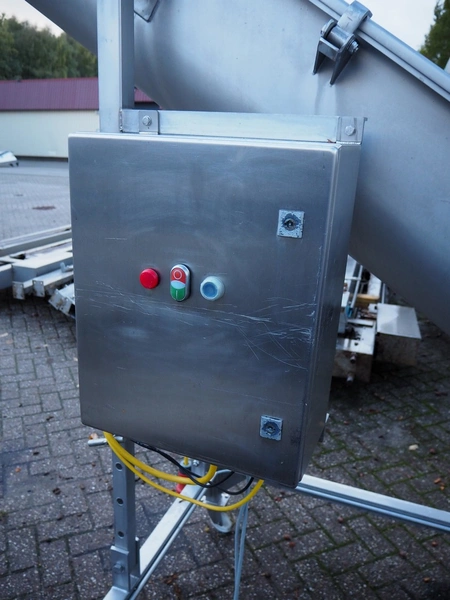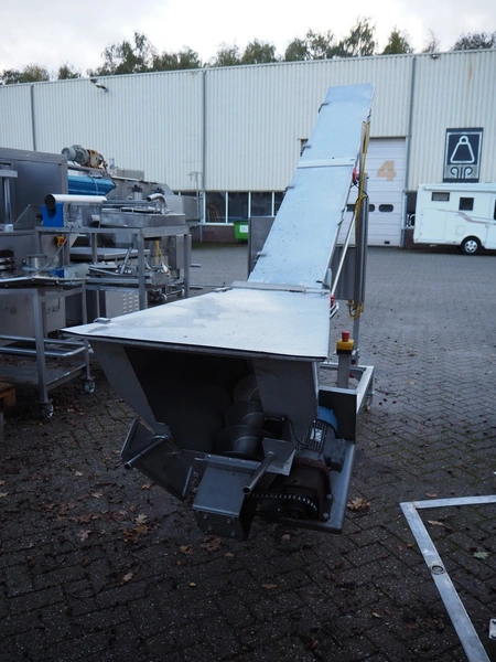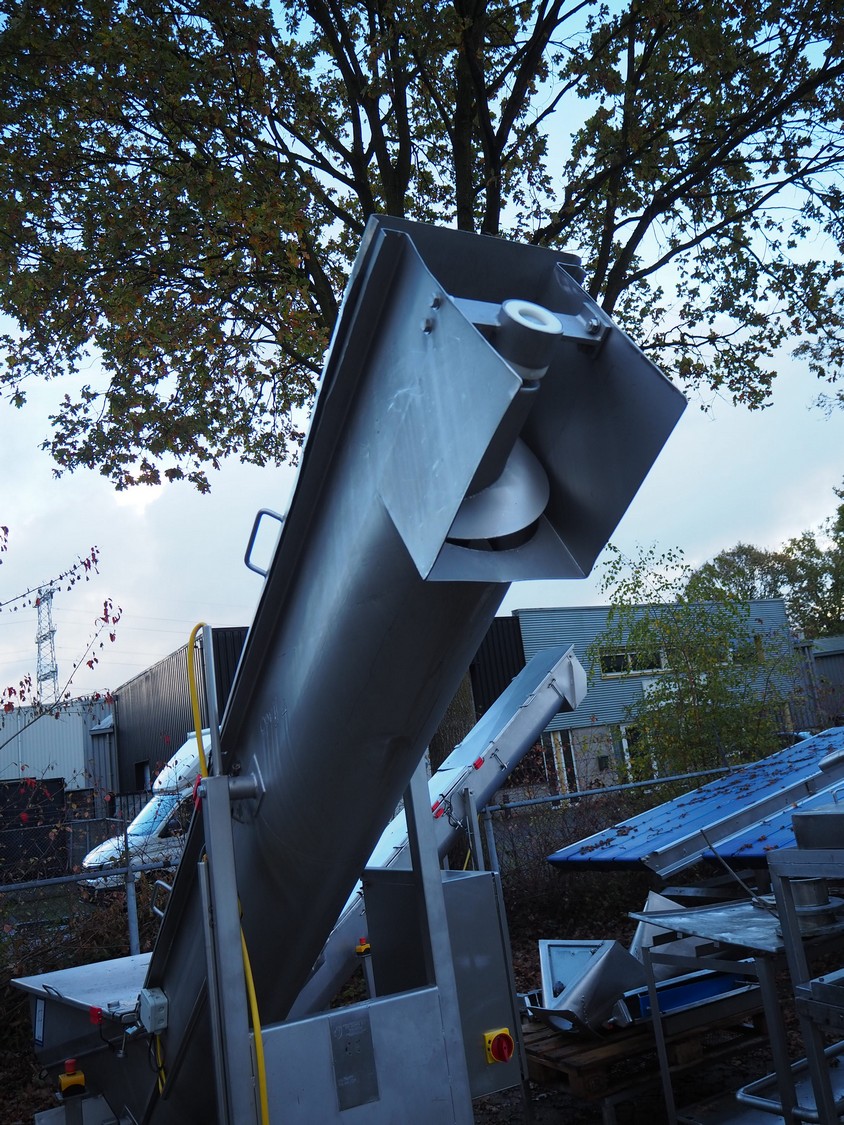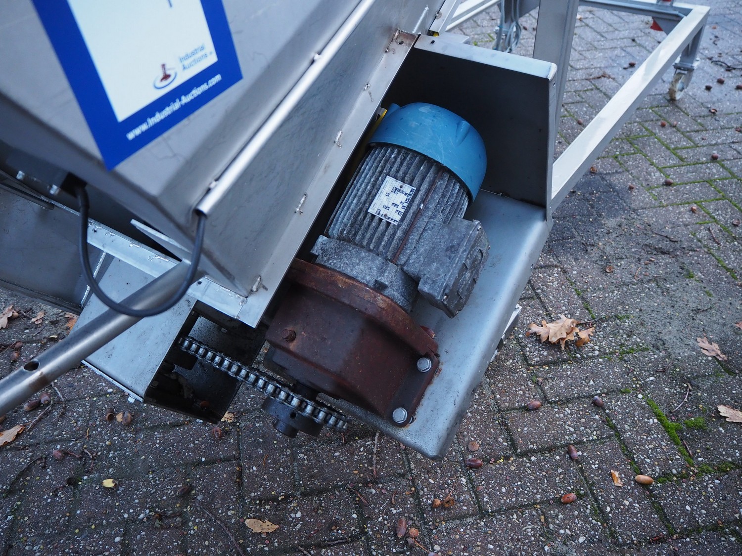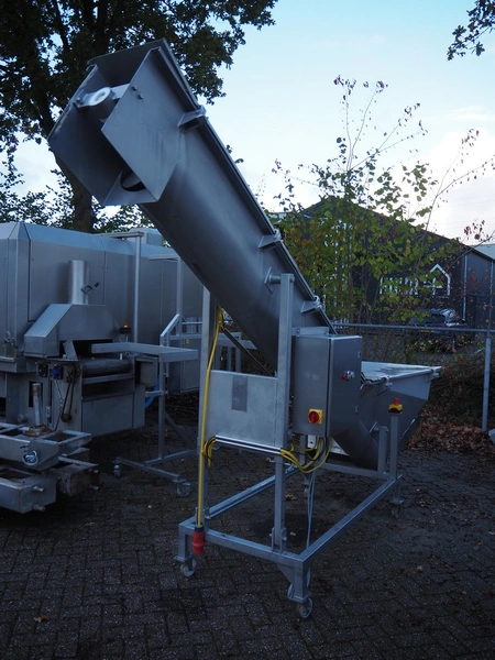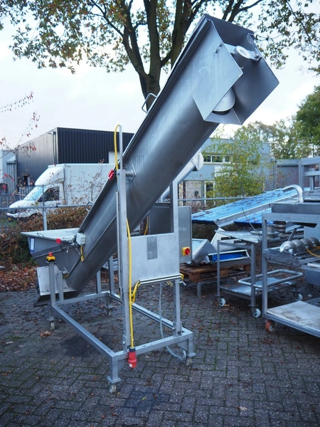 Roestvrijstalen-Apparatenbouw De Jager BV mobile elevating screw, number: 689.010, year of construction: March 1995, s/s screw, diameter screw: 250 mm, tier: 140 mm, elevating height: 2100 mm, total dimensions: 3800 mm x 1100 mm x 2600 mm.