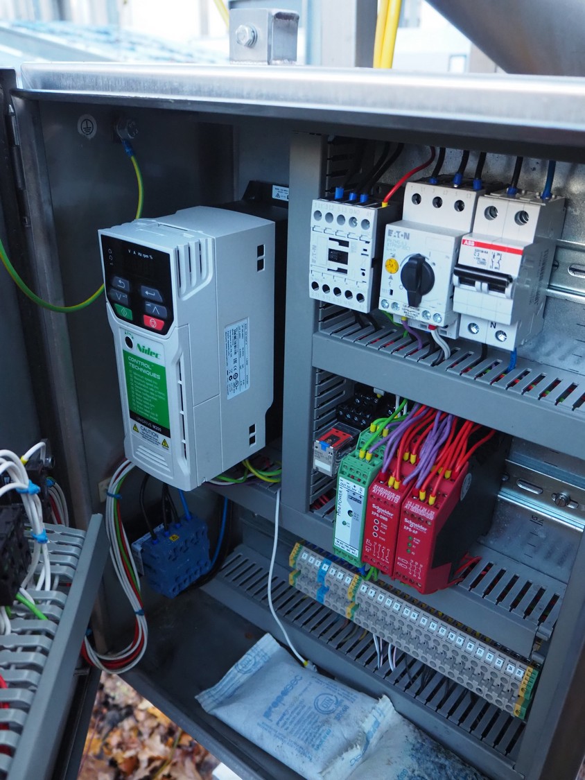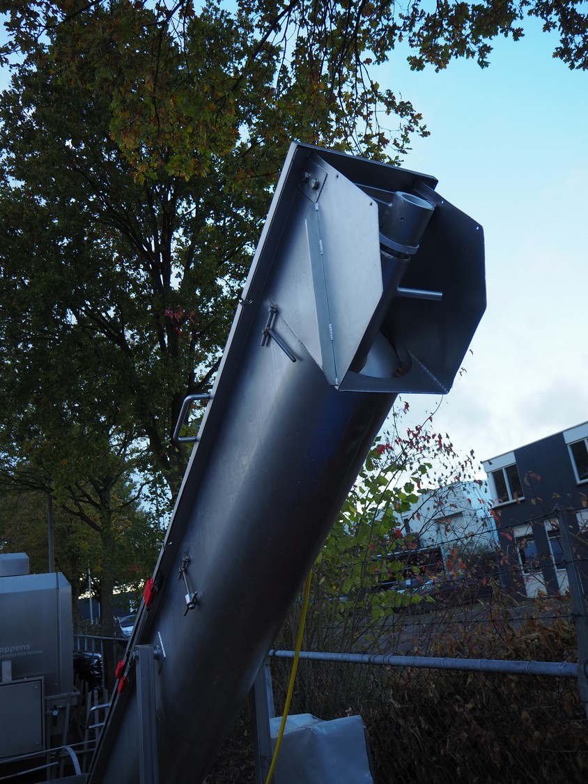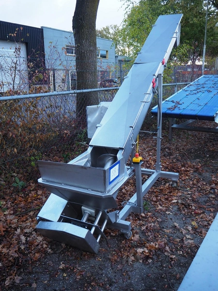Mobile elevating screw, s/s screw, diameter screw: 300 mm, tier: 160 mm, elevating height: 2200 mm, total dimensions: 3400 mm x 1300 mm x 2650 mm.