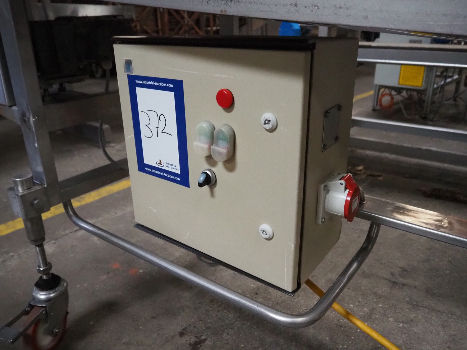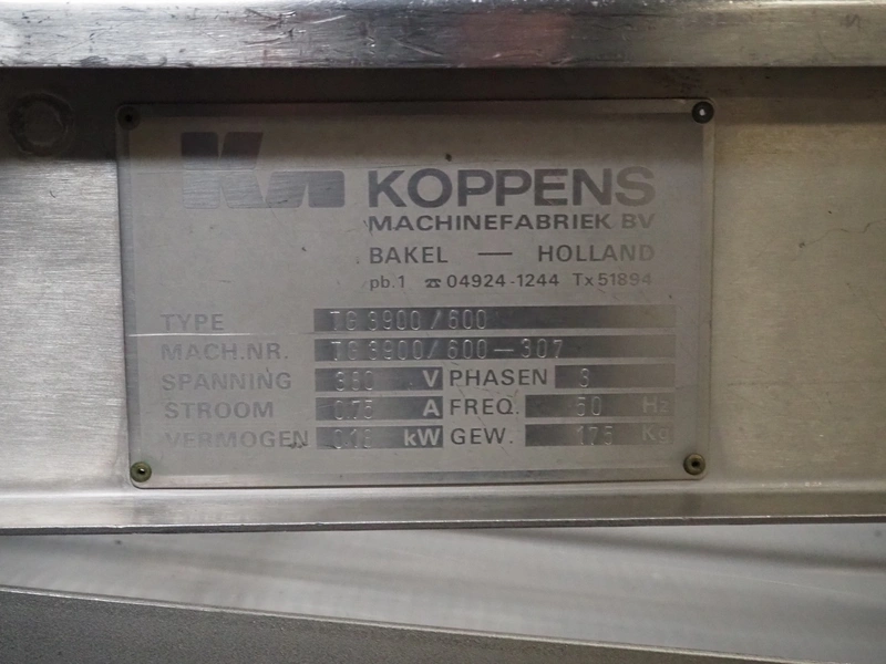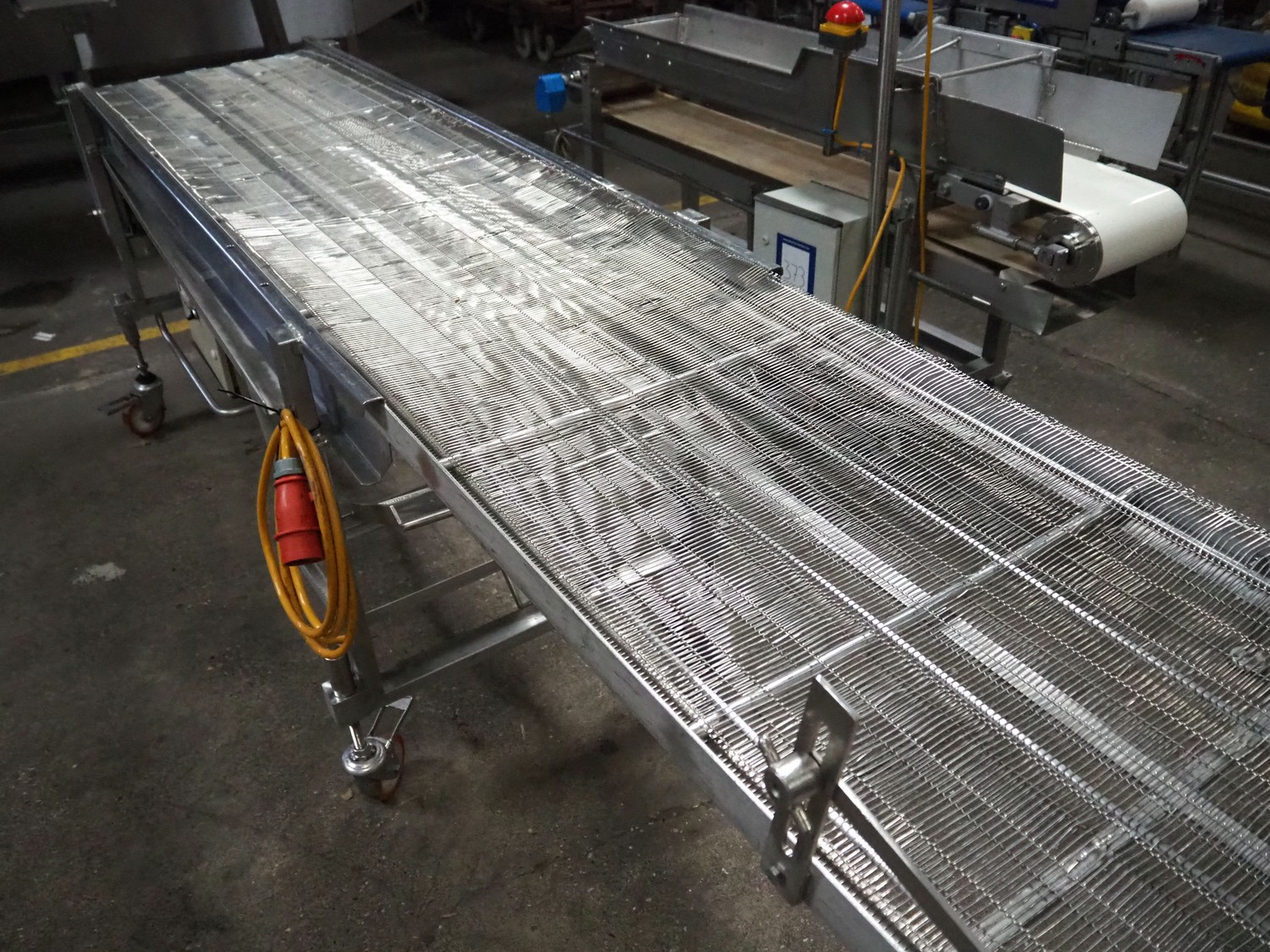 Koppens Machinefabriek BV mobile mesh belt, type: TG 3900 / 600, number: 307, 380 V, 3 Ph, 50 Hz, 0.75 A, 0.18 kW, weight: 175 kg, s/s mesh belt, belt width: 600 mm, total dimensions: 4200 mm x 850 mm x 1150 mm.