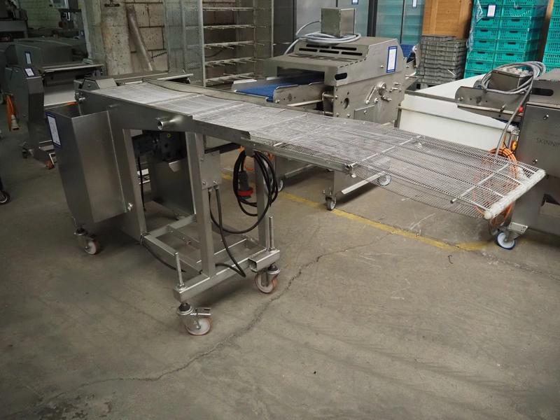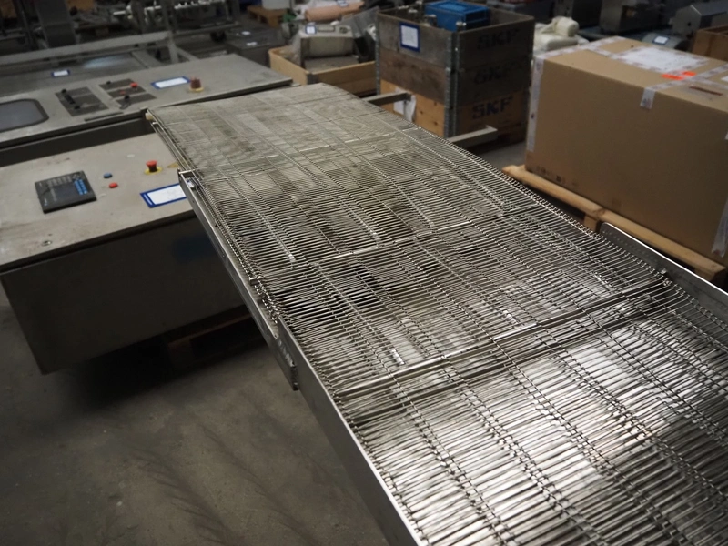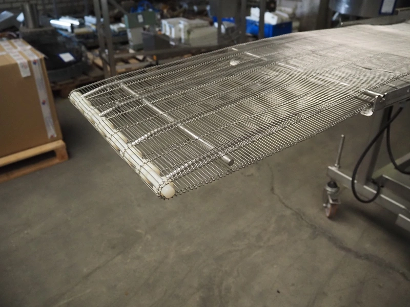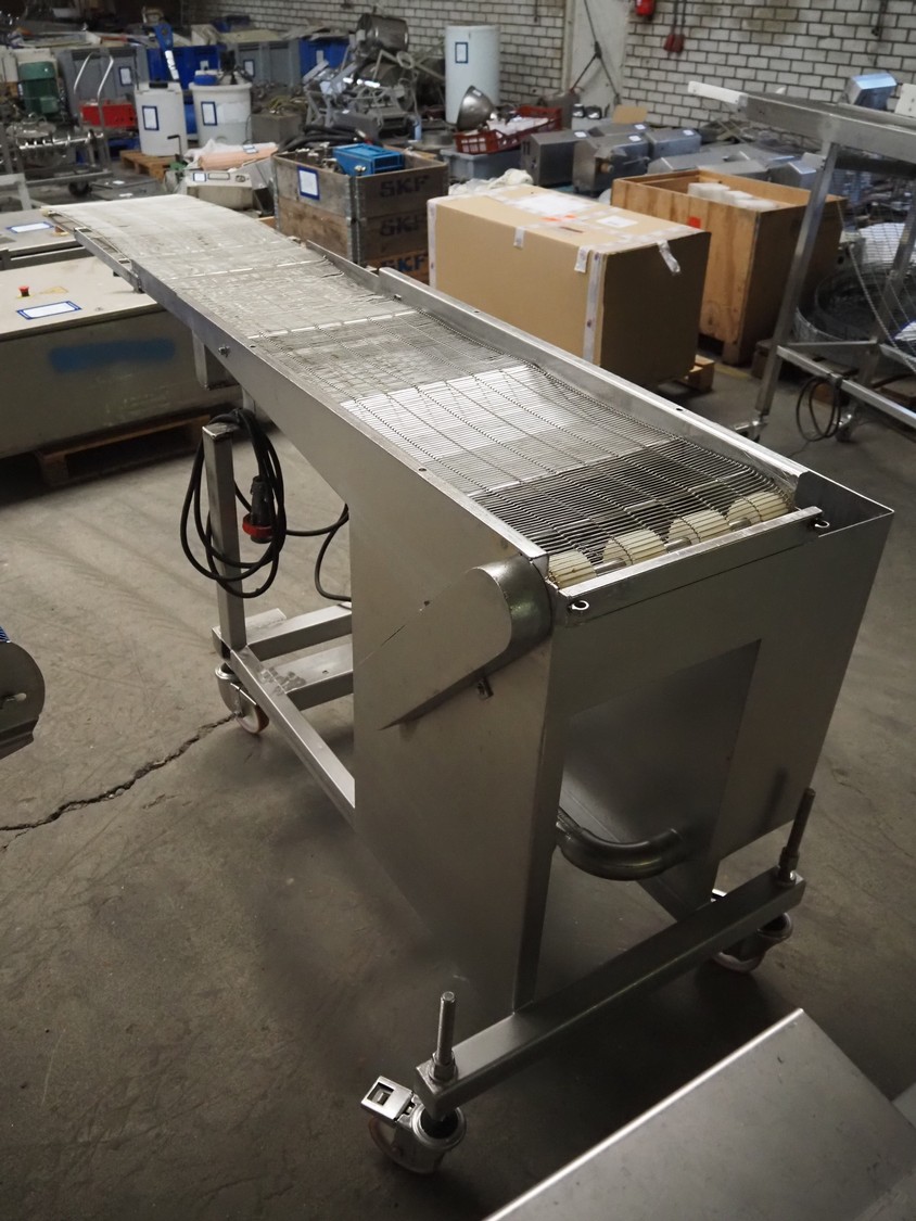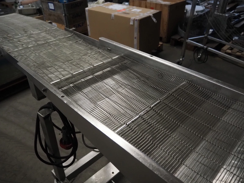 Mobile mesh belt, s/s belt, belt width: 400 mmm, total dimensions: 2450 mm x 800 mm x 1100 mm.