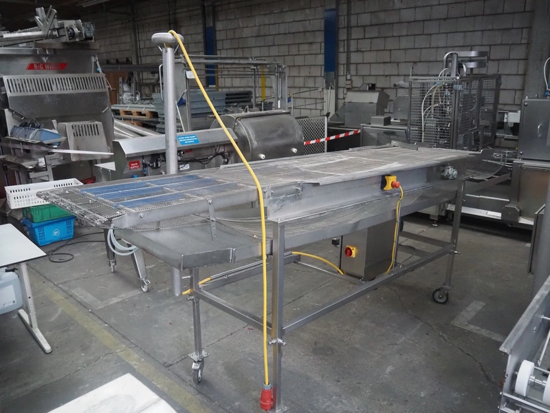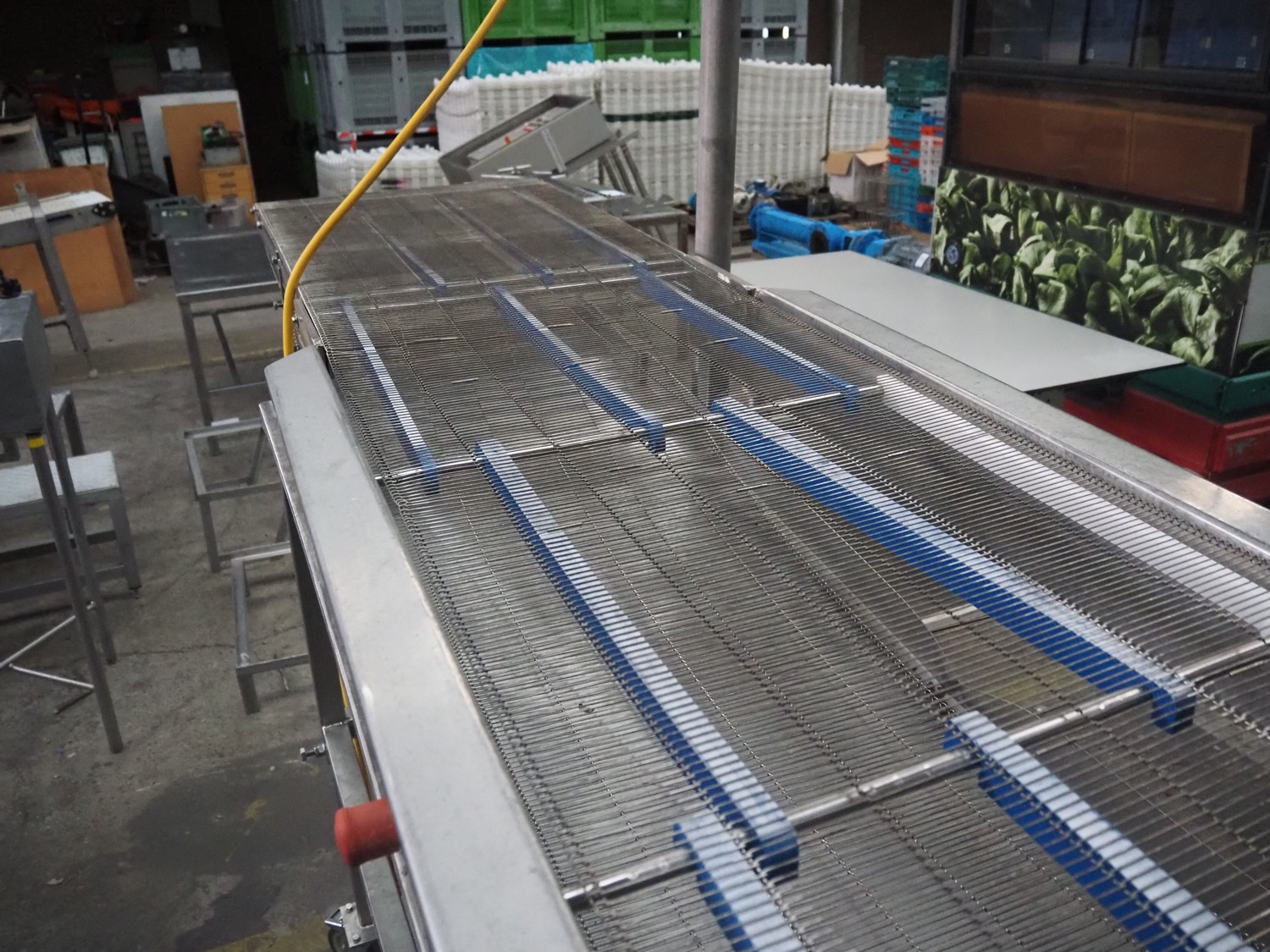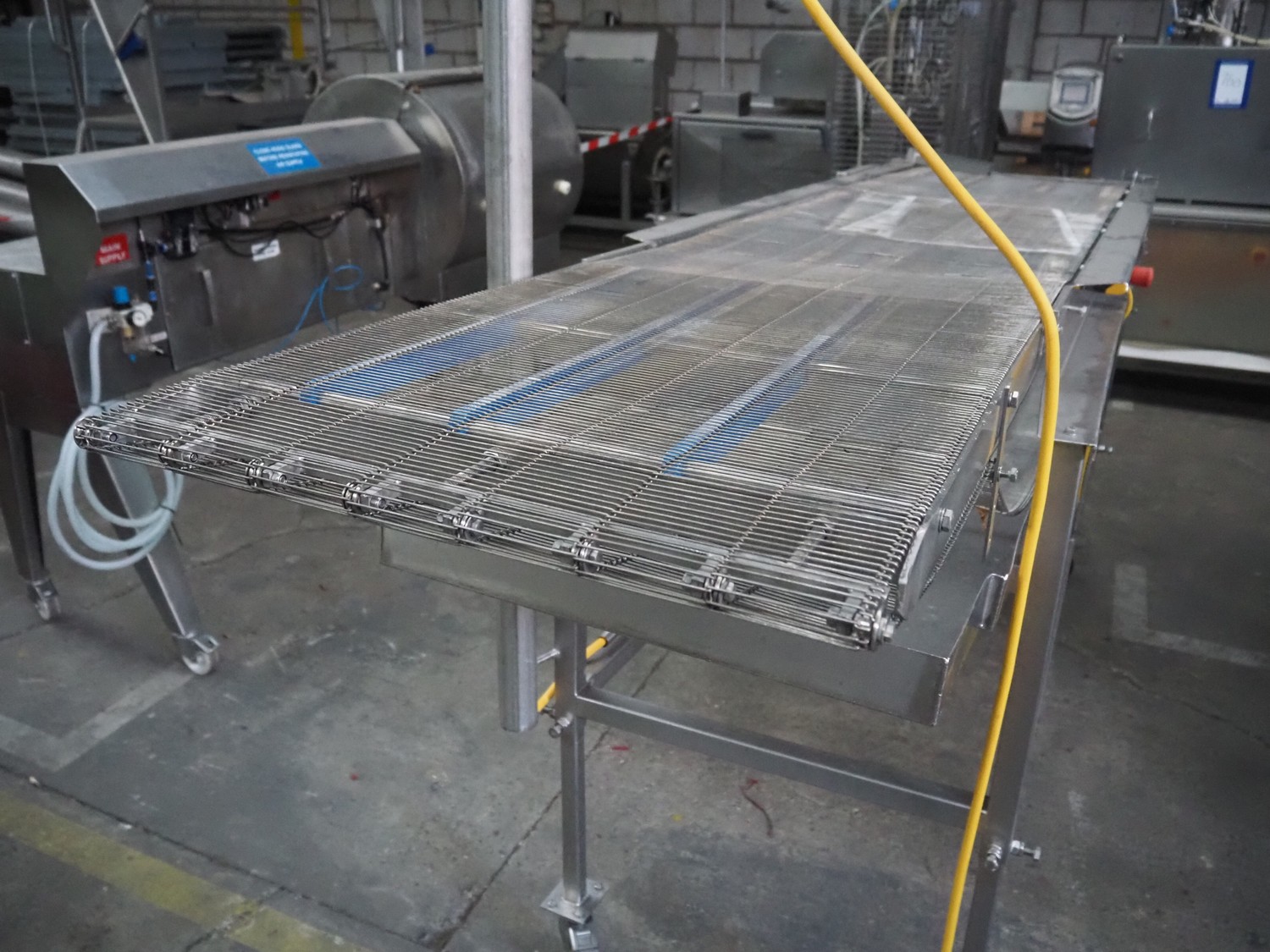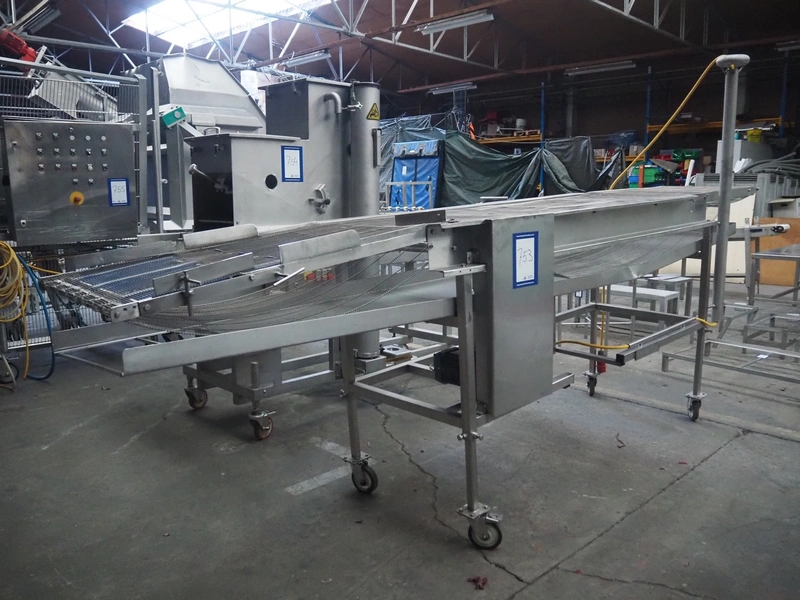 Mobile mesh belt, s/s frame, s/s mesh belt, belt width: 580 mm, total dimensions: 3900 mm x 760 mm x 1850 mm.