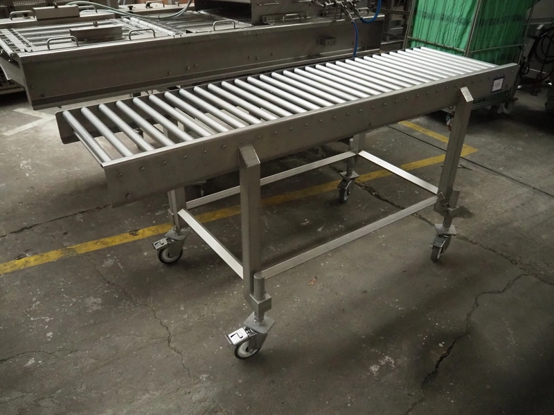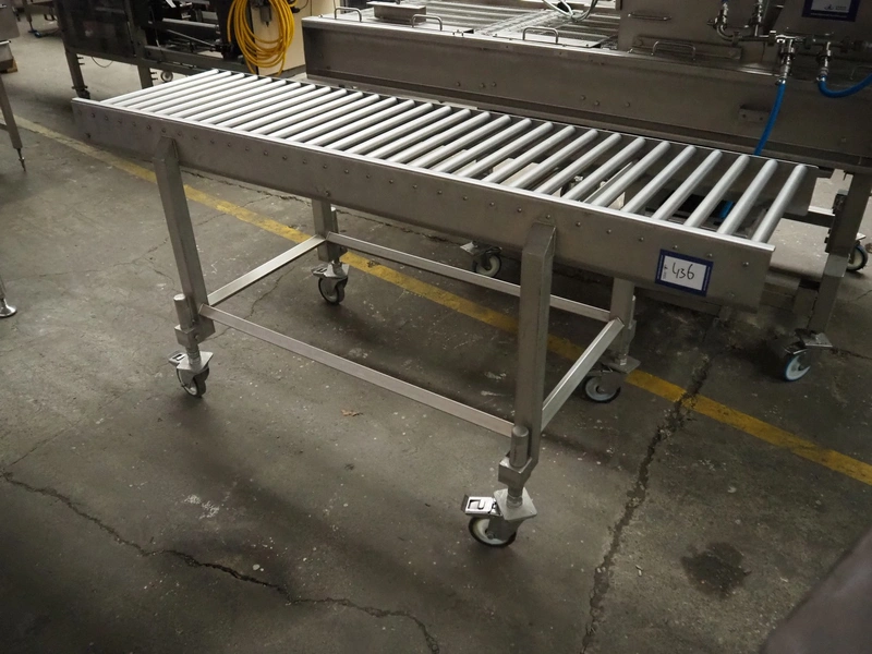 Mobile roller conveyor, s/s rollers, roller width: 530 mm, total dimensions: 2025 mm x 700 mm x 915 mm.