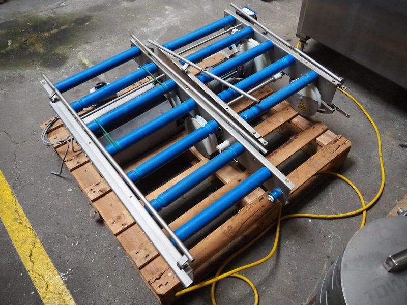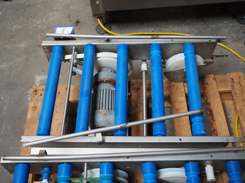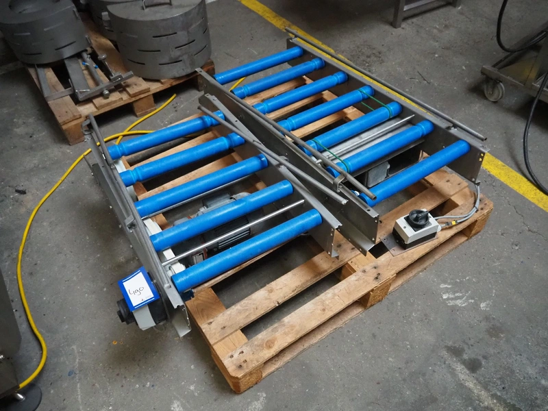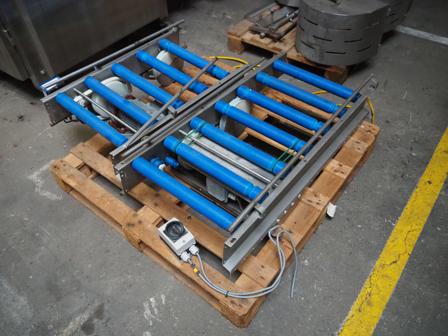 2 Stork roller conveyors, plastic rollers, rollers width: 445 mm and 435 mm, total dimensions: 900 mm x 650 mm x 350 mm and 1100 mm x 530 mm x 330 mm.