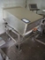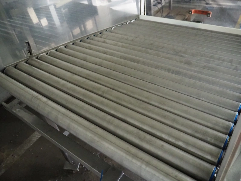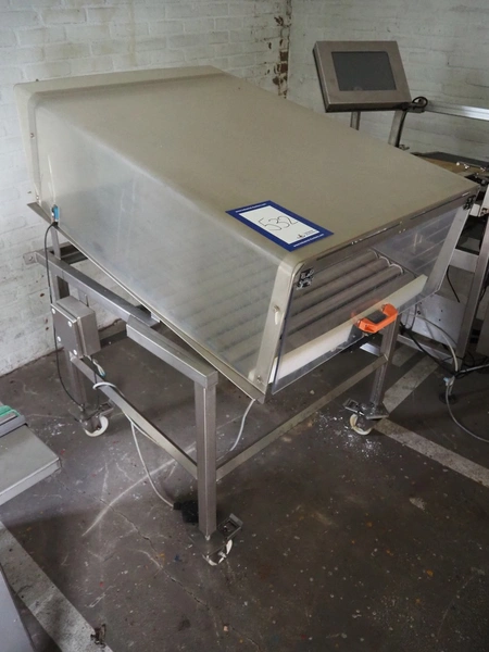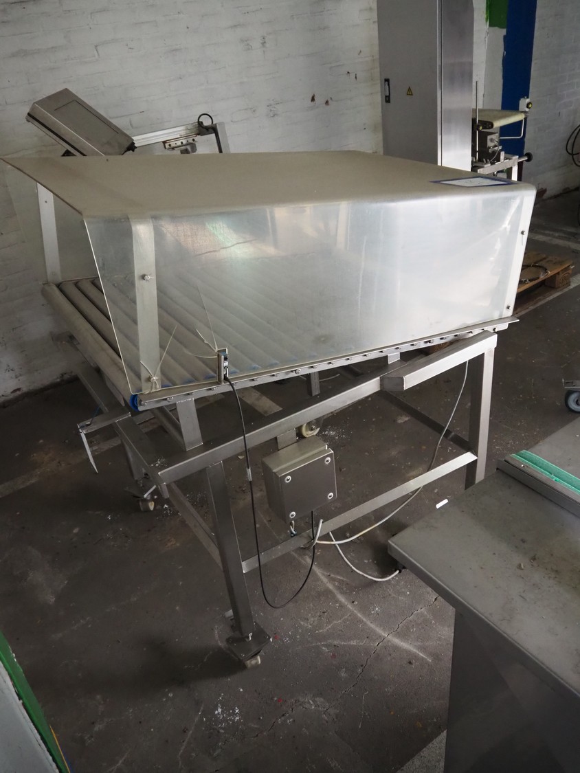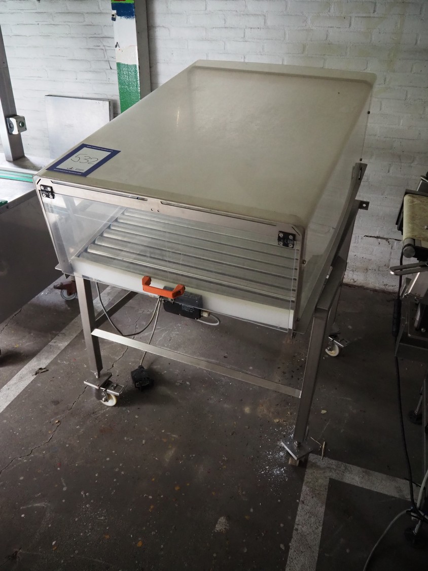 Mobile de-elevating roller conveyor, s/s rollers, roller length: 790 mm, de-elevating height: from 1000 mm to 800 mm, total dimensions: 1170 mm x 850 mm x 1350 mm.