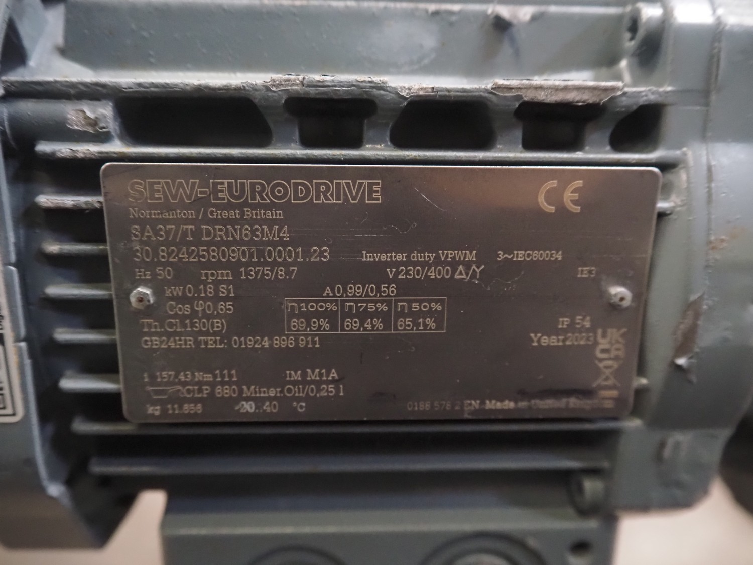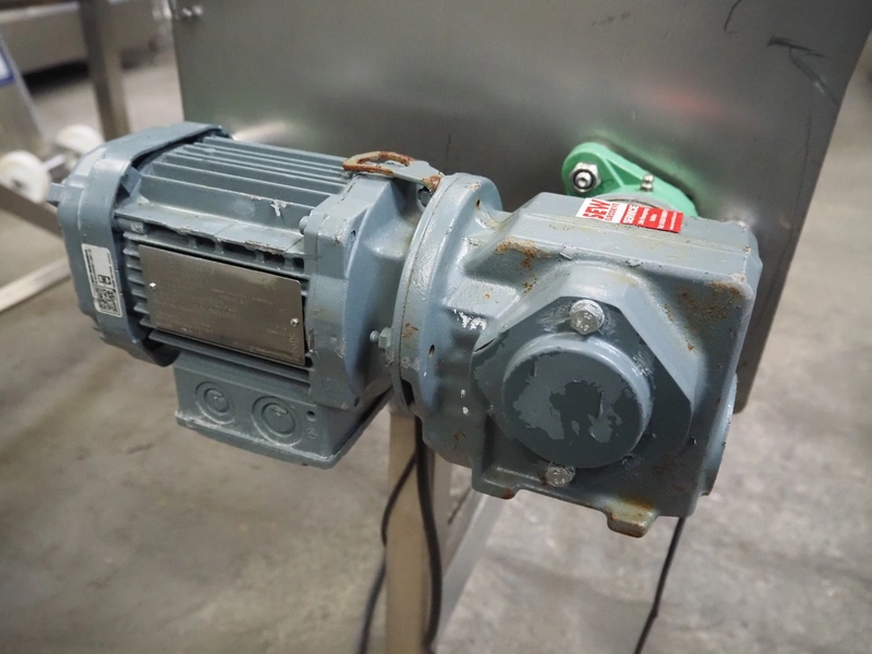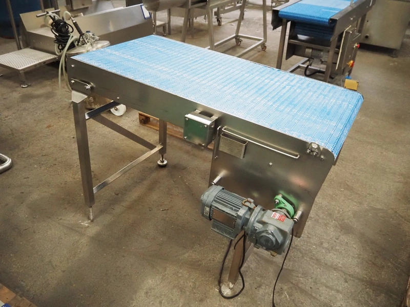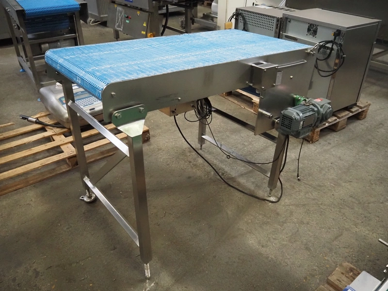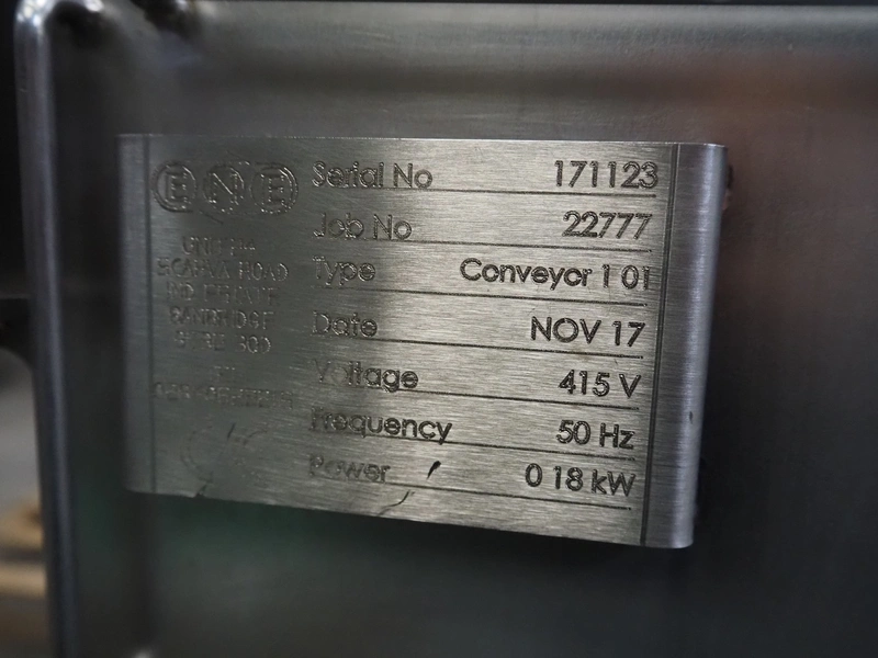 ENE transport belt, type: Conveyor 1 01, serial number: 171123, year of construction: 11/2017, 415 V, 50 Hz, 0.18 kW, plastic belt, belt width: 610 mm, total dimensions: 1270 mm x 900 mm x 950 mm.