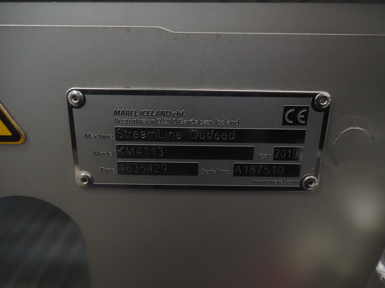 Marel Iceland ehf. Streamline outfeed belt, machine: StreamLine Outfeed, model: KM4113, type: 4635429, serial number: A187510, year of construction: 2019, s/s frame, plastic belt, belt width: 610 mm, total dimensions: 2450 mm x 1600 mm x 1750 mm.