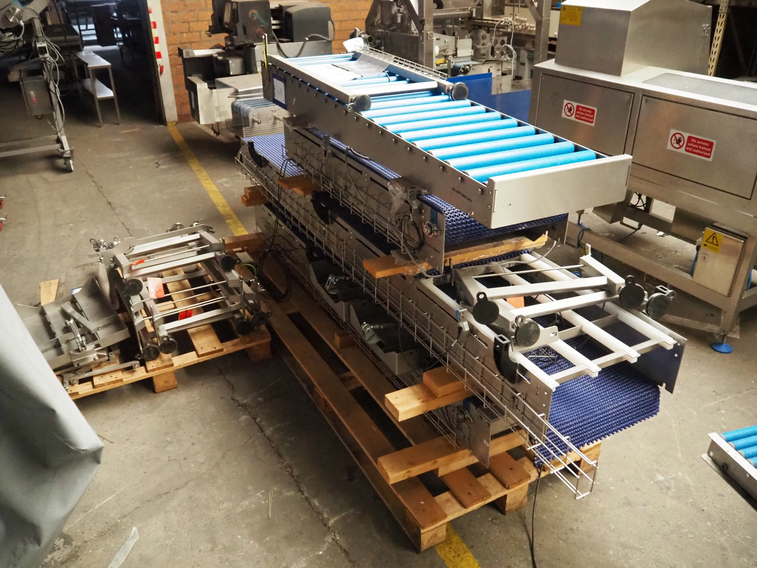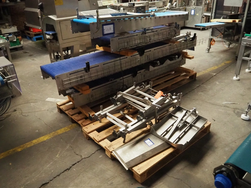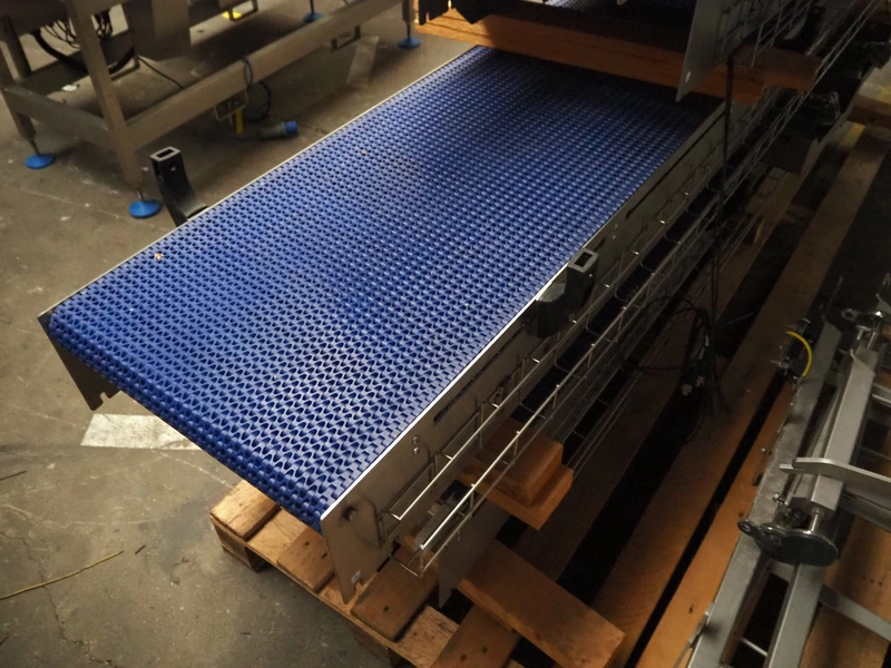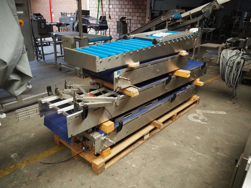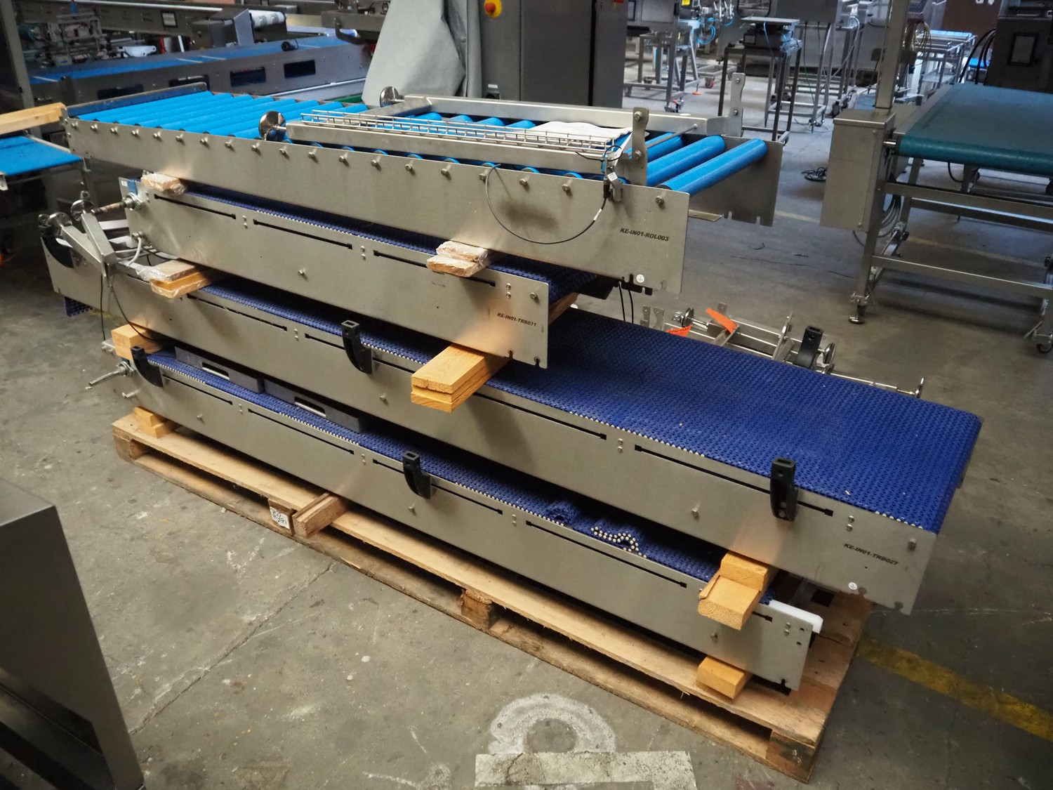 (3x) AER transport belt and roller conveyor, plastic mesh belts, belt width: 500 mm, plastic rollers, roller width: 500 mm, total dimensions: 3150 mm x 800 mm x 1500 mm. Including pallet with s/s legs, dimensions: 1200 mm x 1000 mm x 500 mm.