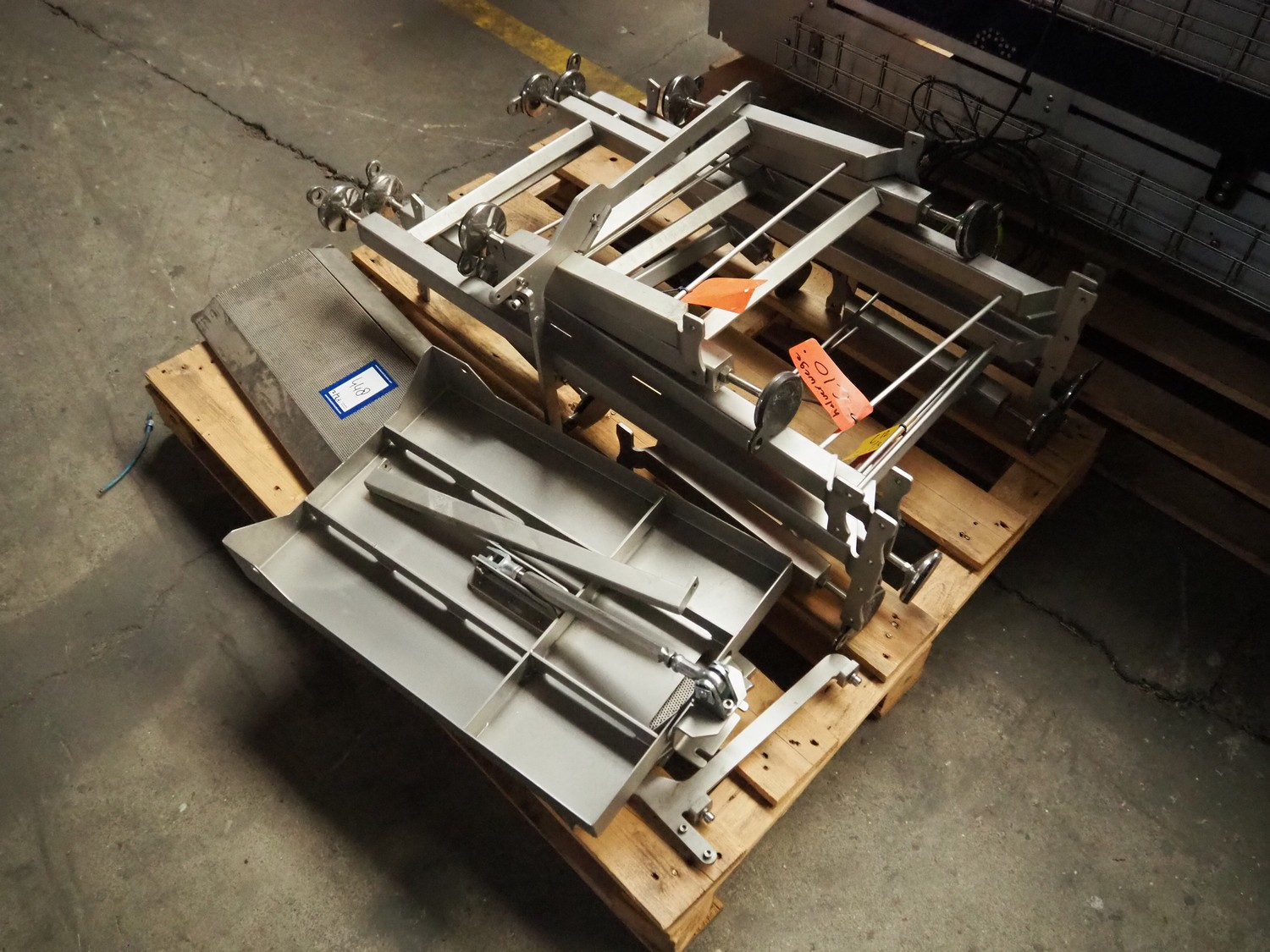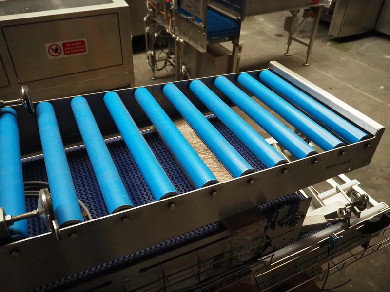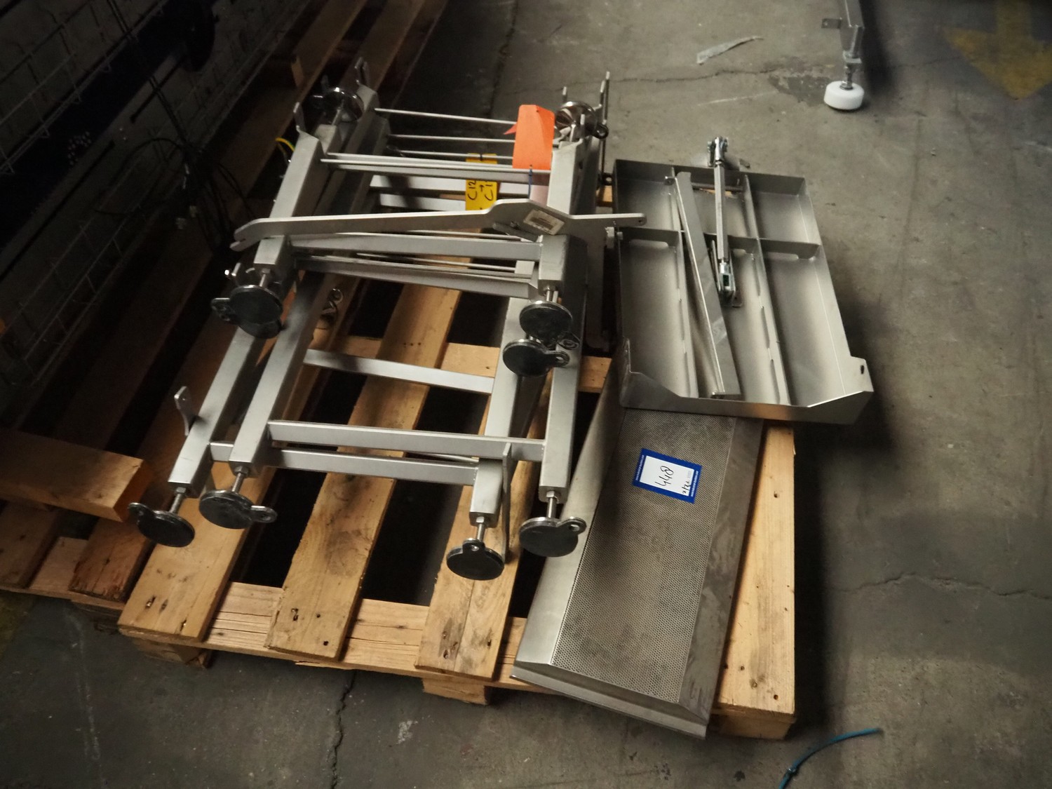 (3x) AER transport belt and roller conveyor, plastic mesh belts, belt width: 500 mm, plastic rollers, roller width: 500 mm, total dimensions: 3150 mm x 800 mm x 1500 mm. Including pallet with s/s legs, dimensions: 1200 mm x 1000 mm x 500 mm.