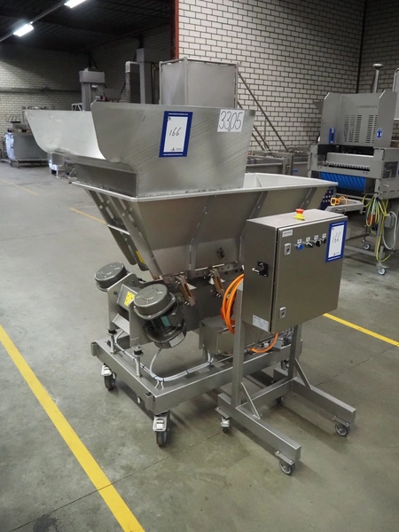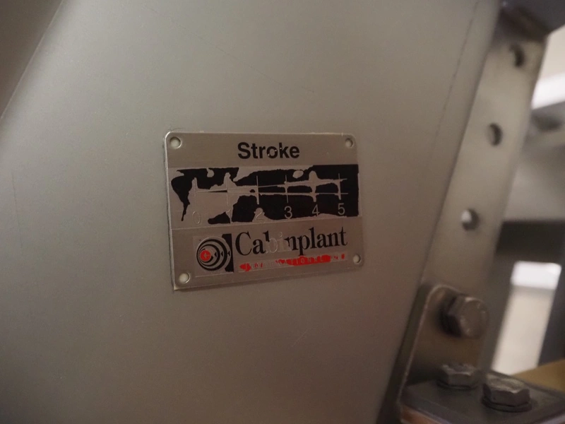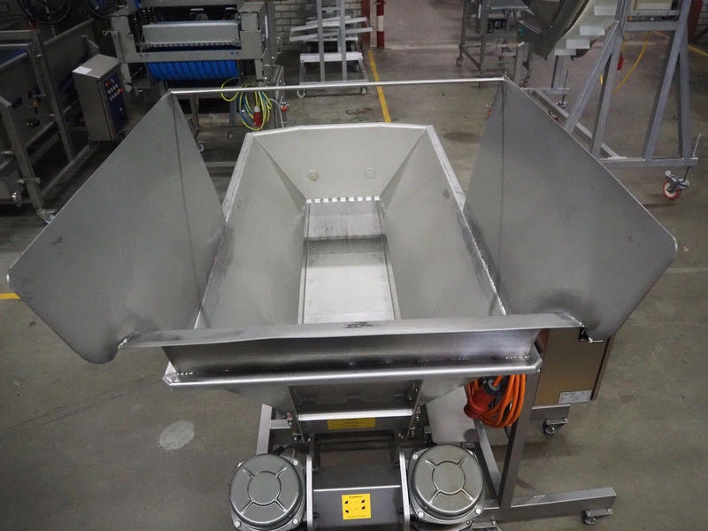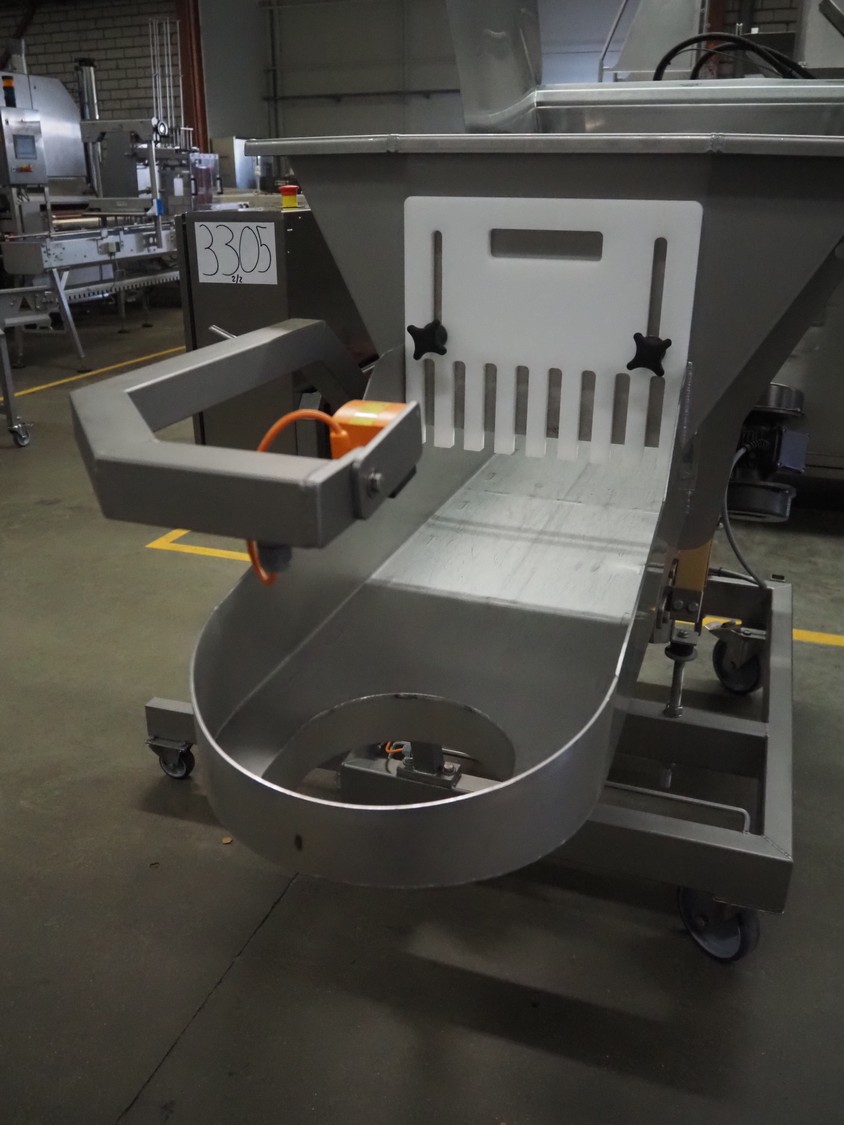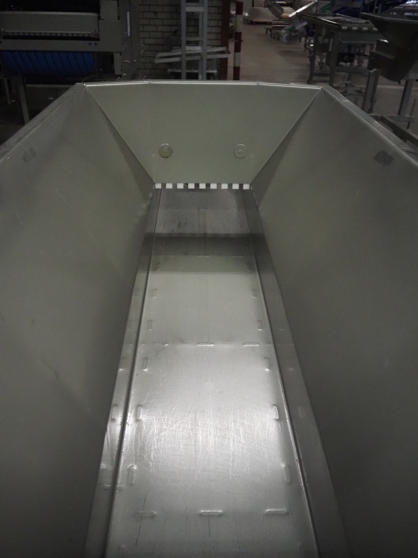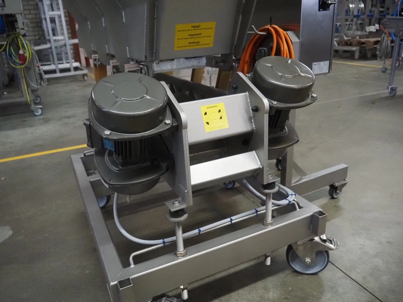 Cabinplant mobile s/s vibrating gutter, type: CR-030/157BTM, serial number: 108675-001, year of construction: 2012, 400V, 50Hz, 0.3kW, weight: 217 kg, gutter width: 315 mm, gutter length: 1470 mm, stroke: 1-5 mm, outfeed height: 800 mm, total dimensions: 2250 mm x 1400 mm x 1700 mm.