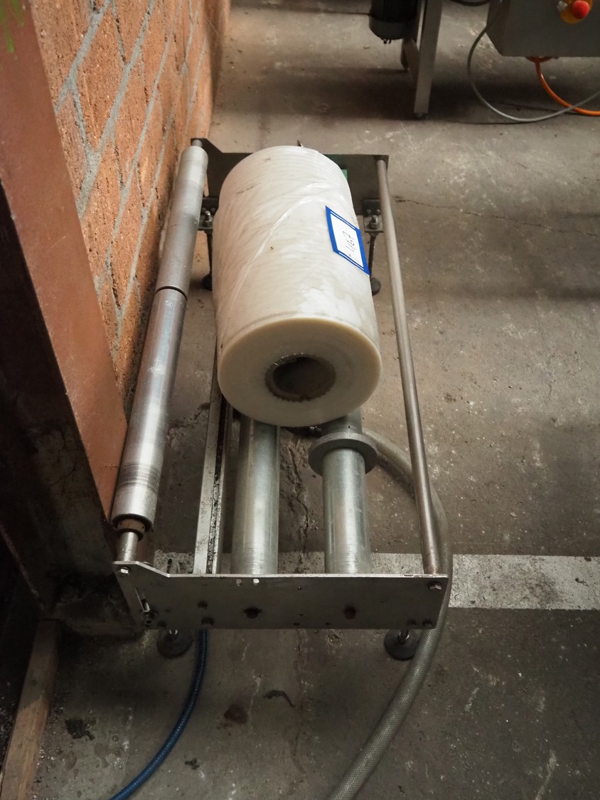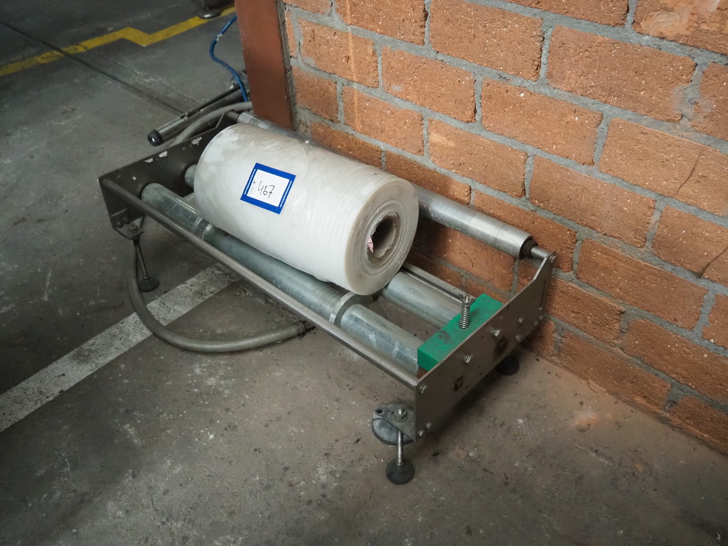 Film unwinding device with film roll, film width: 385 mm, total dimensions: 900 mm x 380 mm x 350 mm.