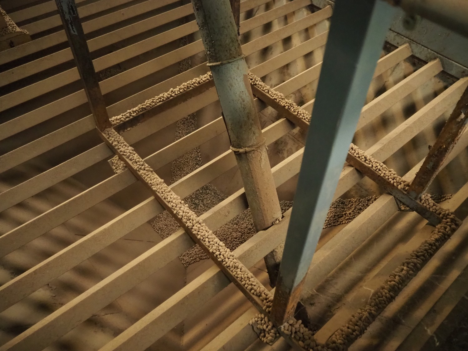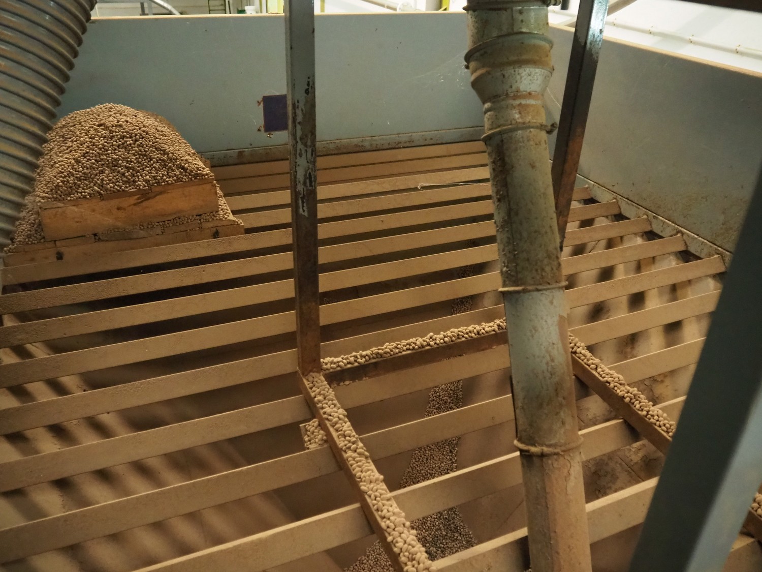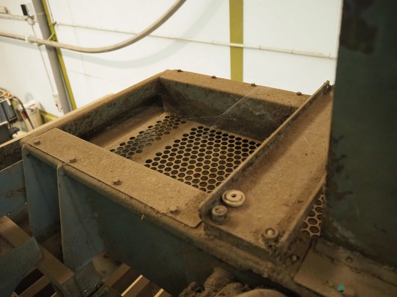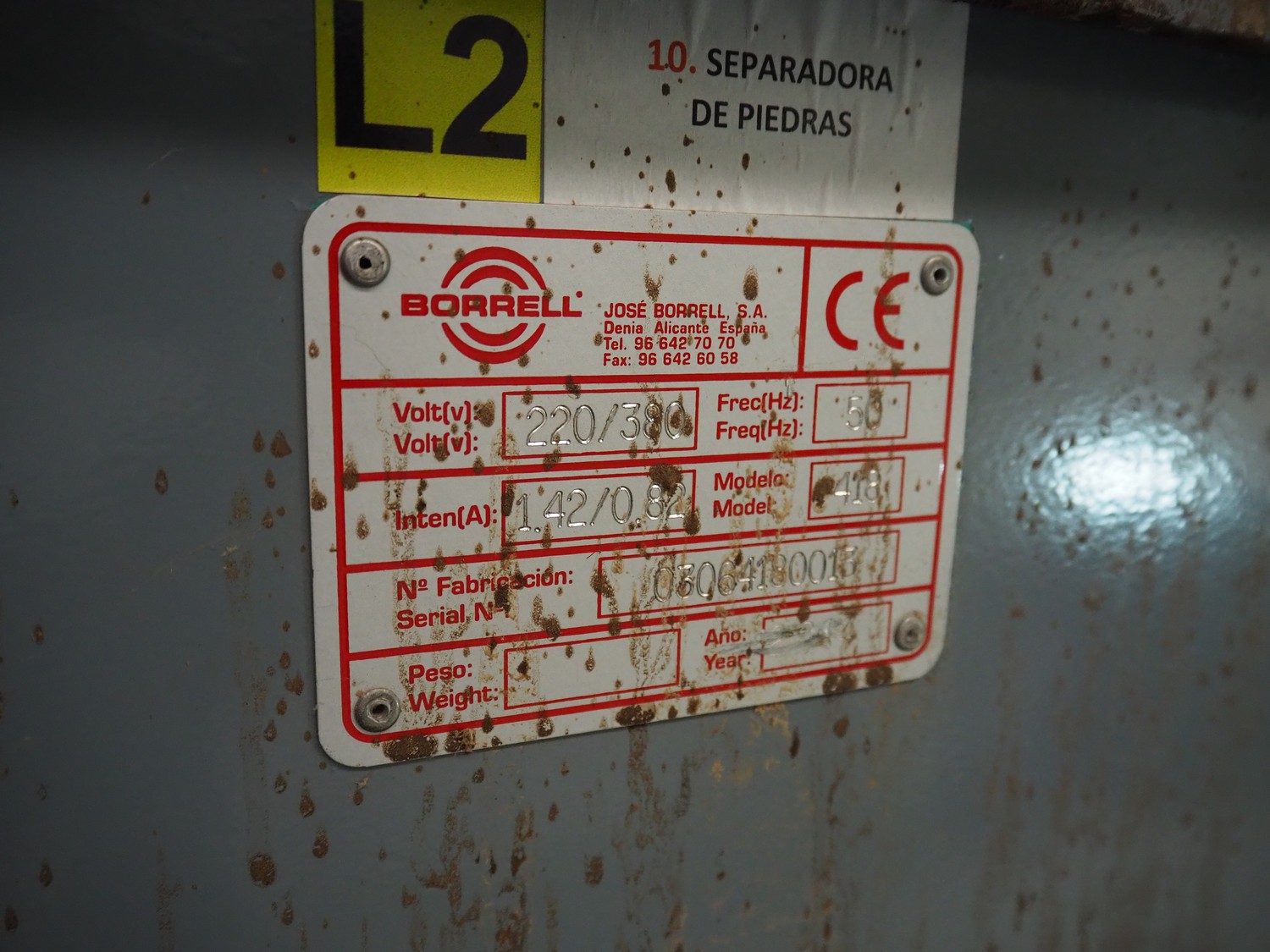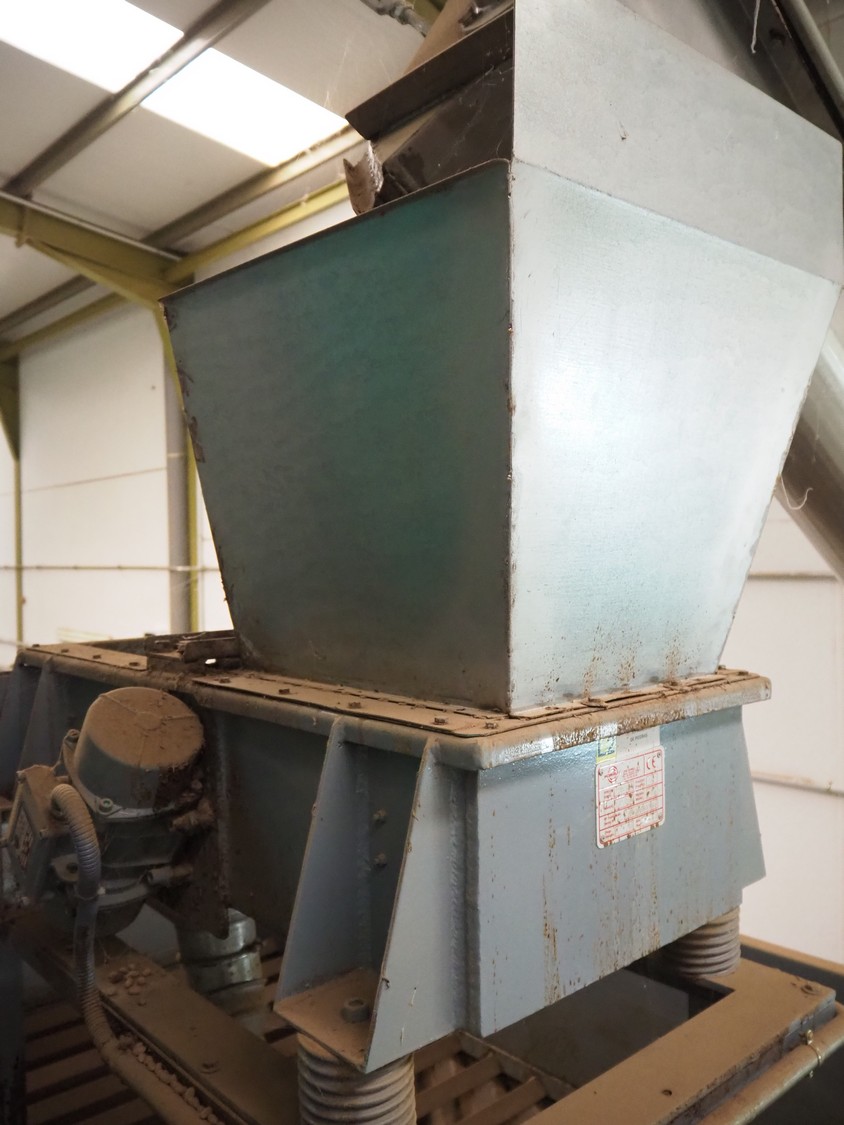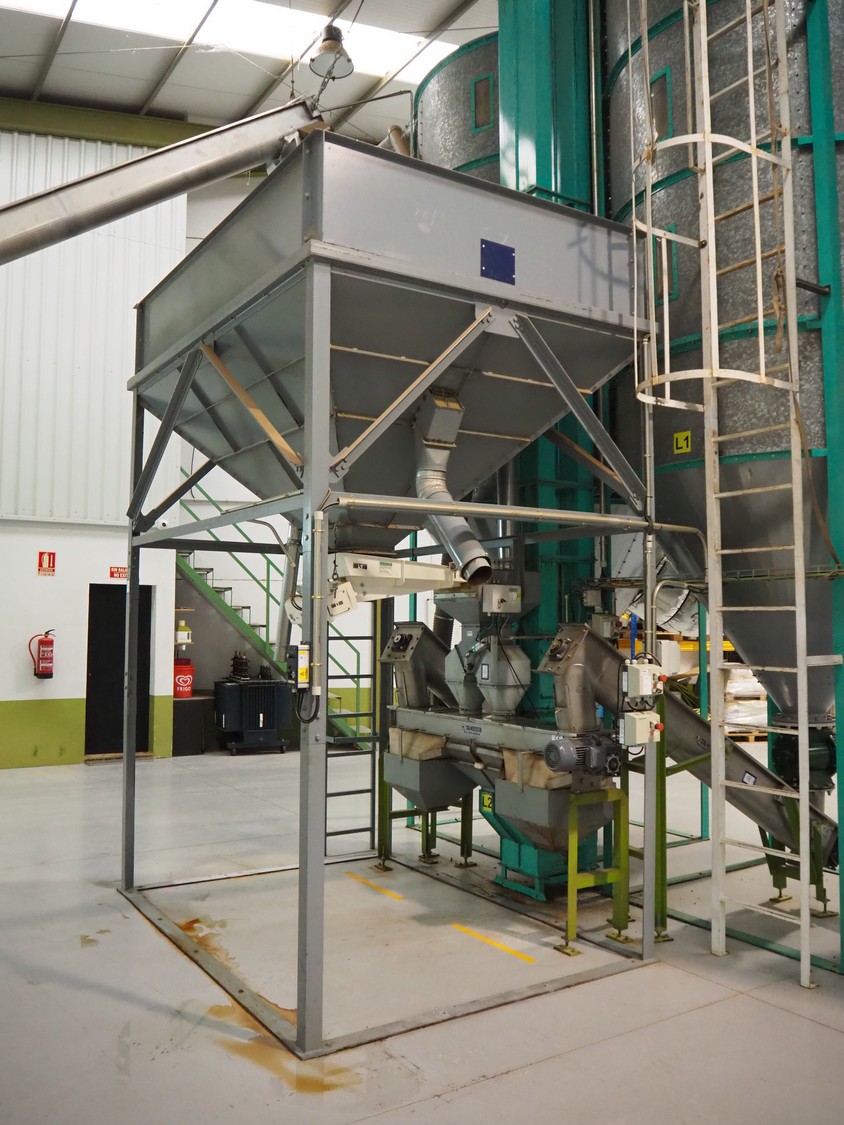 José Borrell S.A. de-stoner with steel infeed bunker and infeed- and outfeed vibrating gutters, model: 418, serial number: 0306418001, 220/380 V, 50 Hz, 1.42/0.82 A, infeed dimensions: 2650 mm x 1950 mm, total dimensions: 2800 mm x 2050 mm x 4000 mm.
