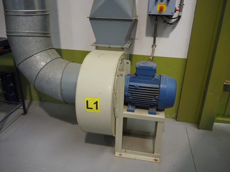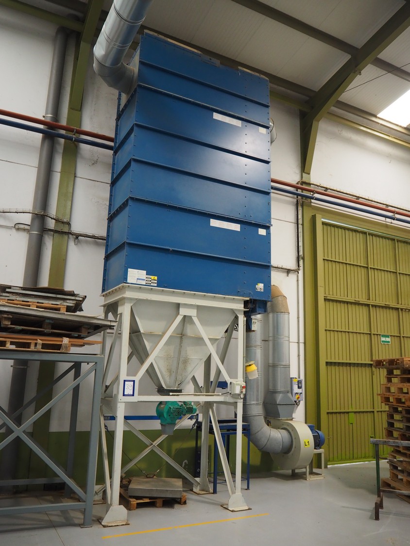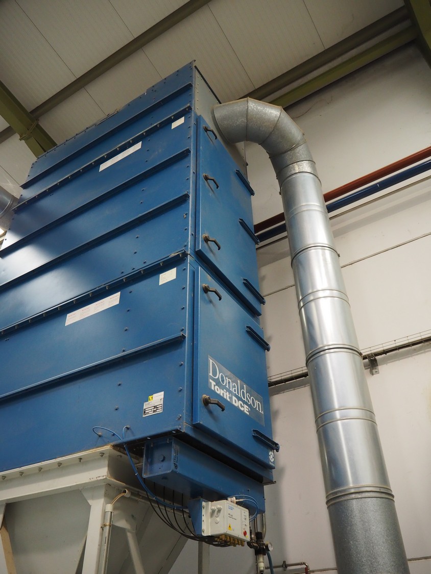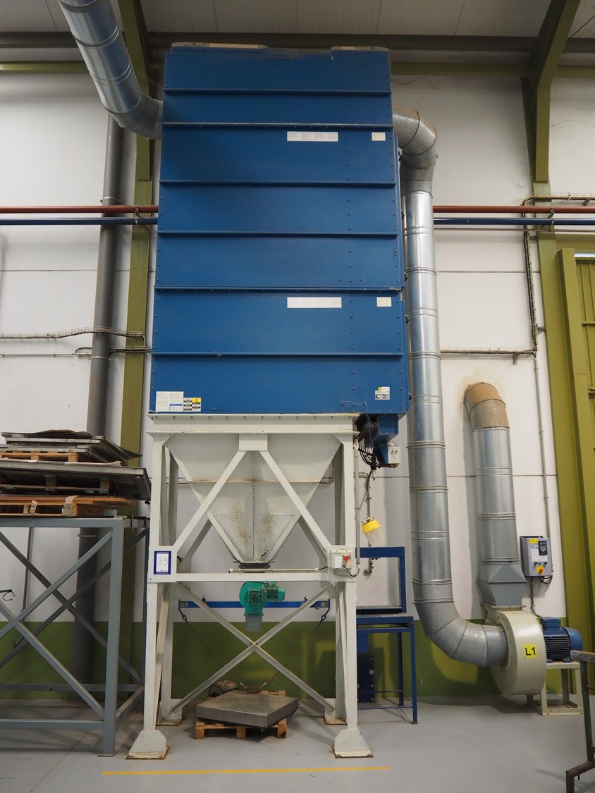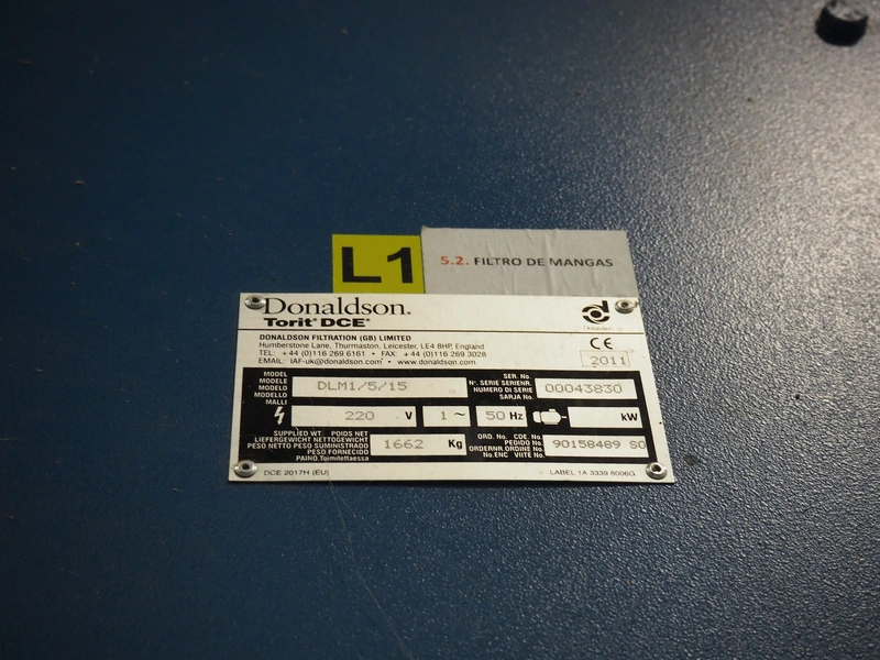 Donaldson dust collector, model: DLM1/5/15, serial number: 00043830, year of construction: 2011, 220 V, 1 Ph, 50 Hz, weight: 1662 kg, dimensions: 2250 mm x 1100 mm x 6200 mm, with Sodeca blower, type: CAS-1250-2T-15/A, dimensions: 800 mm x 1000 mm x 950 mm.