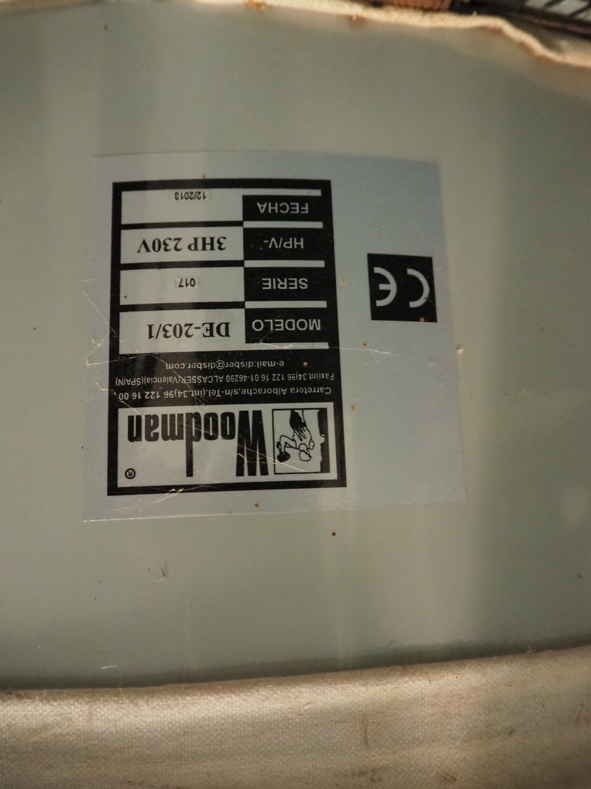 Woodman mobile dust collector, model: DE-203/1, serial number: 017, year of construction: 12/2013, 230 V, 3 HP, dimensions: 850 mm x 600 mm x 1900 mm.