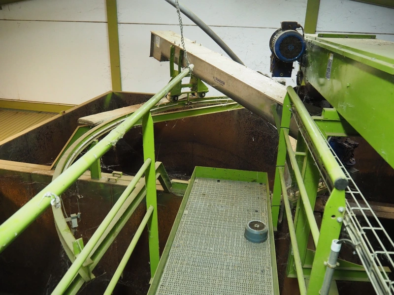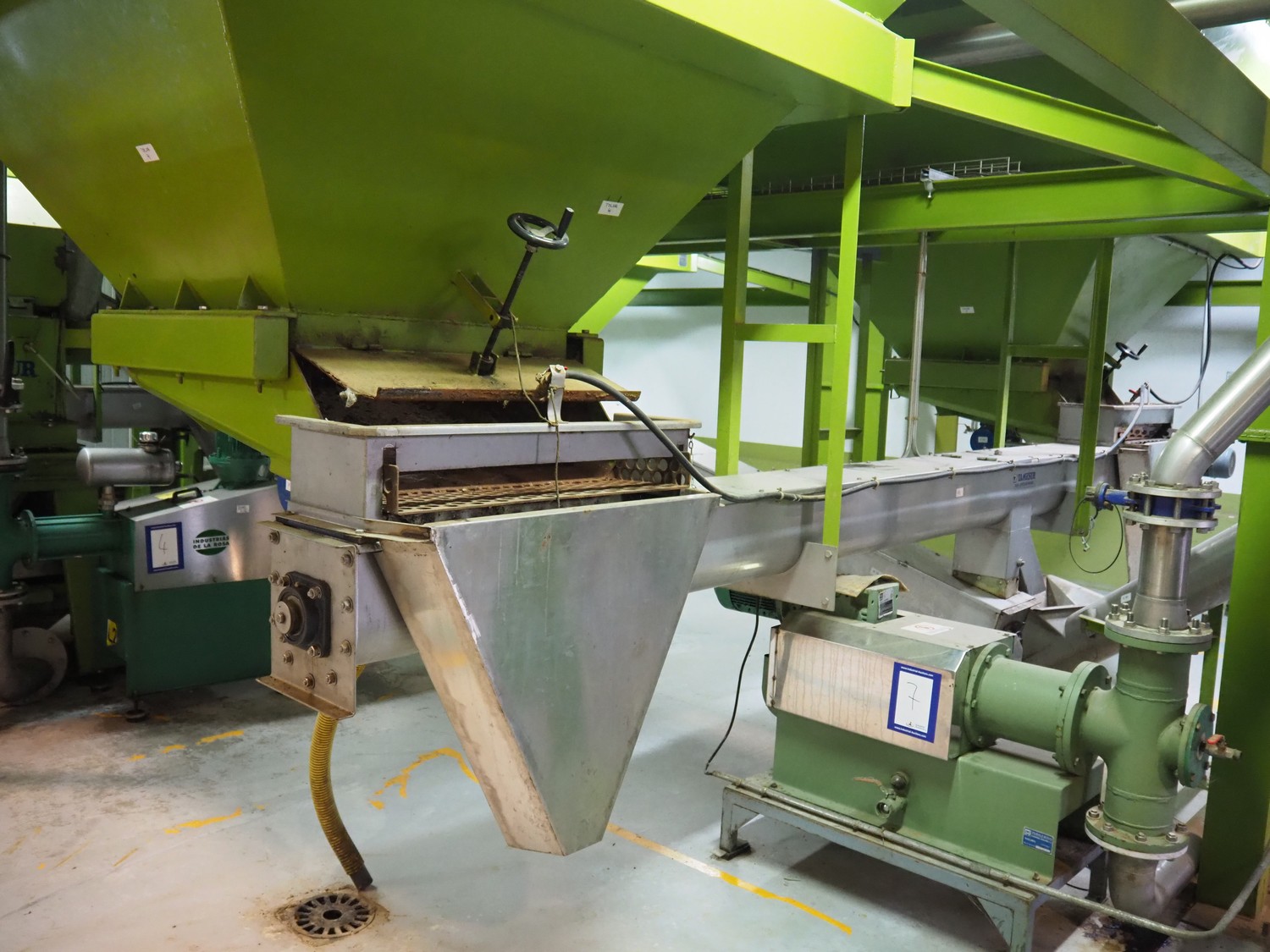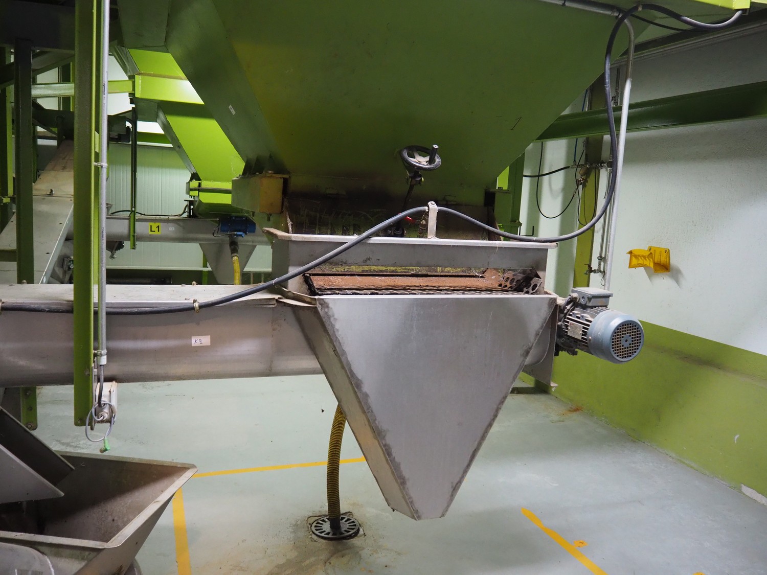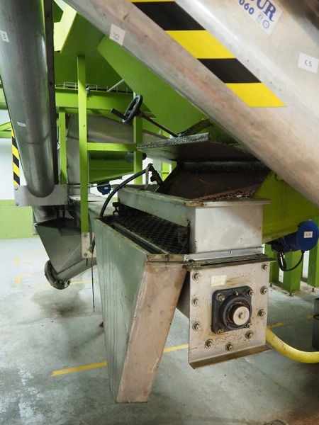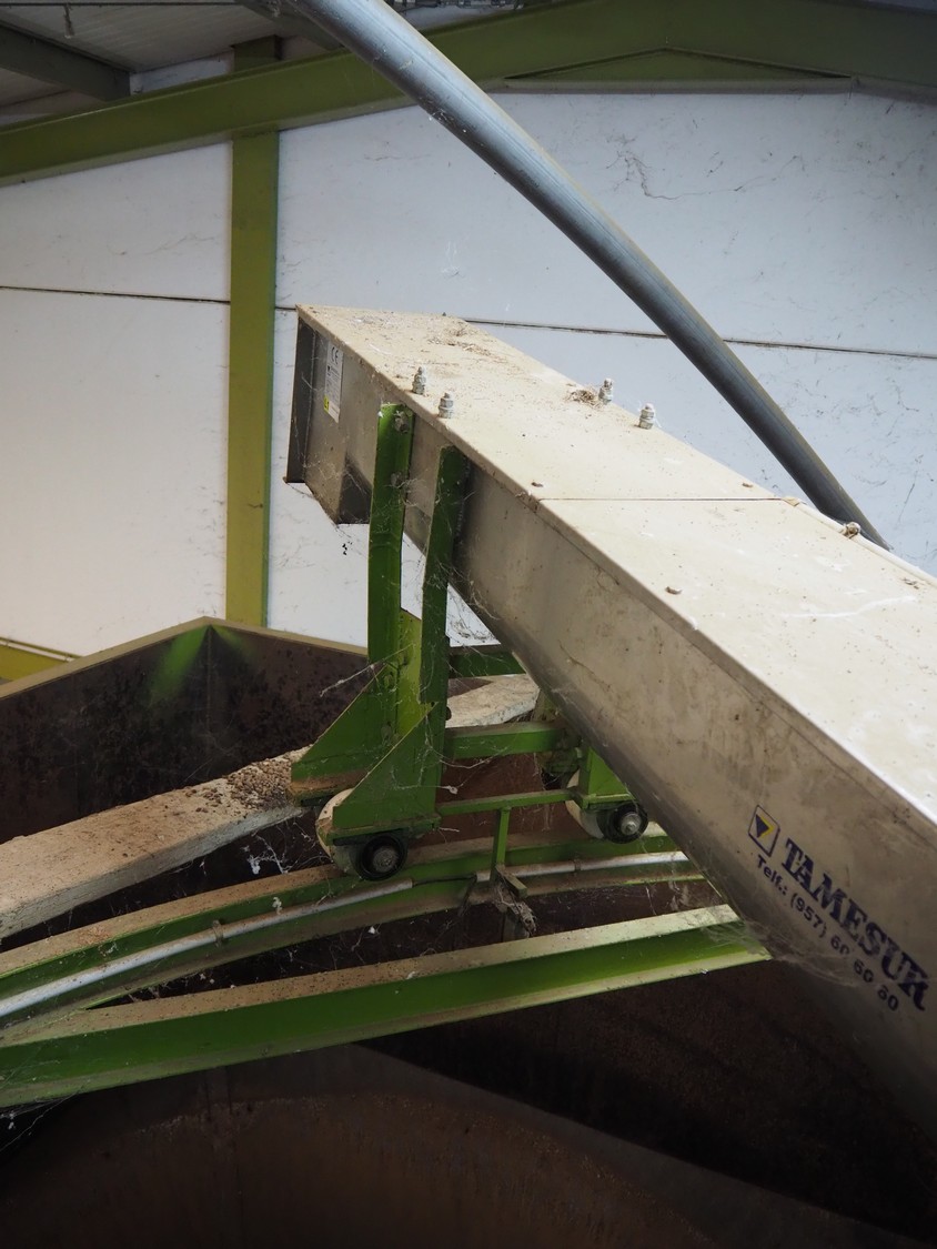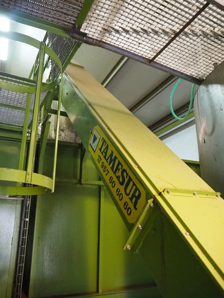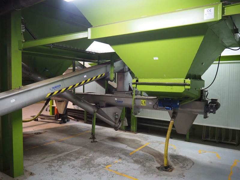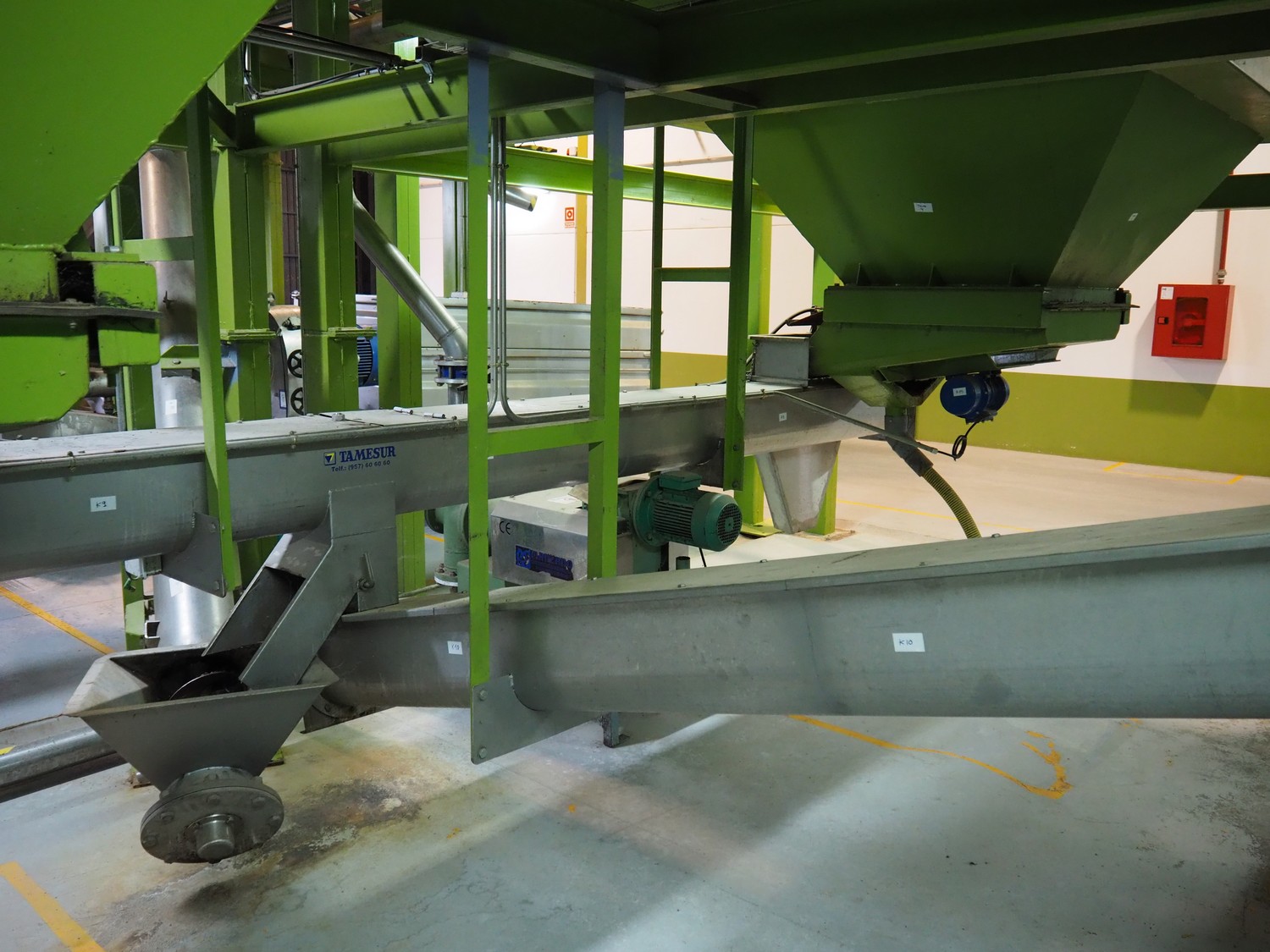 Tamesur S.A. bunker installation with cleaning system used for olive pits consisting of: Tamesur S.A. steel infeed bunker, dimensions: 3375 mm x 4950 mm x 4000 mm, Tamesur S.A. elevating screw, model: ELV2, number: 952, year of construction: 2011, 380 V, 5.5 kW, elevating height: 7600 mm, total dimensions: 12000 mm x 800 mm x 8000 mm, Tamesur S.A. transport screw, diameter screw: 220 mm, tier: 200 mm, dimensions: 3100 mm x 400 mm x 1100 mm, 4 steel Tamesur S.A. bunkers with outfeed screws, model: (4x) TO4420, year of construction: (4x) 2012, inside dimensions: (4x) 3800 mm x 3800 mm x 5000 mm, total dimensions: (4x) 3850 mm x 3850 mm x 5500 mm.