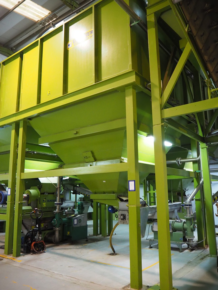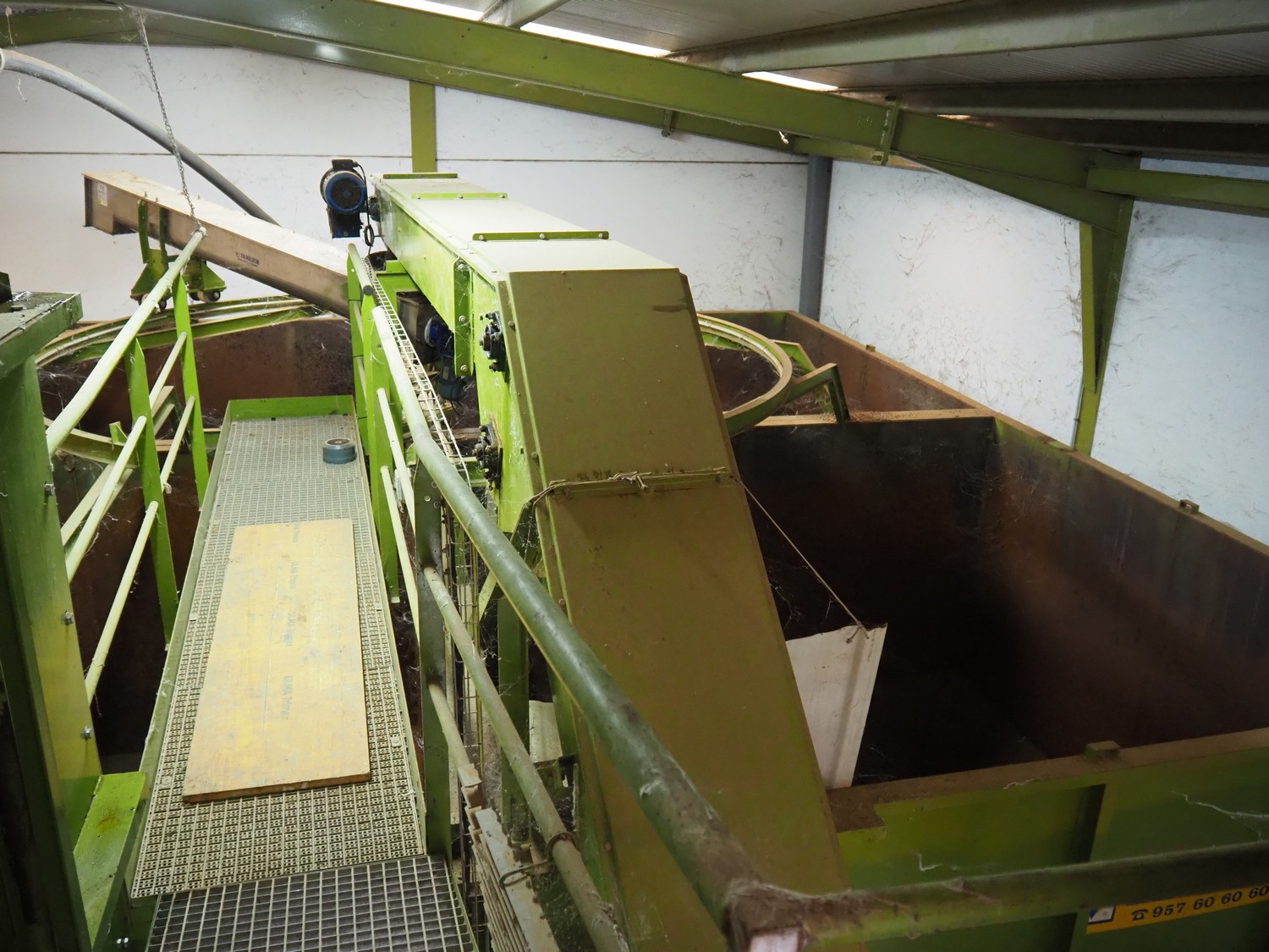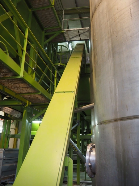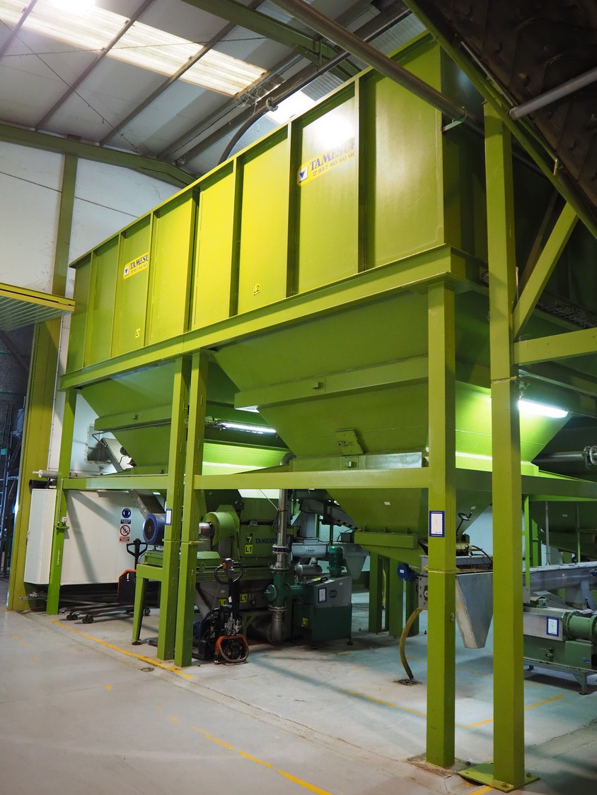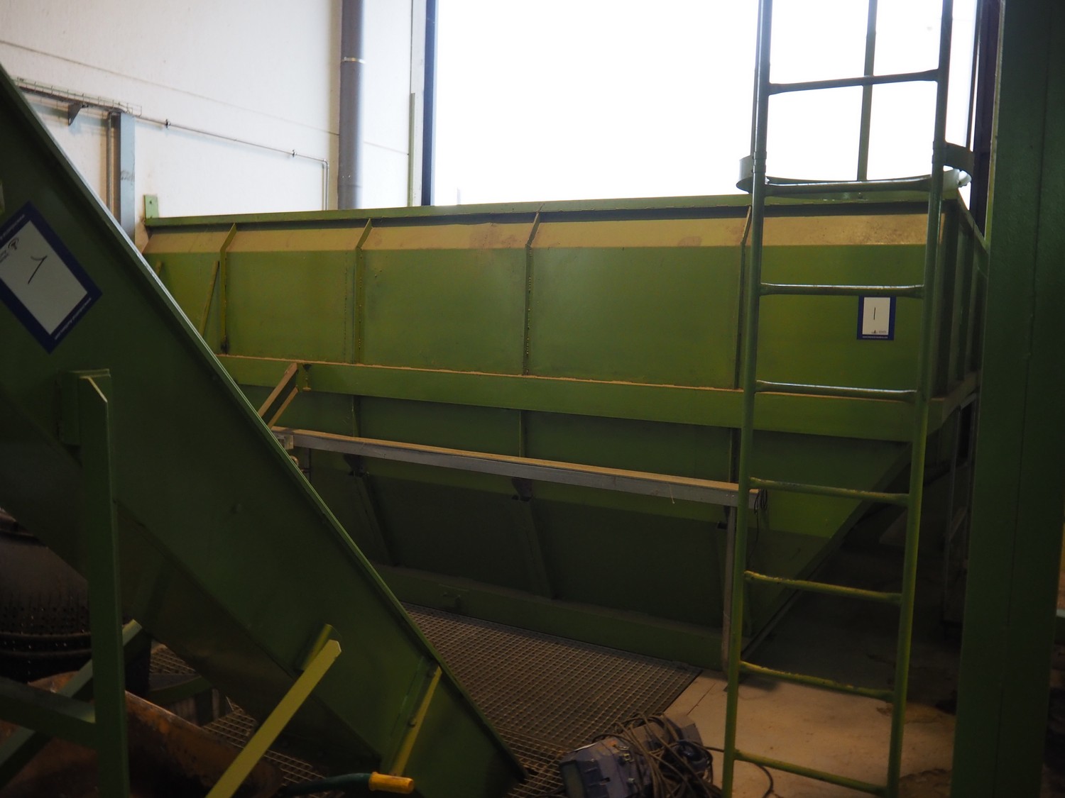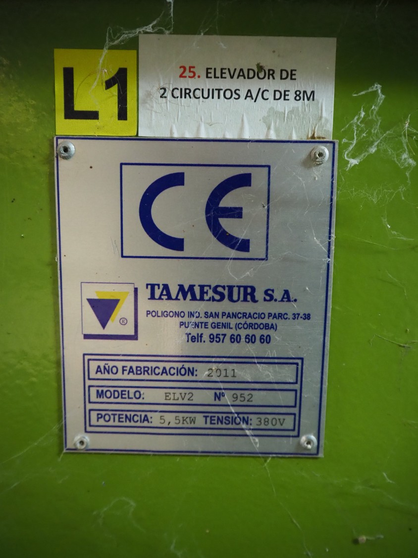 Tamesur S.A. bunker installation with cleaning system used for olive pits consisting of: Tamesur S.A. steel infeed bunker, dimensions: 3375 mm x 4950 mm x 4000 mm, Tamesur S.A. elevating screw, model: ELV2, number: 952, year of construction: 2011, 380 V, 5.5 kW, elevating height: 7600 mm, total dimensions: 12000 mm x 800 mm x 8000 mm, Tamesur S.A. transport screw, diameter screw: 220 mm, tier: 200 mm, dimensions: 3100 mm x 400 mm x 1100 mm, 4 steel Tamesur S.A. bunkers with outfeed screws, model: (4x) TO4420, year of construction: (4x) 2012, inside dimensions: (4x) 3800 mm x 3800 mm x 5000 mm, total dimensions: (4x) 3850 mm x 3850 mm x 5500 mm.