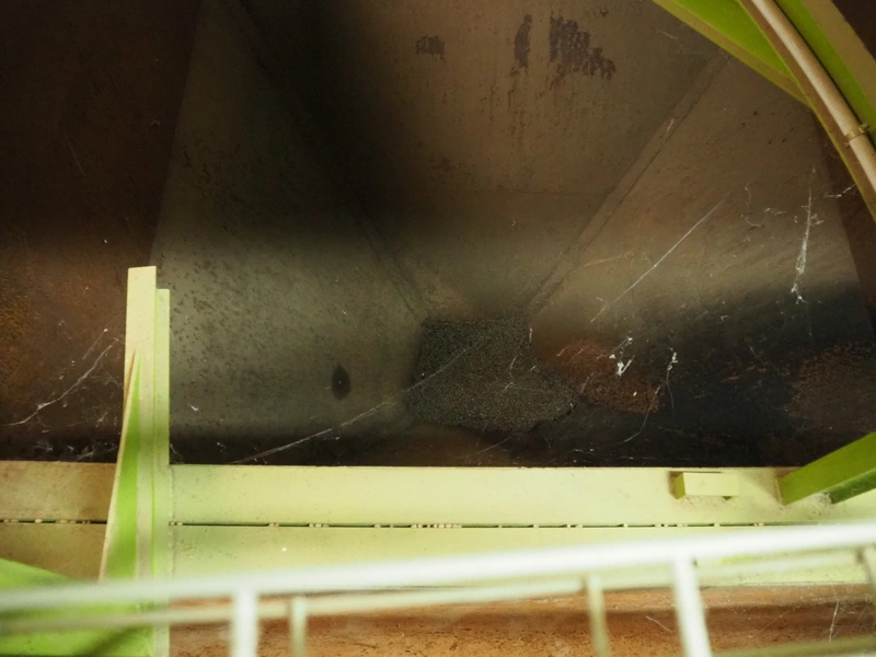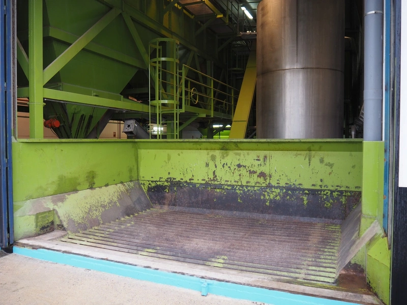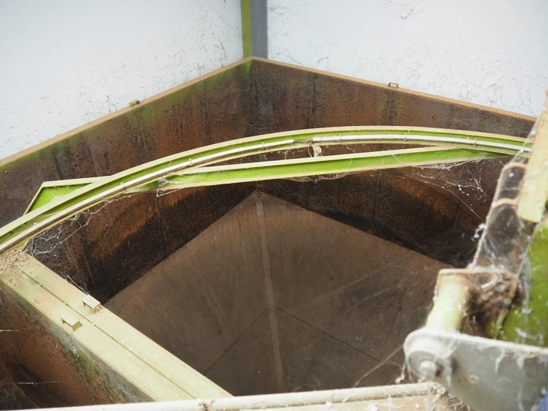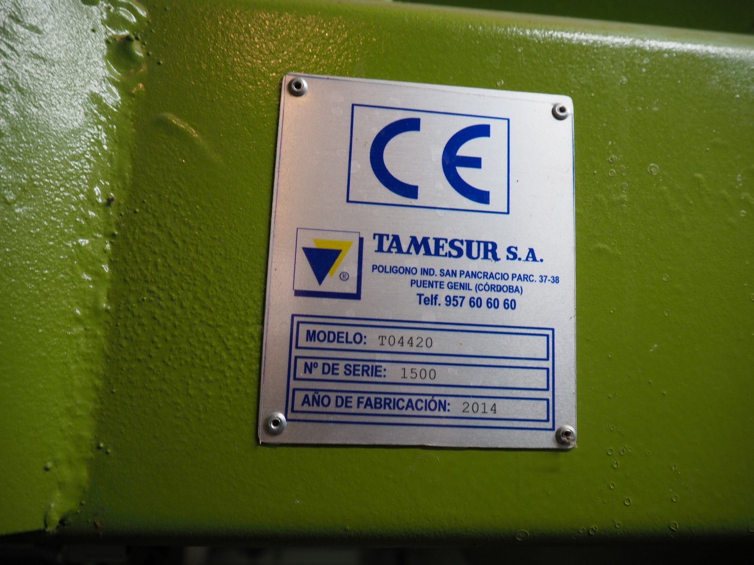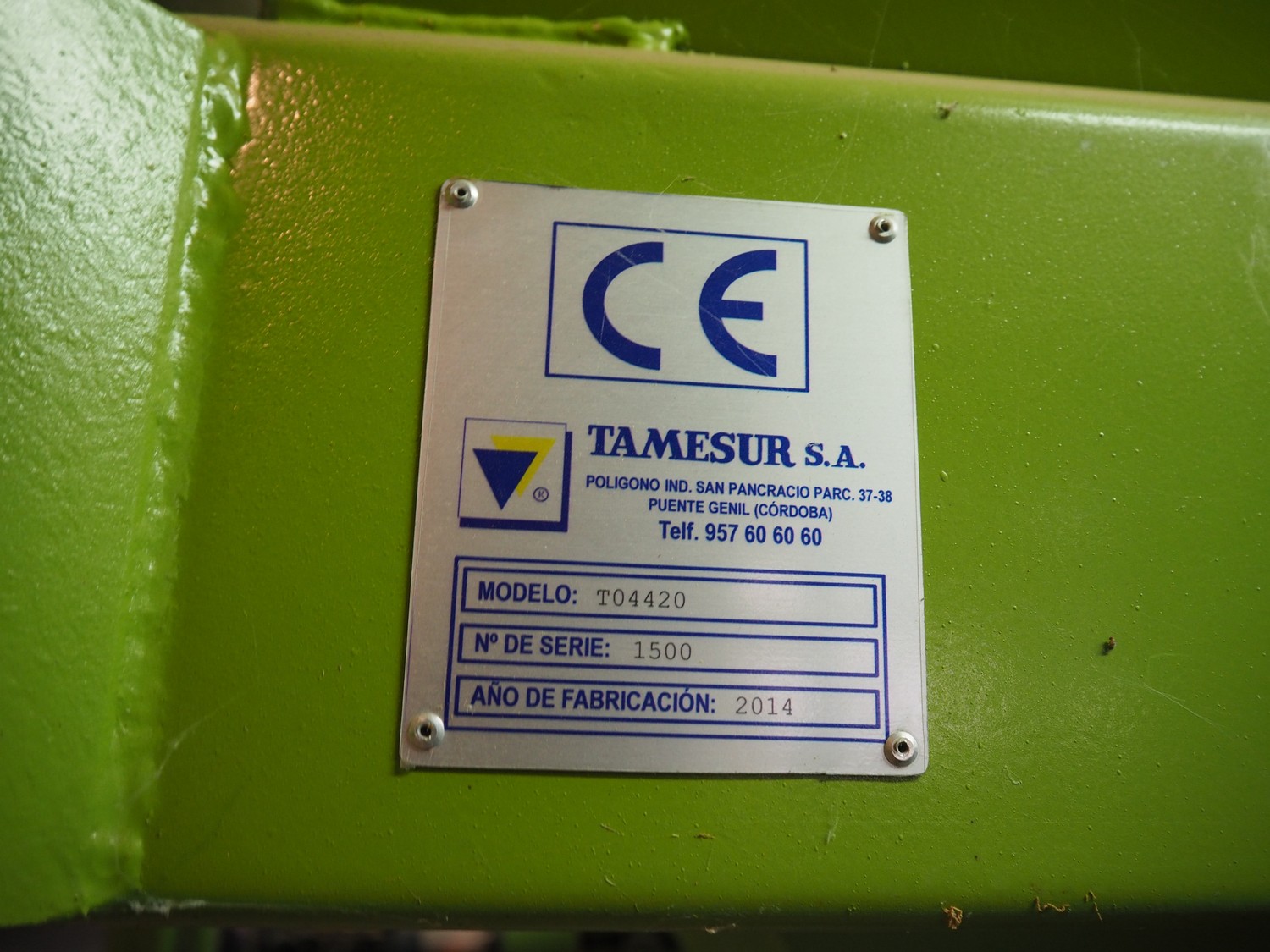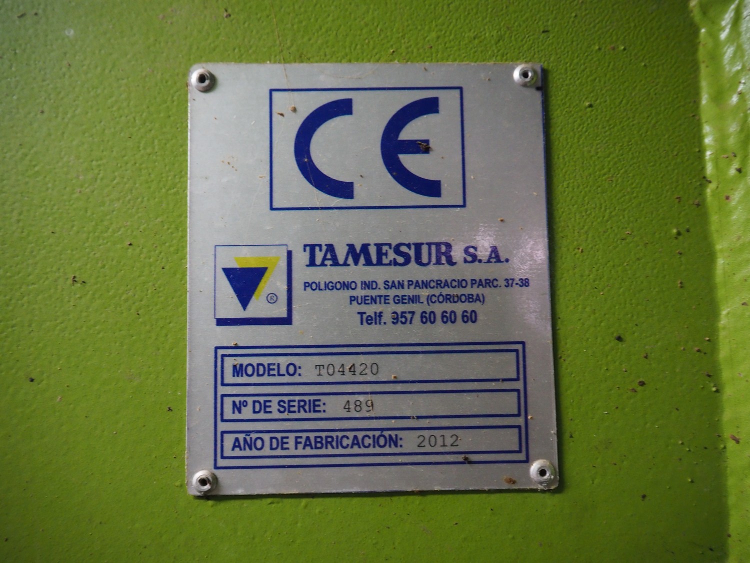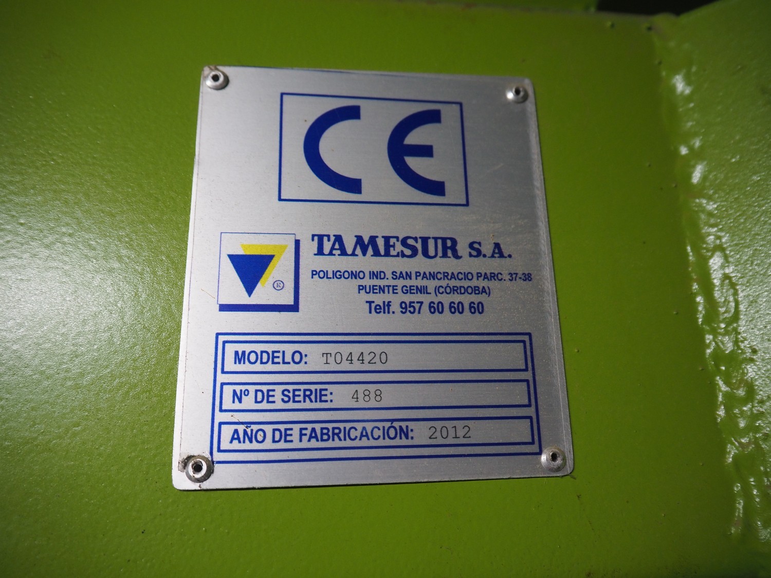 Tamesur S.A. bunker installation with cleaning system used for olive pits consisting of: Tamesur S.A. steel infeed bunker, dimensions: 3375 mm x 4950 mm x 4000 mm, Tamesur S.A. elevating screw, model: ELV2, number: 952, year of construction: 2011, 380 V, 5.5 kW, elevating height: 7600 mm, total dimensions: 12000 mm x 800 mm x 8000 mm, Tamesur S.A. transport screw, diameter screw: 220 mm, tier: 200 mm, dimensions: 3100 mm x 400 mm x 1100 mm, 4 steel Tamesur S.A. bunkers with outfeed screws, model: (4x) TO4420, year of construction: (4x) 2012, inside dimensions: (4x) 3800 mm x 3800 mm x 5000 mm, total dimensions: (4x) 3850 mm x 3850 mm x 5500 mm.