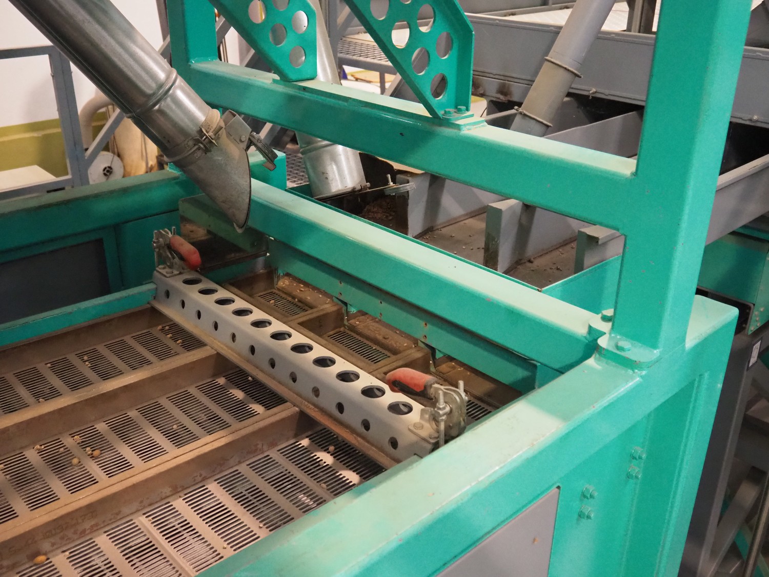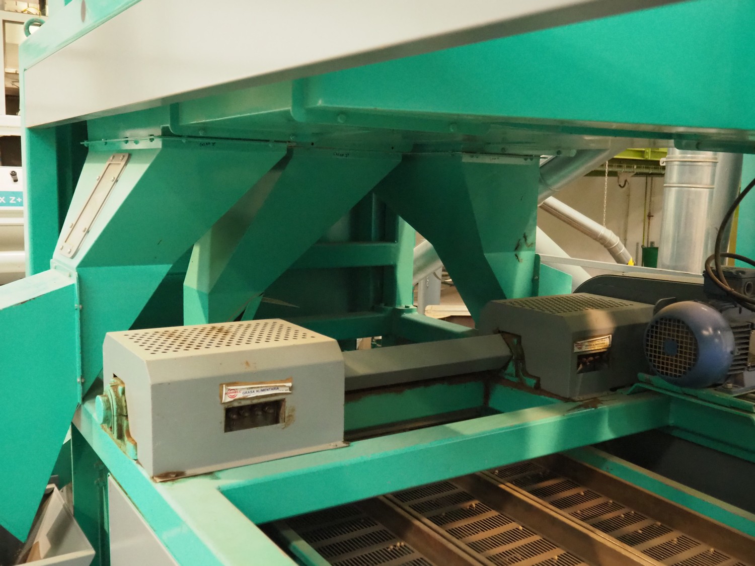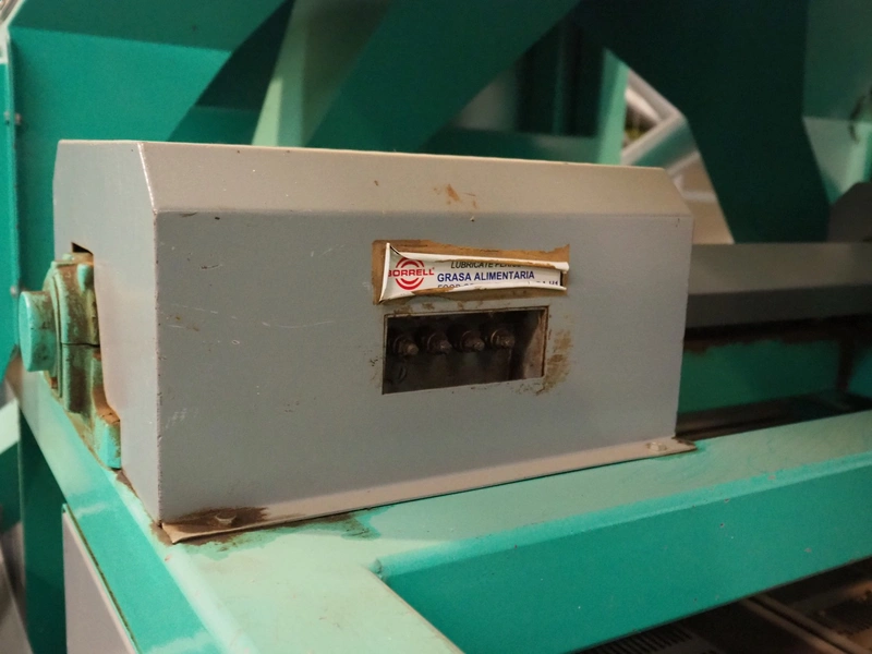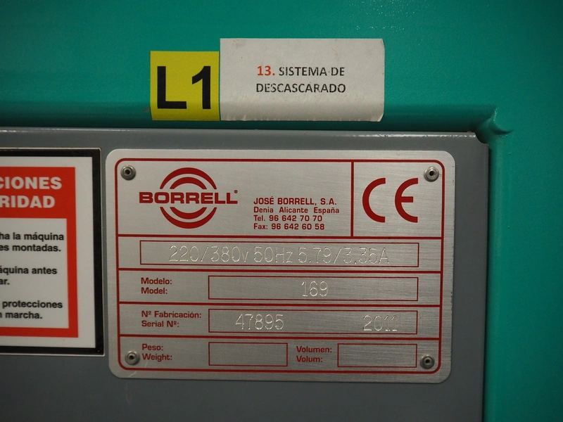 José Borrell S.A. hull and pit separating sieve, model: 169, serial number: 47895, year of construction: 2011, 220/380 V, 50 Hz, 5.79/3.35 A, steel belt, belt width: (3x) 220 mm, total dimensions: 3900 mm x 1700 mm x 2200 mm, 2 outfeed gutters, dimensions: (2x) 3050 mm x 500 mm x 950 mm.