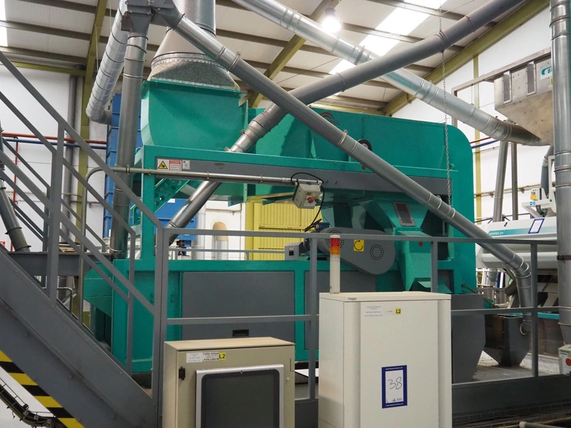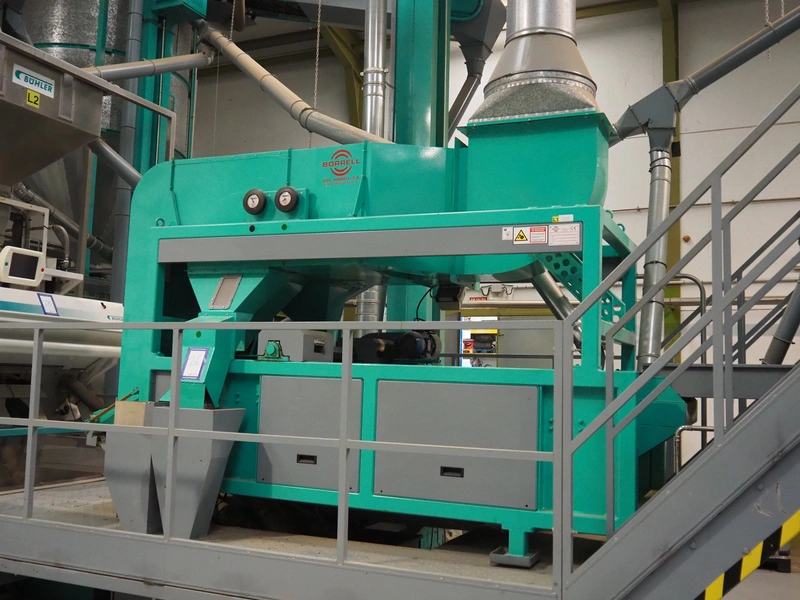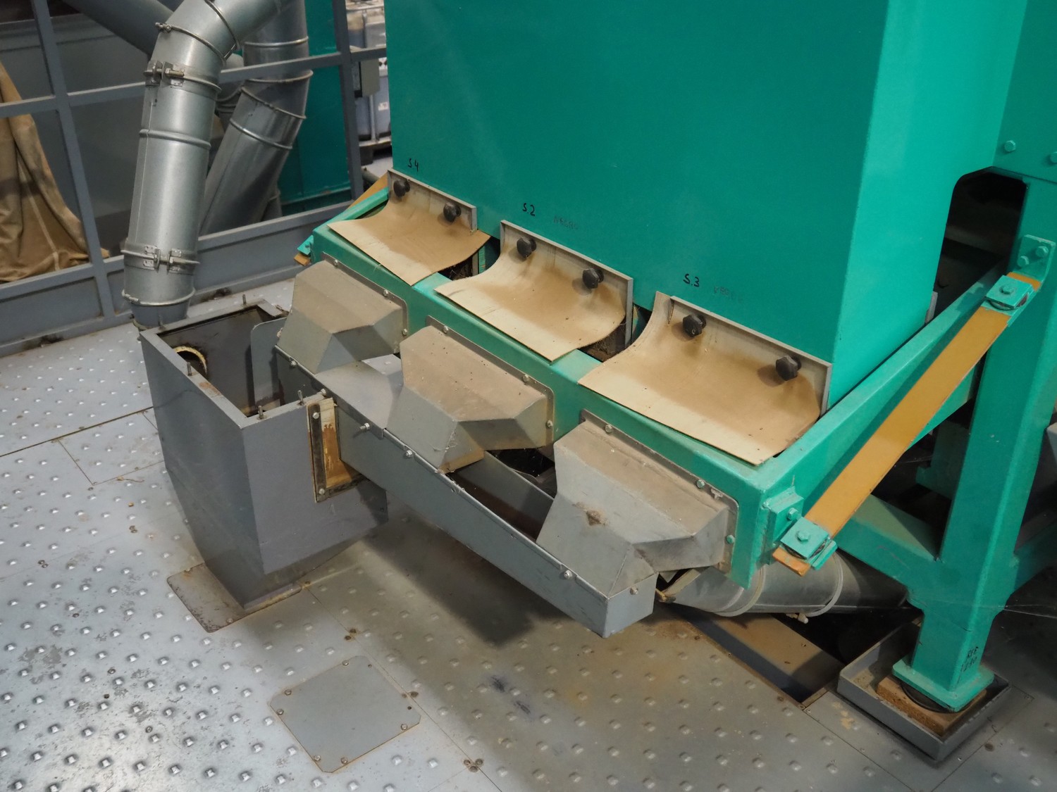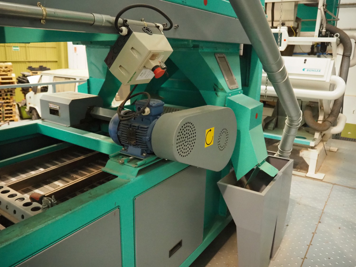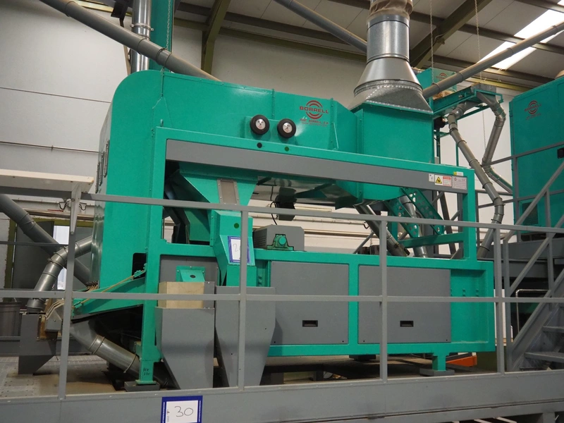 José Borrell S.A. hull and pit separating sieve, model: 169, serial number: 47895, year of construction: 2011, 220/380 V, 50 Hz, 5.79/3.35 A, steel belt, belt width: (3x) 220 mm, total dimensions: 3900 mm x 1700 mm x 2200 mm, 2 outfeed gutters, dimensions: (2x) 3050 mm x 500 mm x 950 mm.
