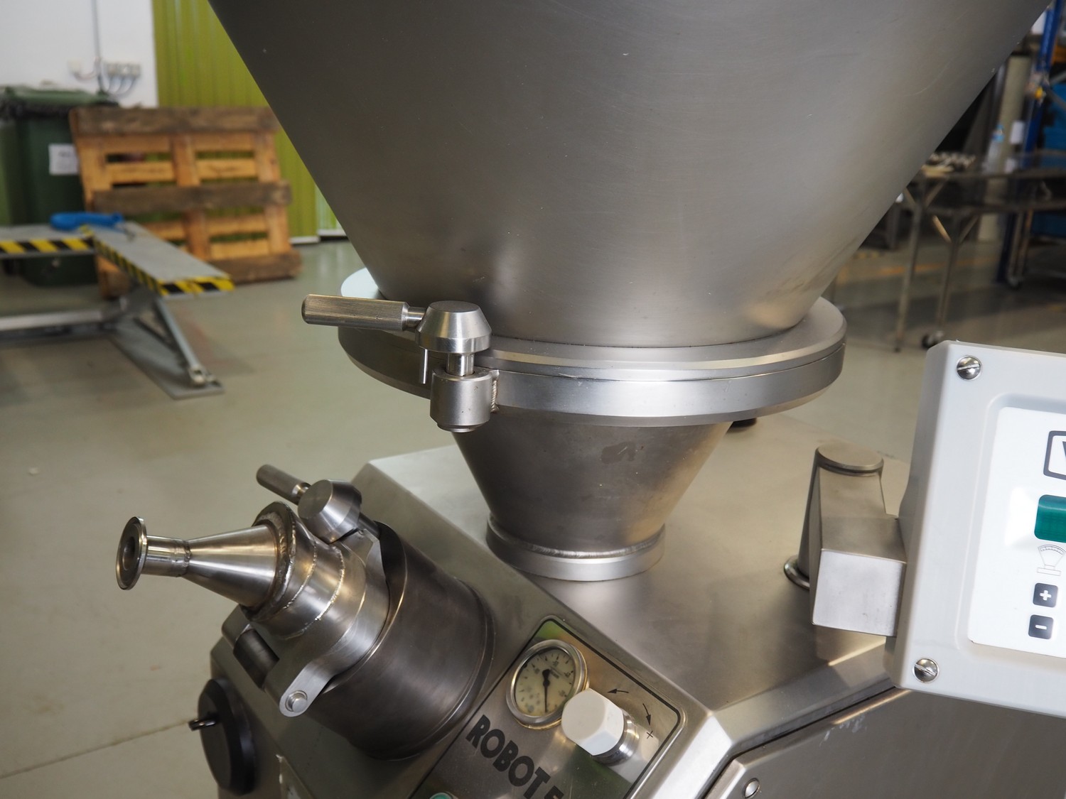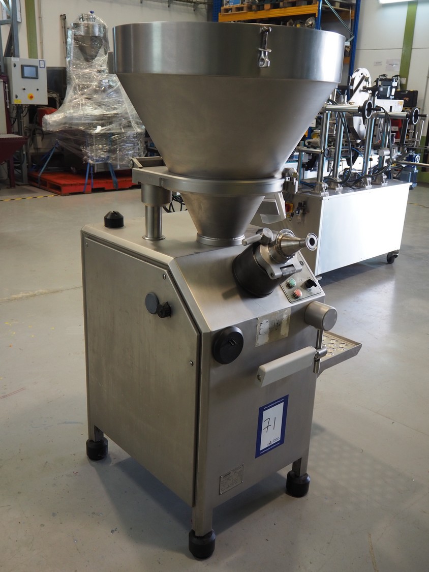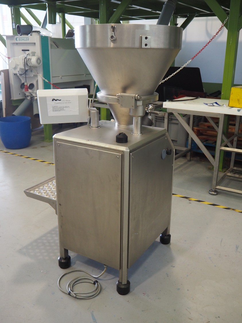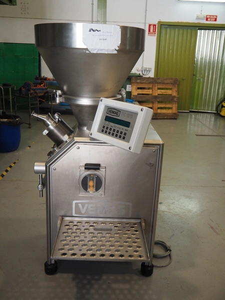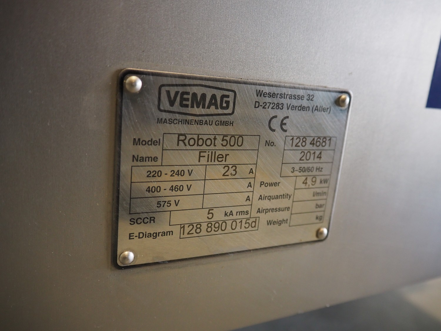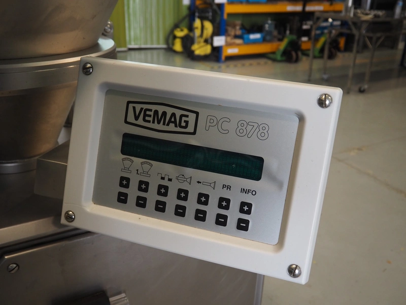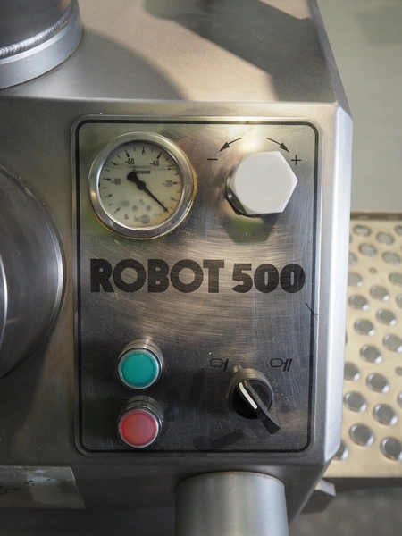 Vemag vacuum filling machine, type: Robot 500, number: 128 4681, year of construction: 2014, 220-240 V, 3 Ph, 50/60 Hz, 23 A, 4.9 kW, dimensions: 700 mm x 560 mm x 1600 mm.