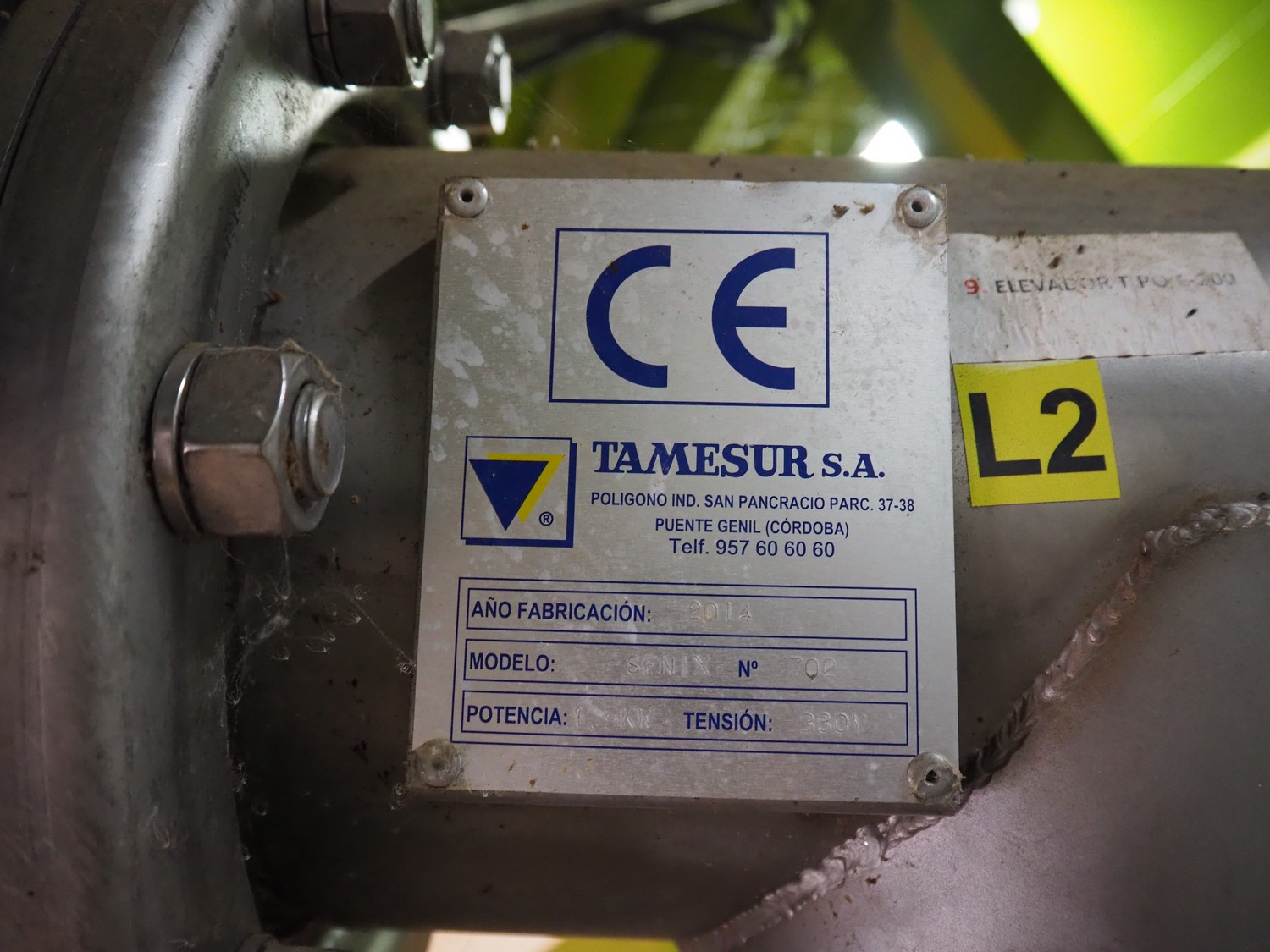 Tamesur S.A. elevating screw, model: SFNIX, number: 702, year of construction: 2014, 380 V, 1.5 kW, diameter screw: 230 mm, tier: 200 mm, elevating height: 2200 mm, total dimensions: 3500 mm x 600 mm x 2600 mm.