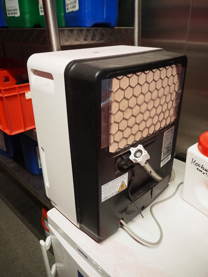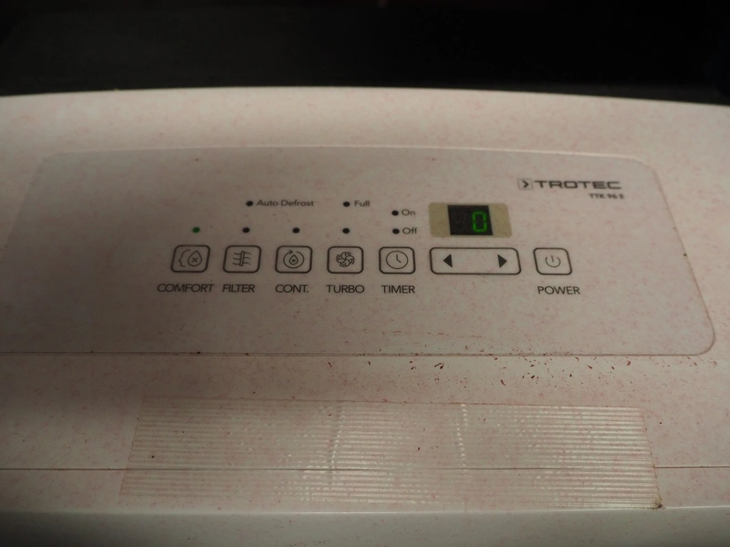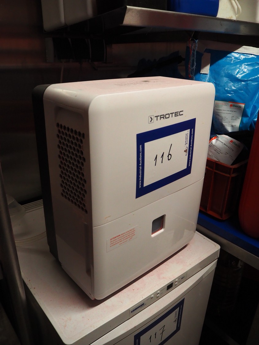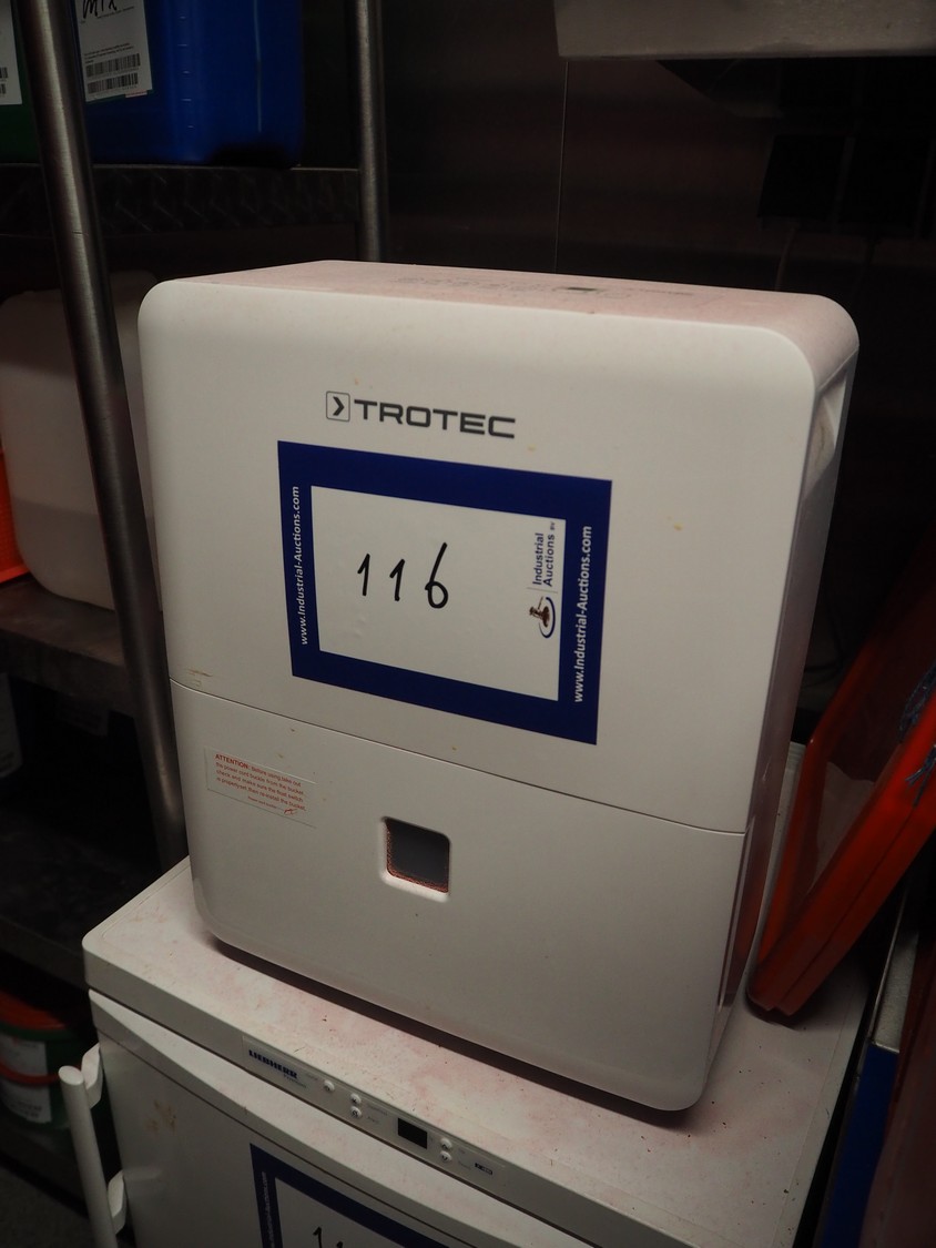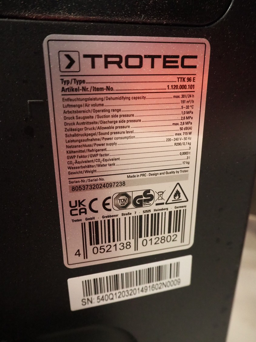 Trotec dryer, type: TTK 96 E, item number: 1.120.000.101. 220-240 V, 50 Hz, dehumidifying capacity: maximum 30 liter / 24 hours, air volume: 191 m³, operating range: 5 - 32˚C, suction side pressure: 1.0 MPa, allowable pressure: 2.6 MPa, water tank: 3 liter, weight: 17 kg, dimensions: 400 mm x 250 mm x 520 mm.