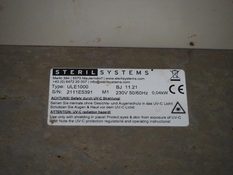 Steril Systems ambient air disinfection unit, type: ULE1000, serial number: 2111E5391, year of construction: 2021, 230 V, 50/60 Hz, 0.04 kW, dimensions: 1000 mm x 130 mm x 170 mm.