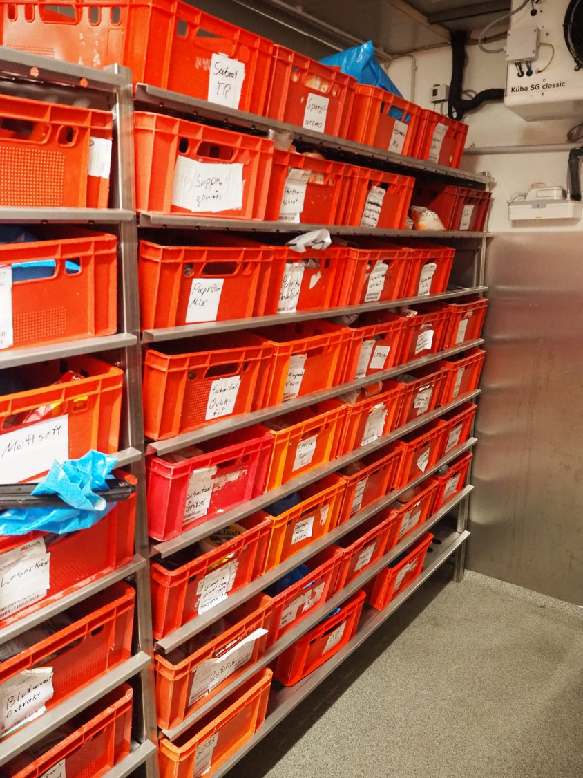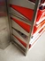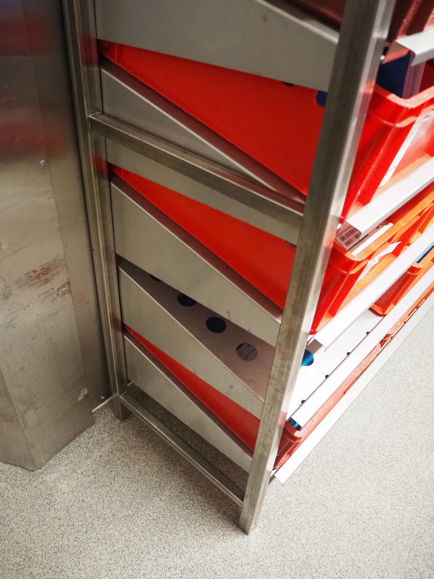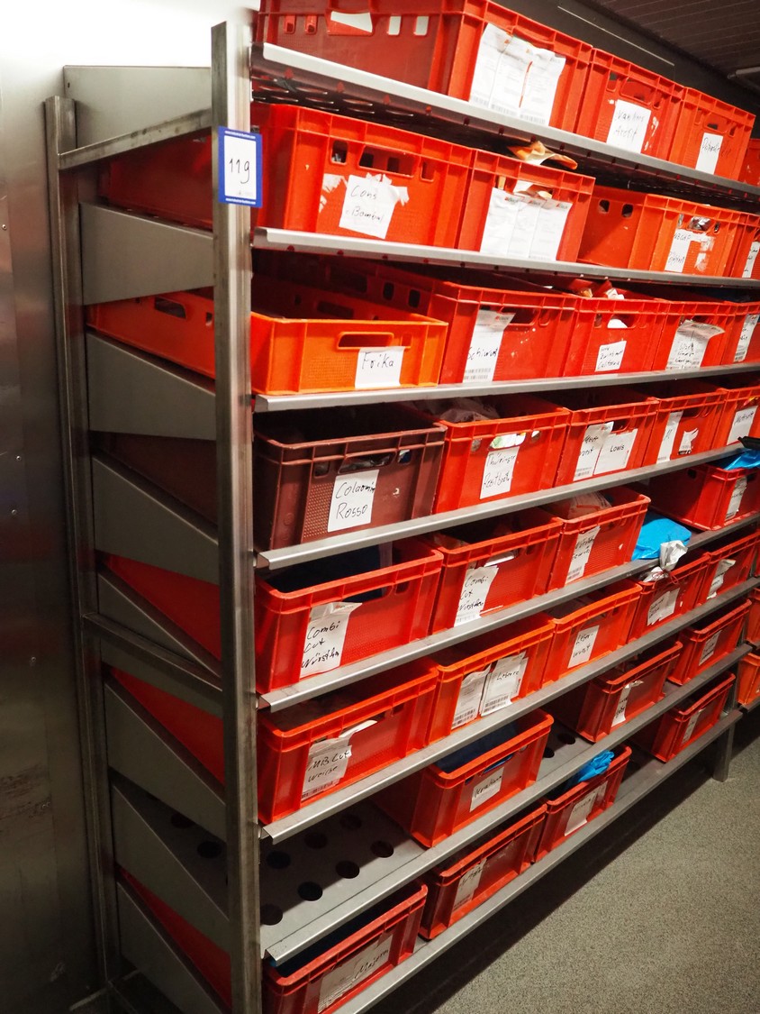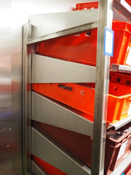 S/s storage rack for E2-crates, 8 floors, total dimensions: 4200 mm x 620 mm x 2000 mm. Rack can complete dismantled. Without content.