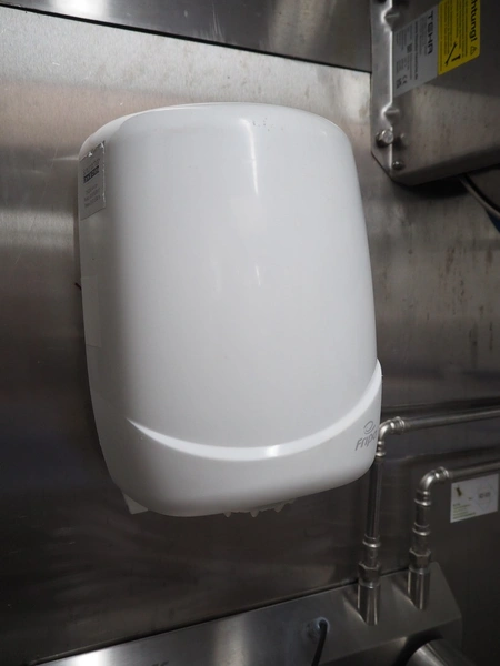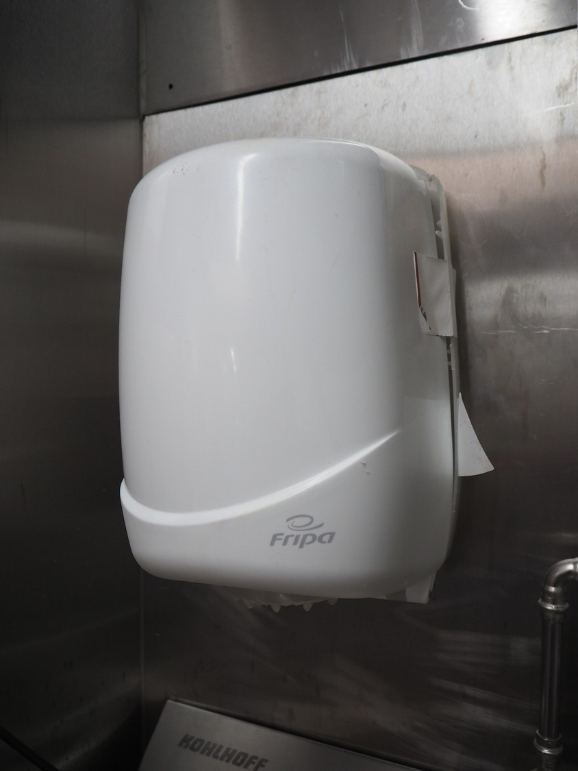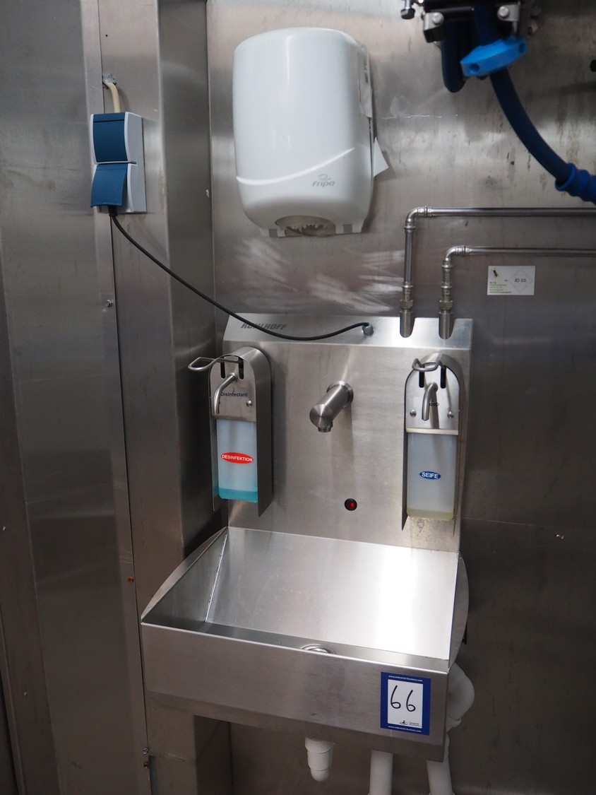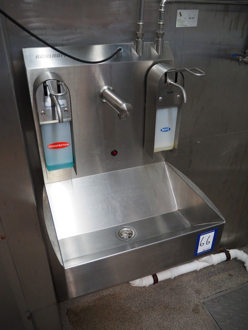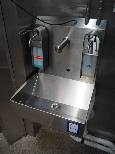 Kohlhoff s/s sink with 1 faucet, sensor control, 2 s/s soap dispensers, dimensions sink: 550 mm x 450 mm x 700 mm, Fripa plastic paper dispenser.