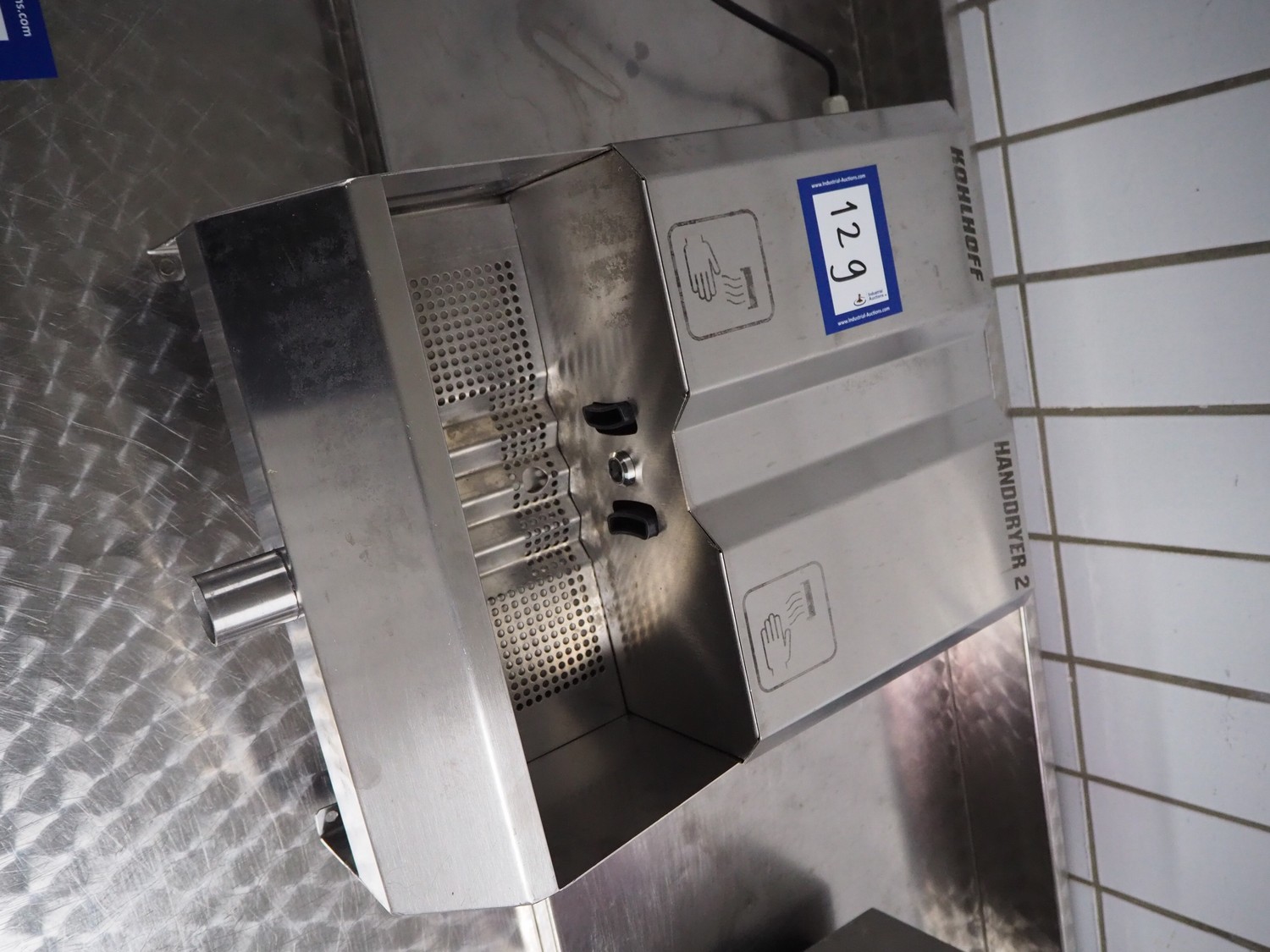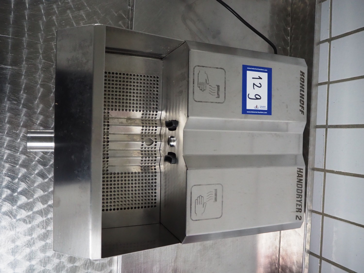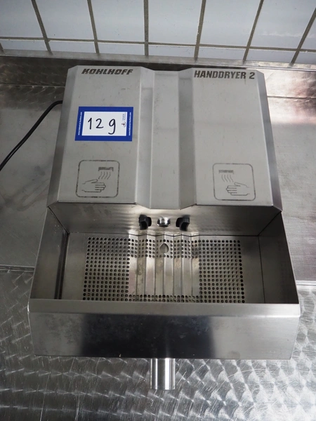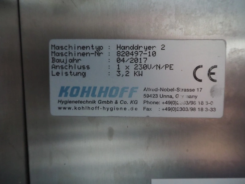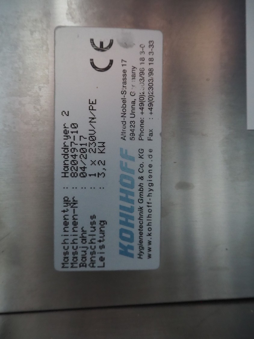 Kohlhoff hand dryer, machine type: Handdryer 2, machine number: 820497-10, year of construction: 2017, 1 x 230 V, 3.2 kW, dimensions: 400 mm x 220 mm x 700 mm.