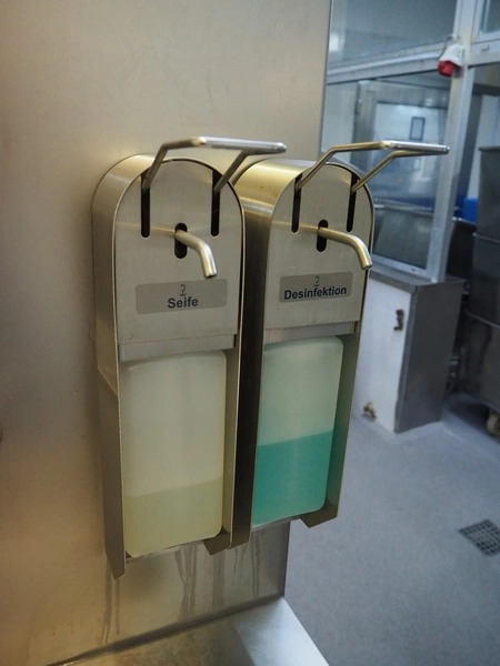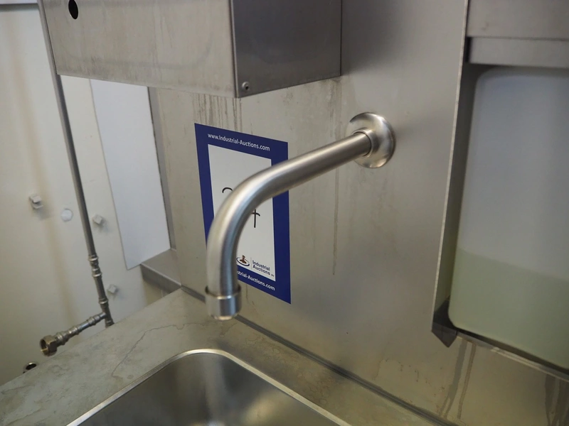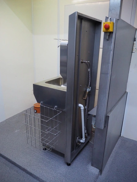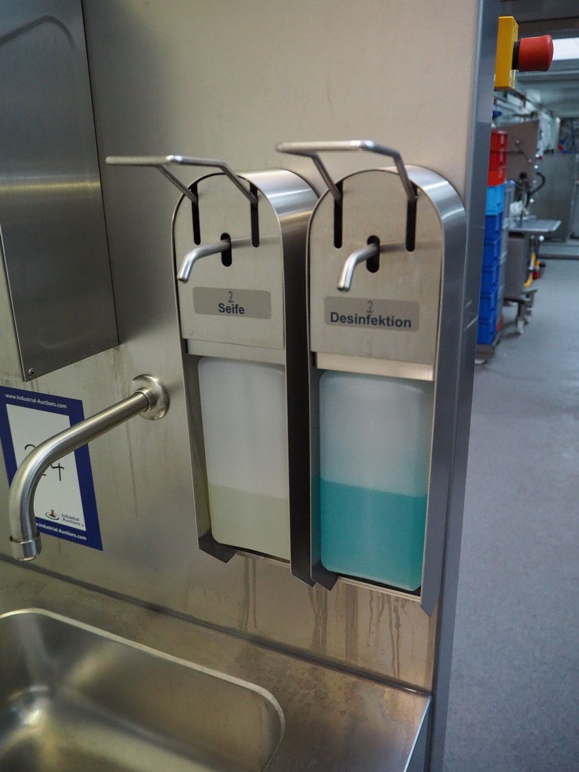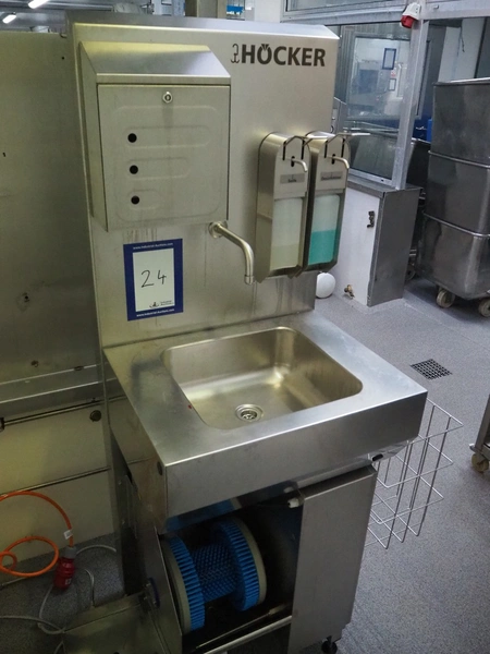 Hӧcker hygiene station consisting of sole cleaner, s/s sink with 1 faucet, paper dispenser, 2 soap dispenser and waste bin, serial number: 24-26-002, year of construction: 2024, 400 V, 3 Ph, 50-60 Hz, 300 W, dimensions: 1100 mm x 600 mm x 1700 mm.