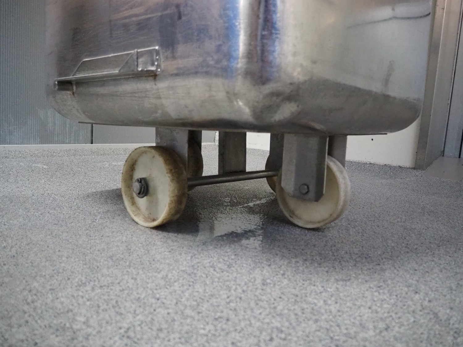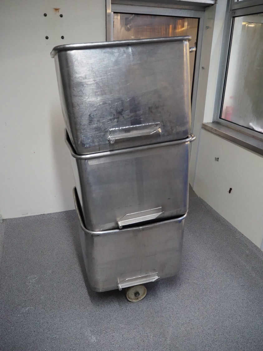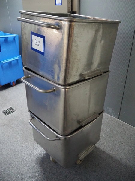3 s/s meat bins, volume: 200 liter, dimensions: (3x) 760 mm x 760 mm x 700 mm.