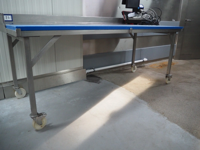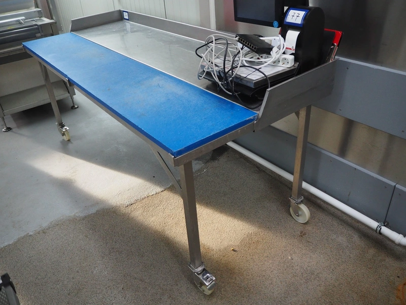 S/s mobile table with plastic worktop, dimensions worktops: (2x) 1100 mm x 400 mm, total dimensions: 2200 mm x 930 mm x 890 mm.