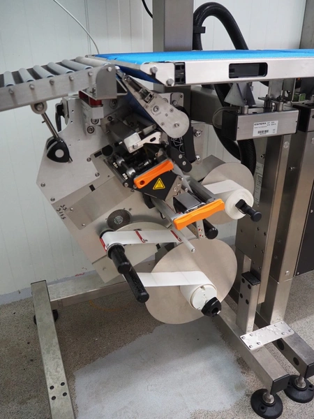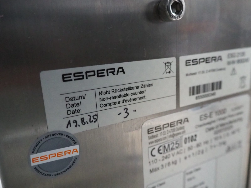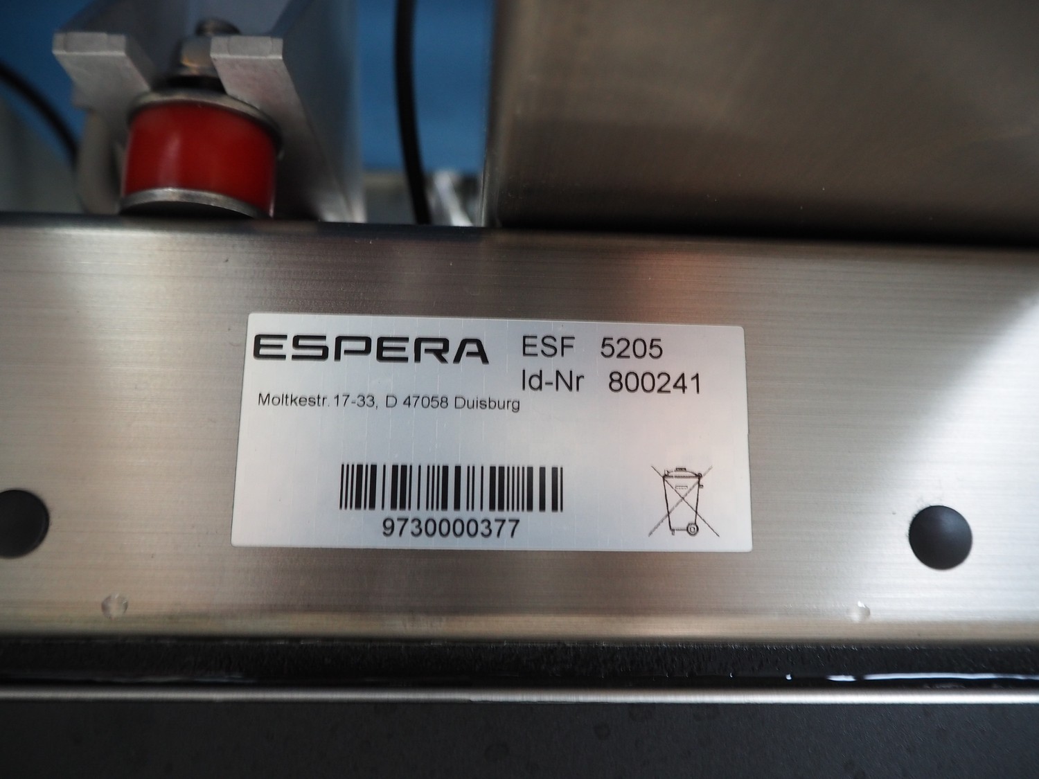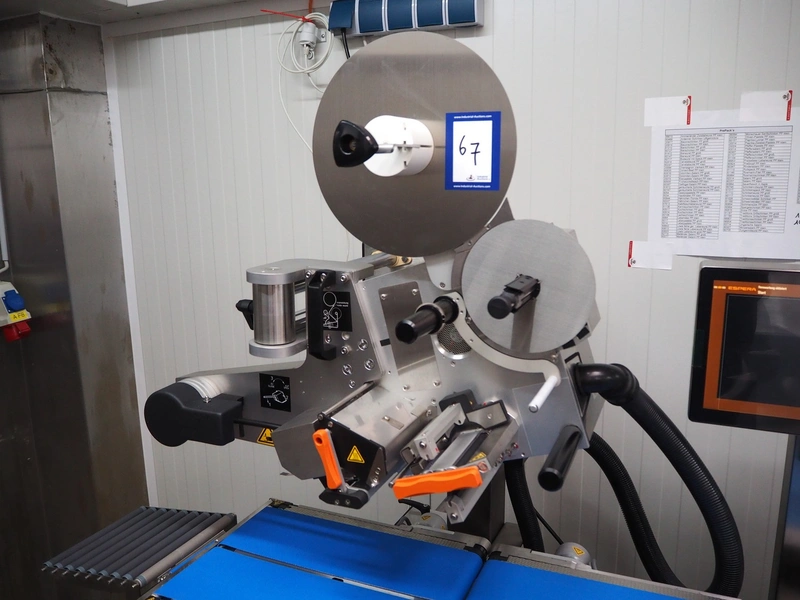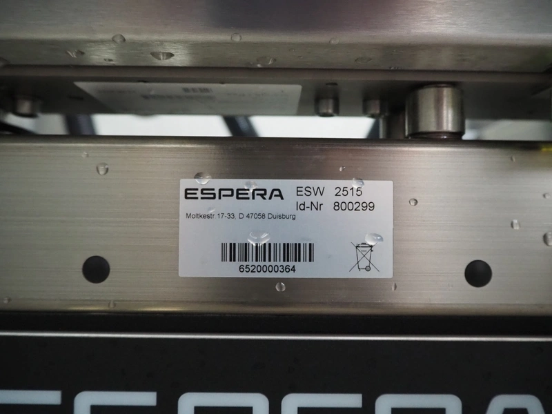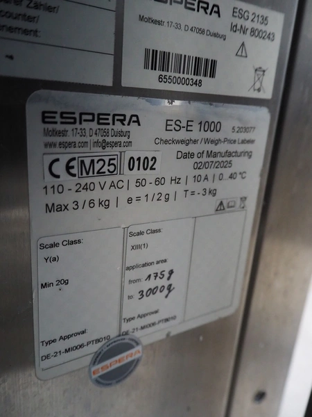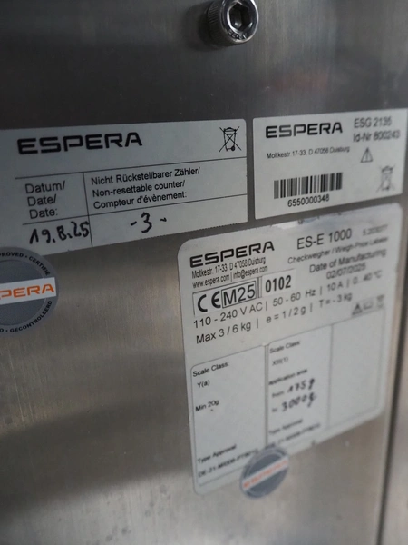 Espera weighing and labelling machine with bottom and top taper, model: ES-B, model checkweigher: ES-E 1000, year of construction: 2025, 110 - 240 V, 50 - 60 Hz, 10 A, maximum: 3 / 6 kg, e: 1/2 gram, plastic belt, belt width: (2x) 145 mm, total dimensions: 2100 mm x 900 mm x 1850 mm.